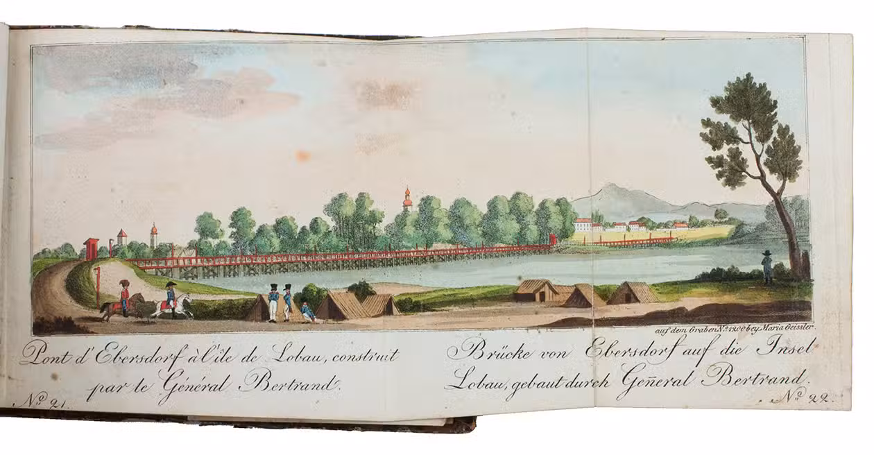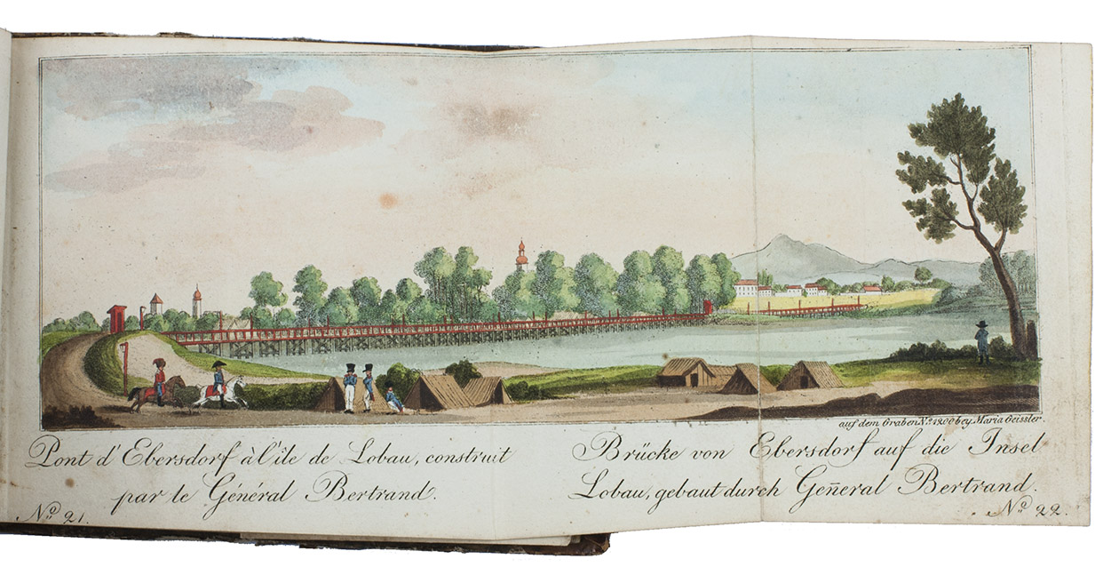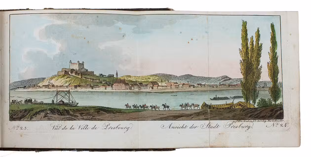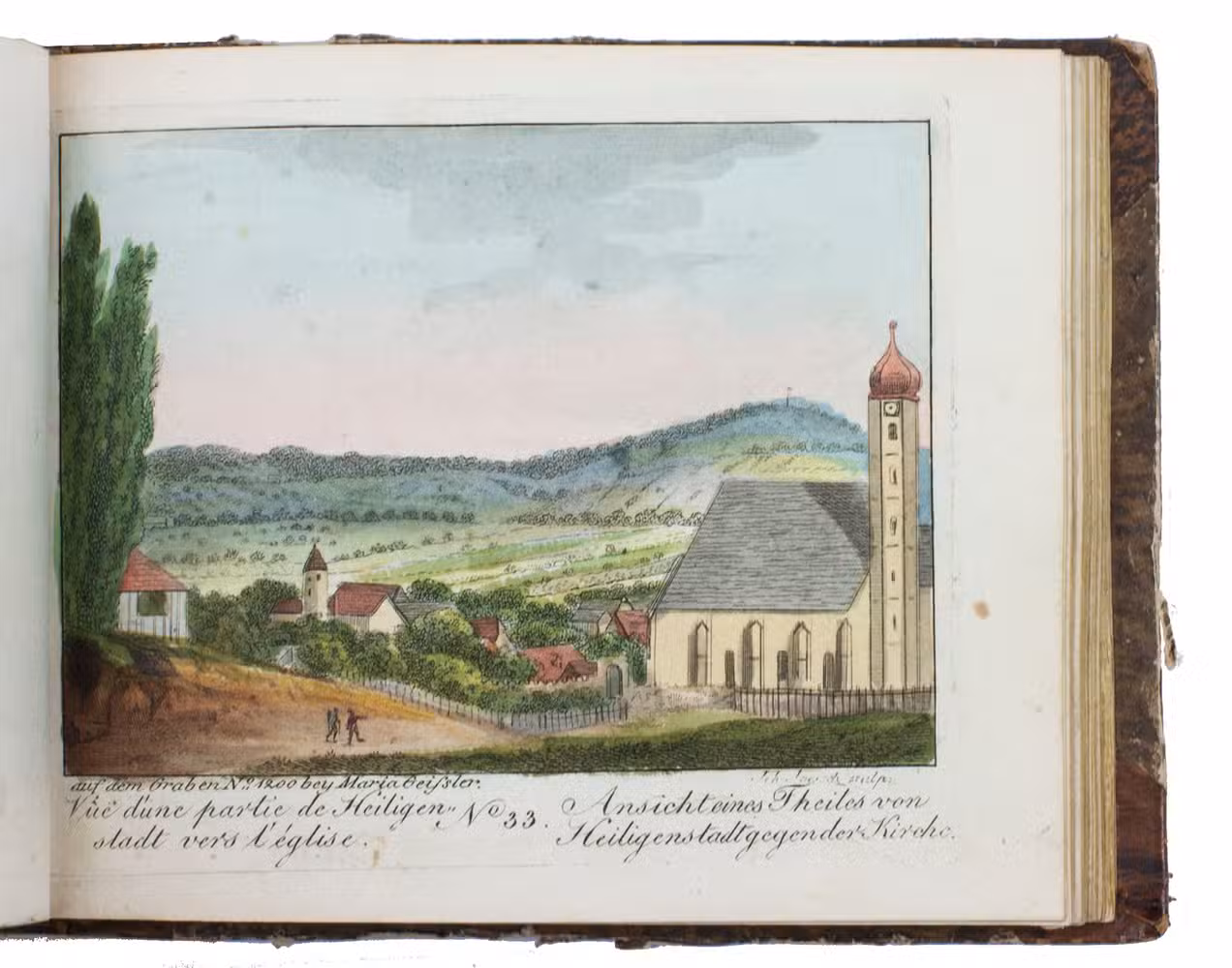 A series of charming views of Vienna and its environs in the middle of Beethoven's thirty-five years there, around the time Wagner was born there, and about eight years after it became the capital of the new Austrian Empire, including views of Baden, Klosterneuburg, Bratislava and other neighbouring sites, all attractively and artistically coloured by a contemporary hand. It shows palaces, castles and ruins, churches, chapels and the Vienna cathedral, gardens and pavilions, city streets and squares, the spa at Baden, Christoph de Bach's Circus Gymnasticus, the lavish Apollo Saal, views along the Danube and more. The famous streets, squares, buildings and interiors appear bustling with fashionable ladies and gentlemen, pedestrians and horse-drawn carriages, and the river full of boats. Four views are signed by the artist, Josef Eisner (1788-1861), and about a third by the engraver, mostly Johann Jaresch (but two by Johann Boehm (ca. 1770-post 1821), probably as engraver). All plates are captioned in French and German, and numbered in the centre.