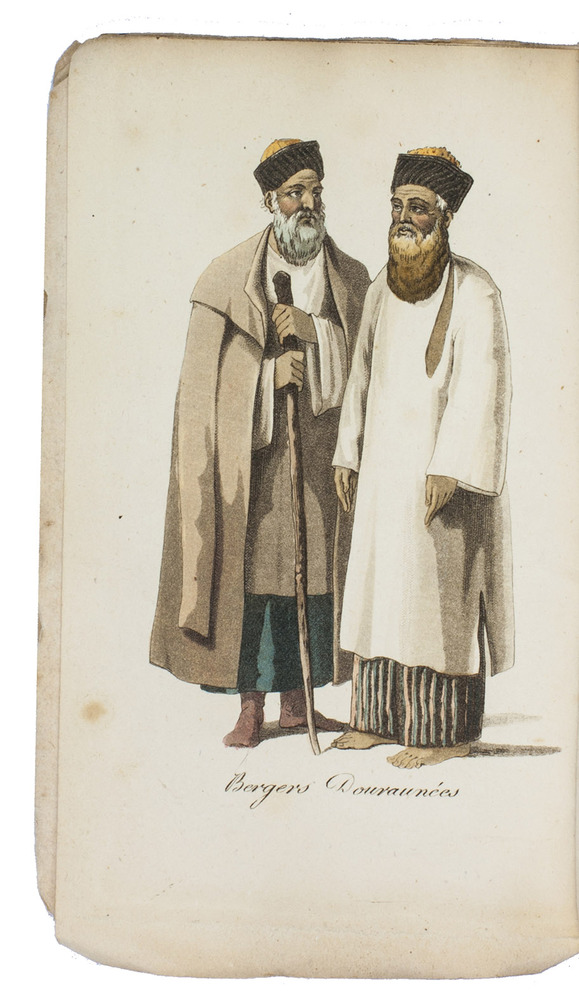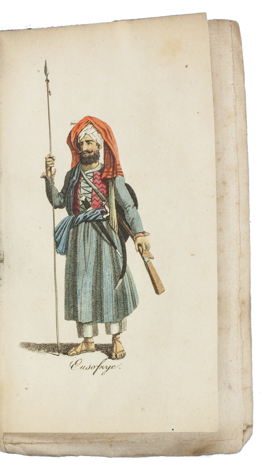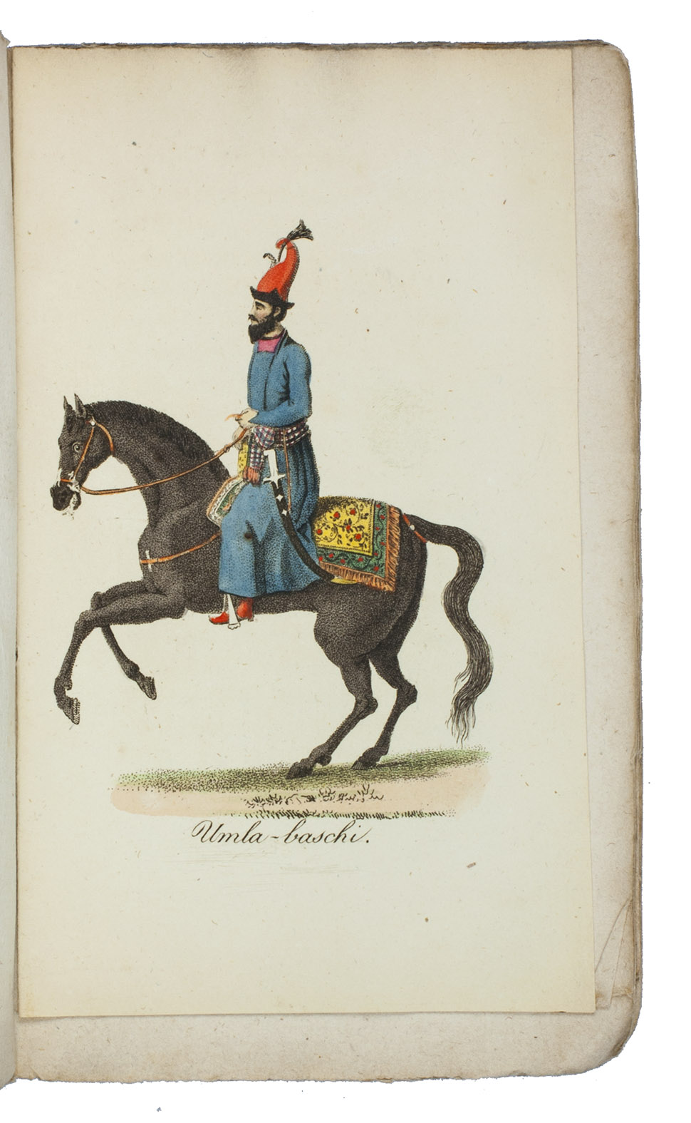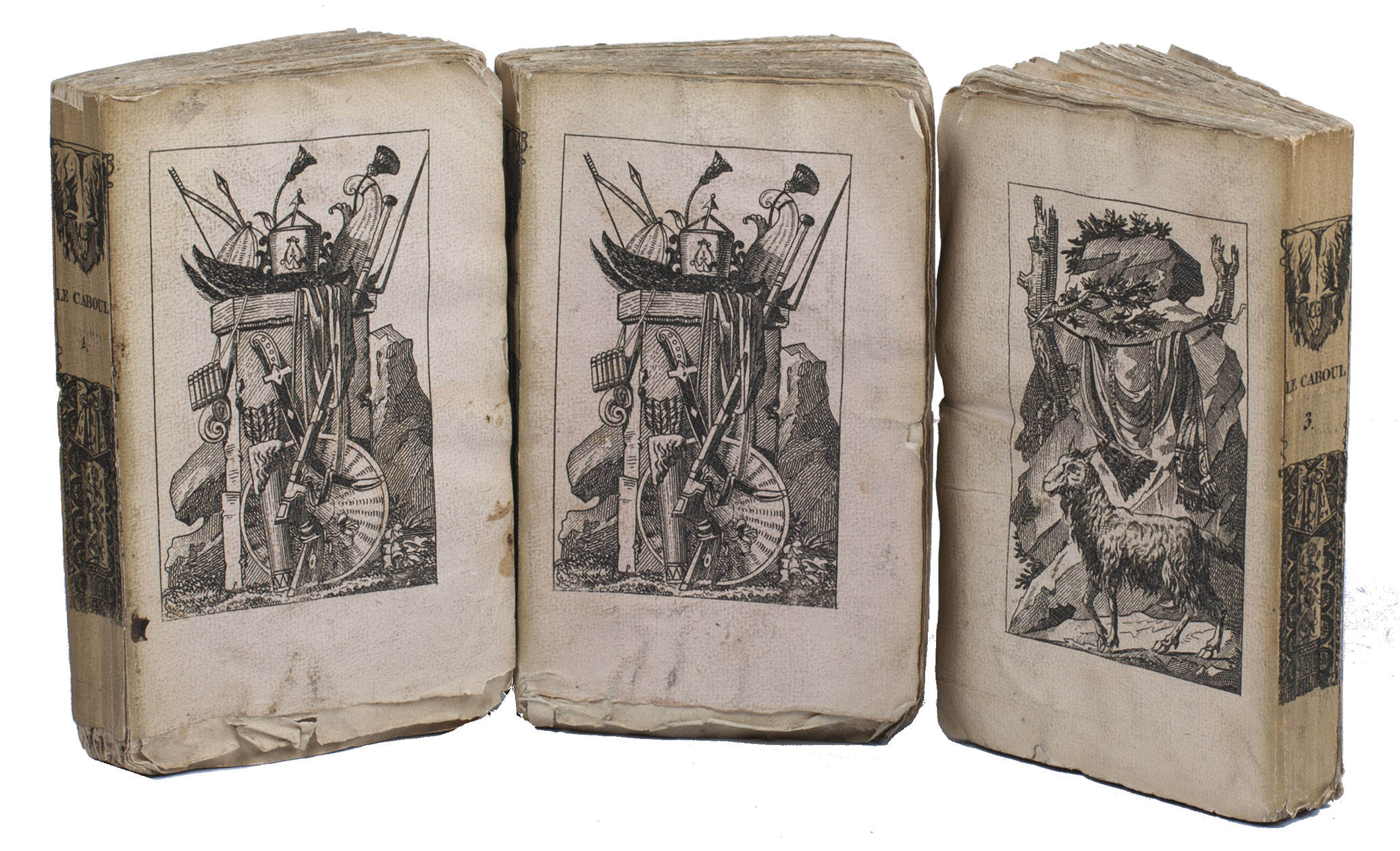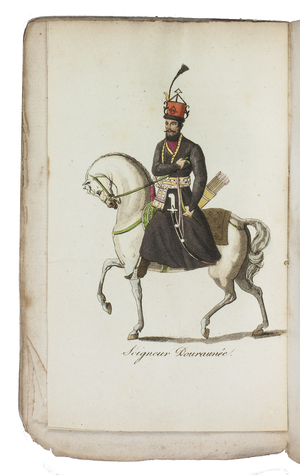 Paris, Nepveu, 1817. 3 volumes. 18mo. With 14 engraved plates depicting various costumes, lords on horseback, etc., all beautifully coloured by hand. Original publisher's printed wrappers, each volume with wood engraved illustrations on front, back and spine. Preserved in a modern gold-tooled green morocco box. XLIV, 189 [3]; [4], 222, [2]; [4], 223 [1] pp.