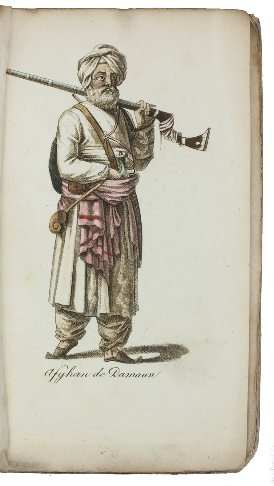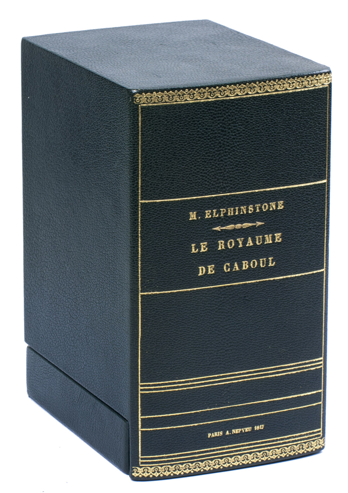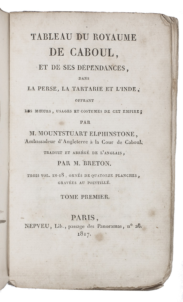 First edition of the French translation of one of the first exhaustive works on the kingdom of Kabul, now known as Afghanistan, and its dependencies in Persia, Tartary and India. First published in English in 1815, it was written by a British official, Mountstuart Elphinstone (1779-1859). Elphinstone was sent to the kingdom of Kabul by the rulers of British India in 1808, to discuss with the Shah the possibilities of a mutual defence against Napoleonic France. Elphinstone, as a consequence, was the first Englishman to visit Peshawar, the traditional winter residence of the rulers of Kabul, which was also the terminus of all trade routes from east to west. The meeting was concluded by a treaty of friendship (7 June 1809), the Shah promising to oppose the passage of foreign troops through his country. Before this could be ratified, however, the Shah was driven off the throne by his brother.