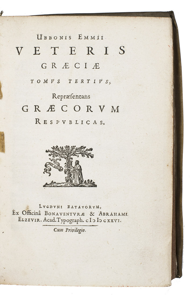 First edition of this highly interesting and original work in three parts on the geography, history and form of government of the Greeks, which Ubbio Emmius (1547-1625) composed during the last years of his life, and which was published posthumously in Leiden in 1626 by the Elzevier brothers with a dedicatory introduction is by his son Wessel.