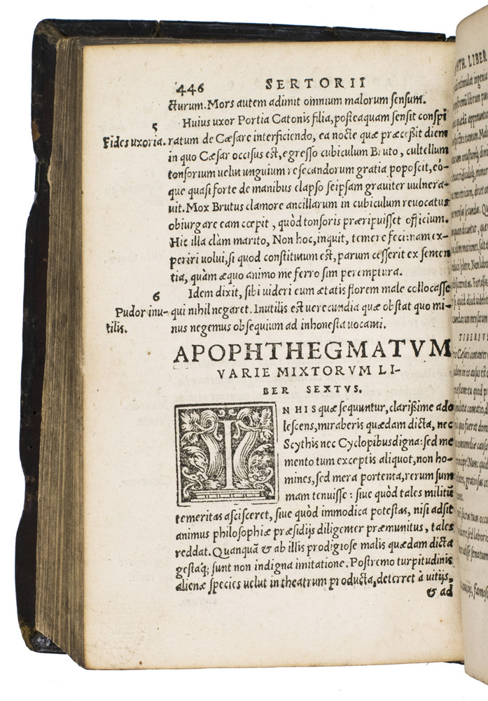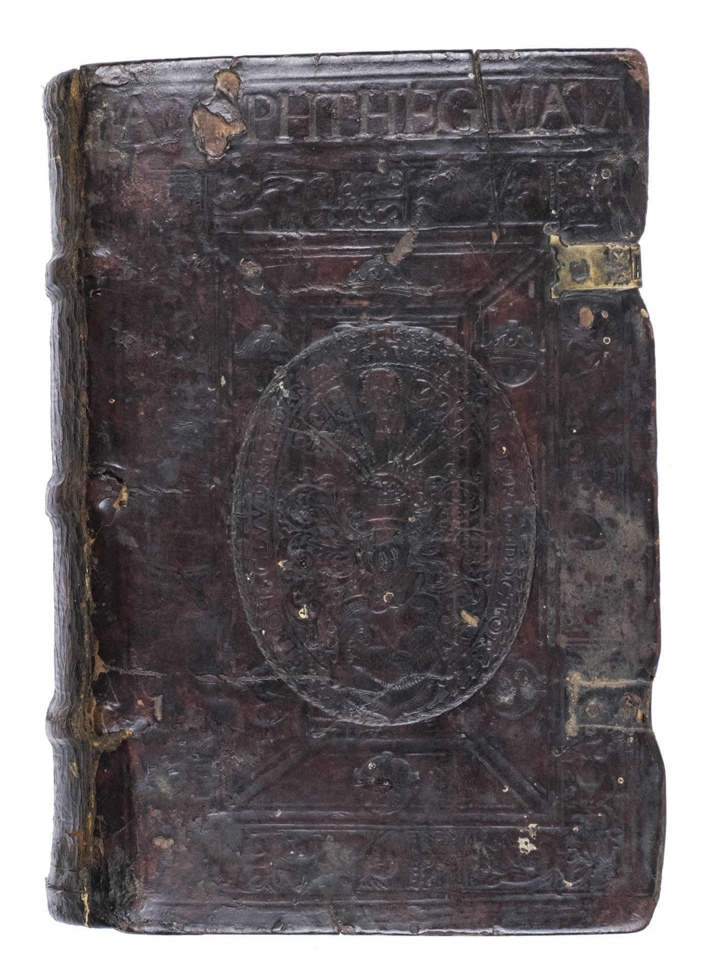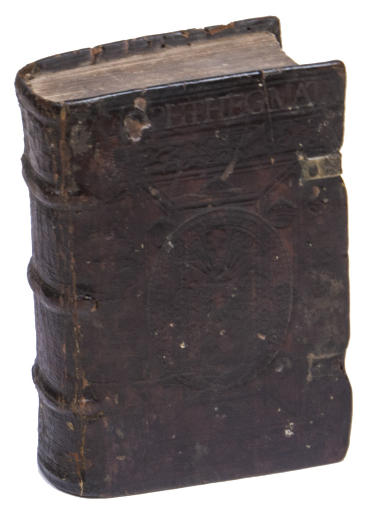 With the large armorial owner's stamp of Simon Clüver (ca. 1540-1598), some of whose books went to Leiden University via his grand nephew, the historical geographer Philipp Clüver (1580-1622). Hulshoff Pol records this stamp on a binding dated 1564, but in the present binding it has been stamped over the existing decoration on the front board, so the binding itself may be older than the owner's stamp. With numerous small stains in the preliminaries, some mostly marginal water stains and a few small marginal worm holes, but otherwise in good condition and only slightly trimmed, retaining an occasional deckle. The owner's stamp has been impressed quite deeply and has therefore been well preserved, but the rest of the binding is worn, with some cuts, tears and gaps, and the surface of the spine flaking. One of the earliest editions of one of Erasmus's most popular and most entertaining works, in a near contemporary, blind-tooled binding. Rotterdam City Library, Cat. Erasmus Collection, p. 22; USTC 635471 (4 copies); VD16, E2039 (same 4 copies); for owners stamp on binding: Hulshoff Pol, The first century of Leiden University Library (1975), p. 414.