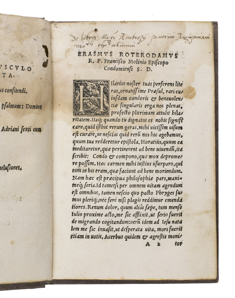 With a contemporary ownership annotation on the title page ("De li[bri] ...(?) Ambrosii Favorini ... (?)") and a slightly later annotation in the head margin of the second leaf ("De libris Mori Ambrosii Favorini Augustiniani Morii Thomae alumni"). The work is somewhat browned, a water stain in the upper third of the page throughout, a few wormholes in the first few leaves, not affecting any text. Otherwise in good condition. Adams E 373; Bezzel 1060; BM STC German p. 282; De Reuck 227; Erasmus Online 2157; USTC 655449; Vander Haeghen I, 104; VD 16 E 2970; cf. Allen, Opus epistlarum Erasmi, vol. V, 1426, 1427, 1310, 1329, 1347 and 1428.