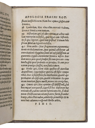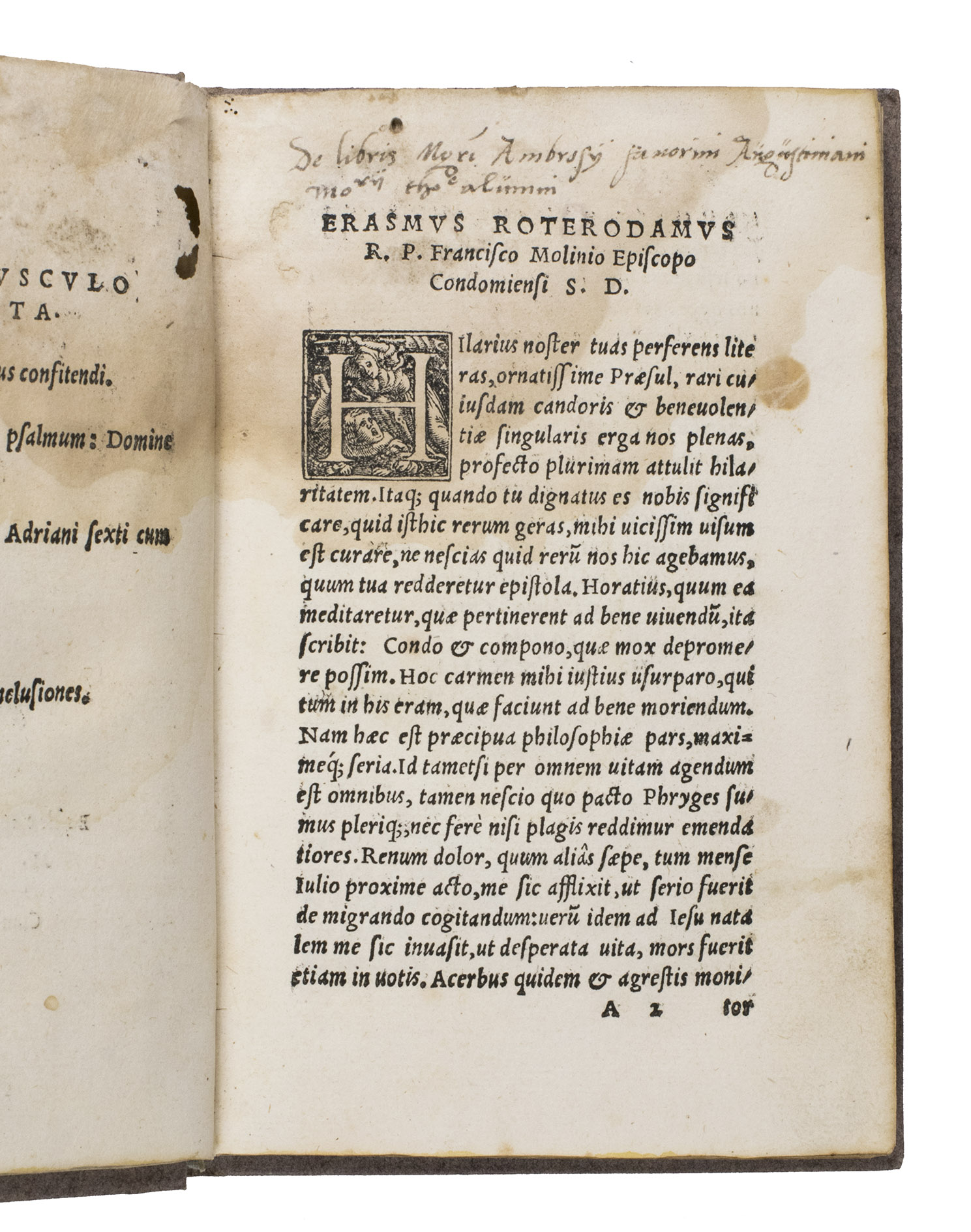 First edition of one of Erasmus' most important treatises on the sacrament of confession. He accepted this sacrament halfway, finding a balance between orthodoxy and the Reformation, and received criticism from both sides because of it. The treatise has been combined with Erasmus short paraphrase on the third Psalm, his letter to Joost Vroye van Gavere (died 1533) concerning sudden death, and an exchange of correspondence with Pope Adrian VI on Erasmus disputes with the Louvain theologians. The final tract concerns Erasmus' ongoing dispute with Diego López de Zúñiga (ca. 1470-1531), who was very critical of Erasmus' New Testament translation. Ten editions of the work appeared in 1524, but the edition by Froben is considered the first. According to Allen, it may have been rushed to be ready in time for the Frankfurt Spring Fair as it contains several misprints, such as "Adirano" instead of "Adriano" on the verso of leaf [40]. The present copy also contains two intriguing provenance descriptions stating that the work came from the library of Ambrosius Favorini. We have not found this name in any of the biographical dictionaries we have been able to consult but the text of the inscription suggests that he was a student of Thomas More, who was a good friend of Erasmus.