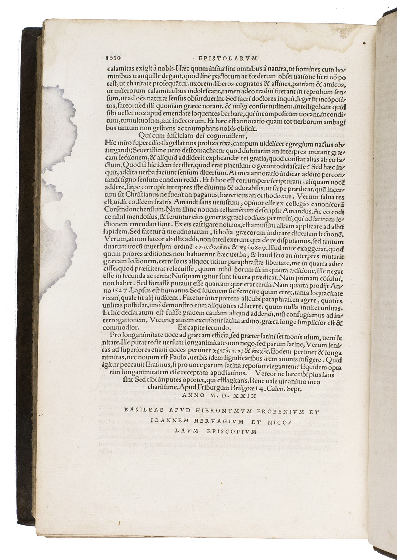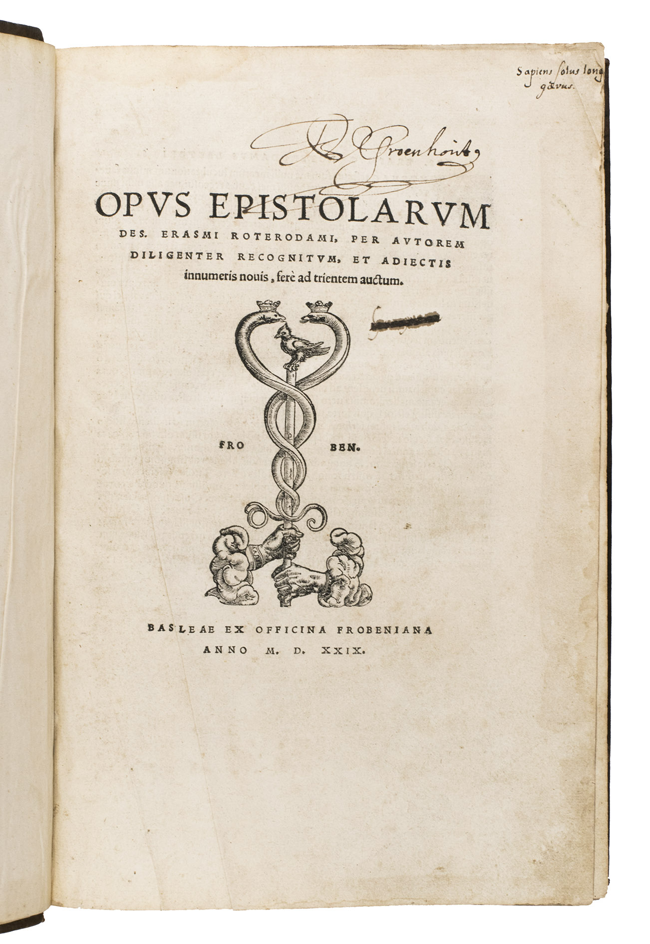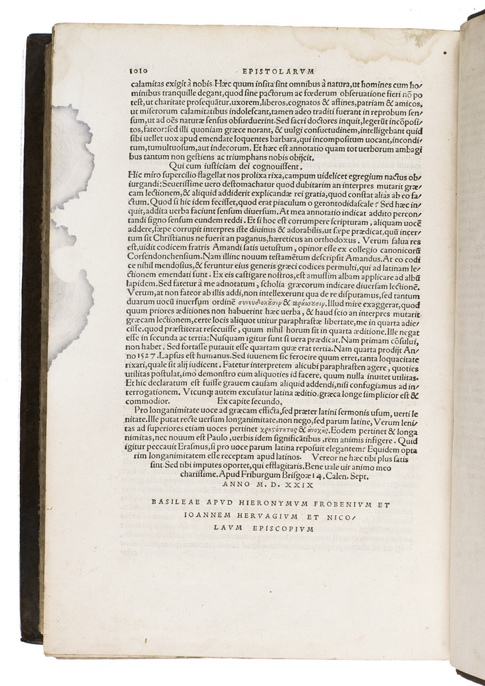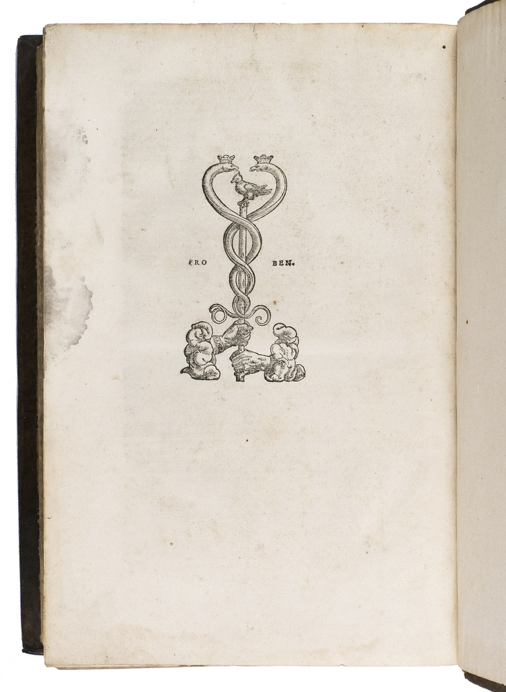 Basel, (colophon:) Hieronymus Froben, Johann Herwagen, and Nicolaus Episcopius, 1529. Folio. With Froben's large woodcut device on the title page and repeated on the otherwise blank final page, and numerous woodcut initials. 17th-century sprinkled calf. [8], 1010, [1 blank], [1] pp.