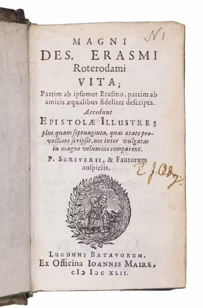 With a manuscript owner's inscription on the title pages of ads 1 and 6, a small manuscript inscription on the title page of ad 2, and a small manuscript inscription on the title pages of ads 3, 5, and 6-14. Further with two library stamps of the Nordelbische Kirchenbibliothek in Hamburg (incl. "Gelöscht" stamps) on the versos of the title pages of ads 1 and 6. The bindings are dust soiled and slightly damaged along the extremities, but the structural integrity of both bindings remains fine, slight foxing and browning throughout. Otherwise in good condition. Breugelmans, Fac et spera. Joannes Maire (2003), 1642:7 and other numbers; ads 2-6 and 10-14 in verzicht werken Erasmus (Rotterdam 1936); all works in the STCN and USTC; Van der Haeghen I, 182 and other numbers. A detailed list of references is available upon request.