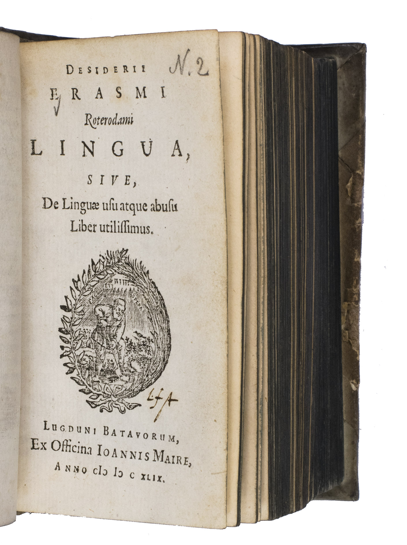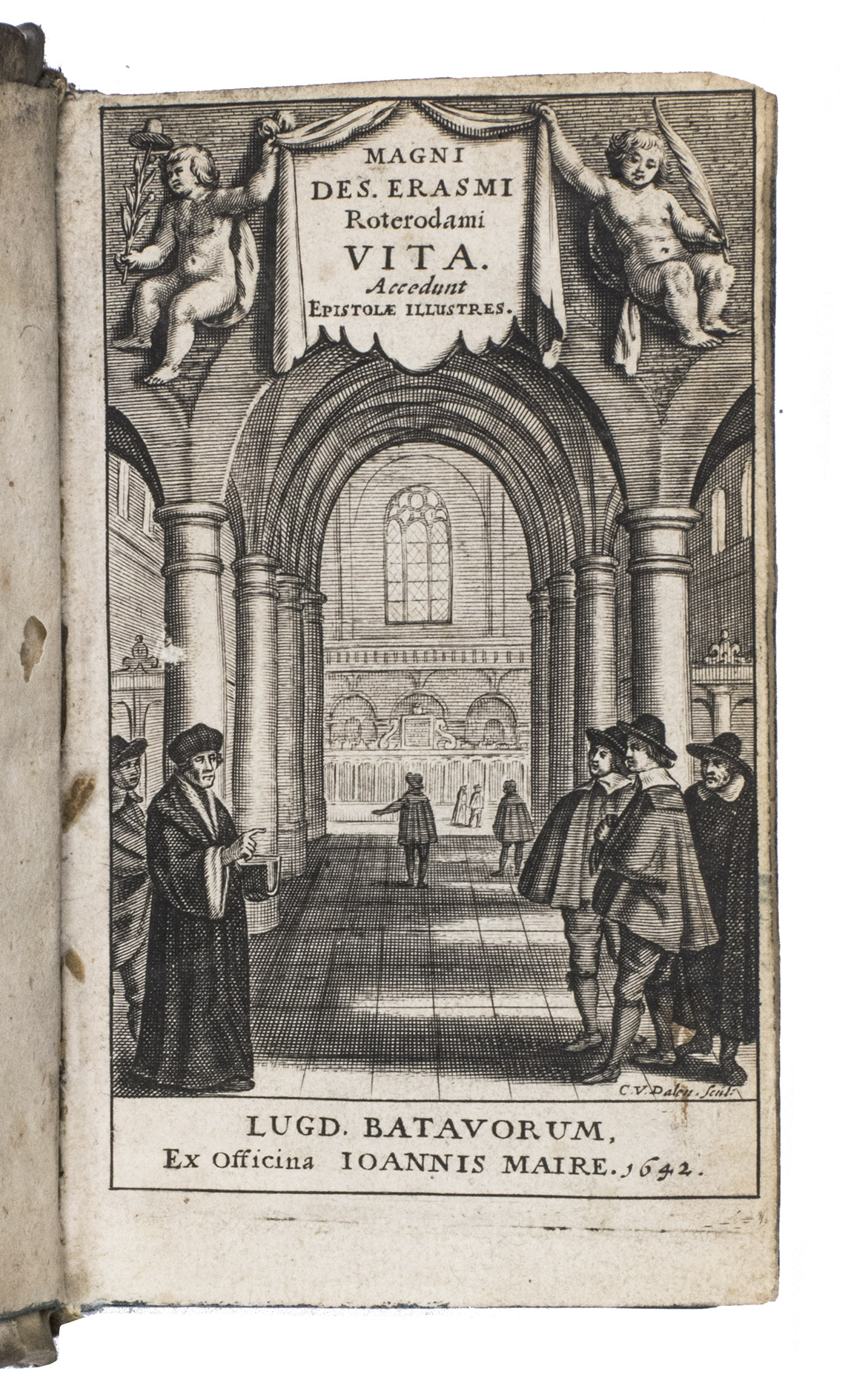 Leiden, Joannes Maire, 1652. 14 works in 2 volumes. 12mo. Ad 1 with an engraved title page by C. van Dalen showing Erasmus standing in a church with a book in his left hand pointing to three other men. All title pages contain Maire's woodcut device (see Breugelmans, nr. 13), and a woodcut portrait of Erasmus in a roundel on leaf *8r in ad 1 and his device in a roundel in the text on leaf 2*5v in ad 1. Further with several woodcut decorated initials throughout.