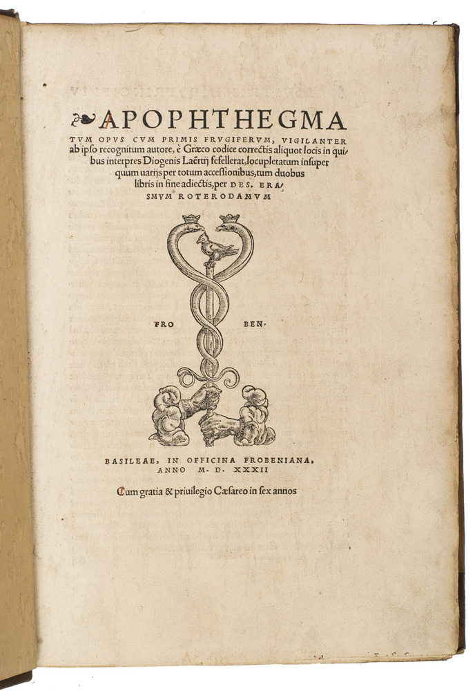 Basel, Froben Office (Hieronymus Froben & Nicolaus Episcopius), 1532, Small fol (20 x 30.9 cm). With 9 decorated metalcut initials, a decorated woodcut initial, and a woodcut printers device on the title page and final page. 19th-century blind-tooled brown half morocco. [8], 401, [1], [14] pp.
