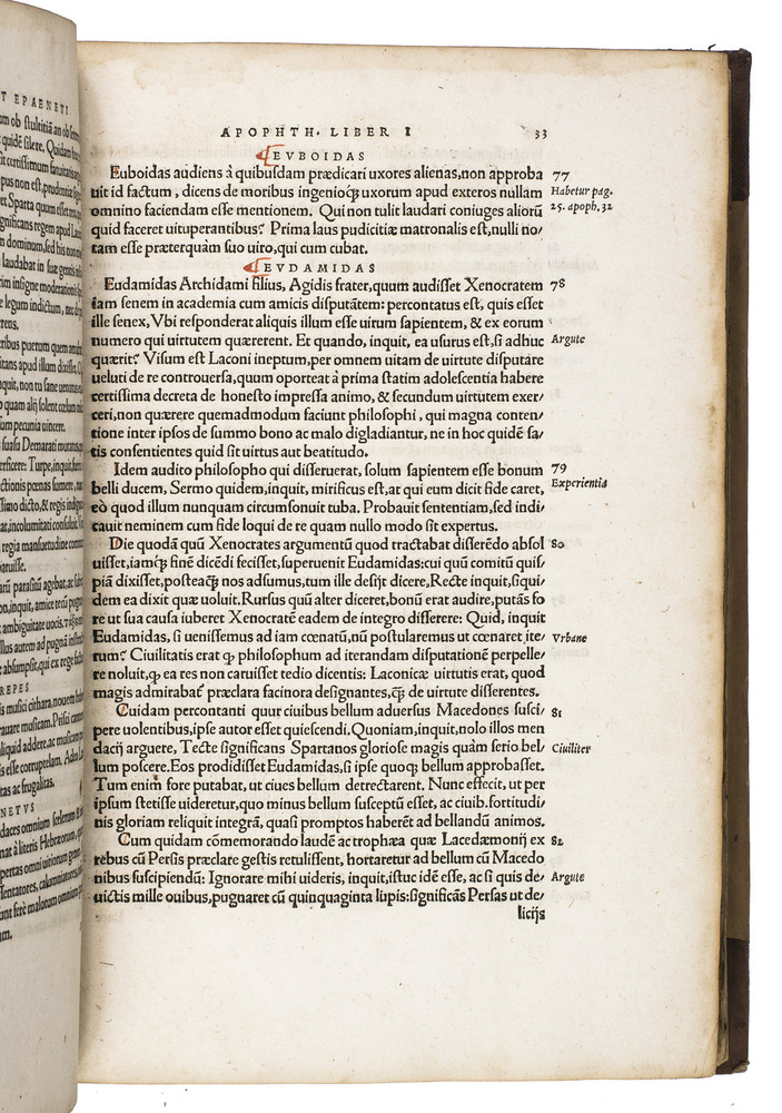 Apophthegmata are concise, witty, and often morally pointed sayings or anecdotes attributed to notable historical figures, valued for the ethical and rhetorical lessons they convey. In his Institutio principis christiani (1516), Erasmus famously advised that the first secular work a prince should read was Plutarchs Apophthegmata. He took this advice to heart by compiling his own version, drawing largely from Plutarch and supplementing it with excerpts from classical authors such as Quintilian, Suetonius, Athenaeus, Valerius Maximus, Diogenes Laertius, Philostratus, Macrobius, and Stobaeus.