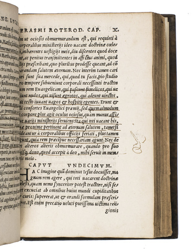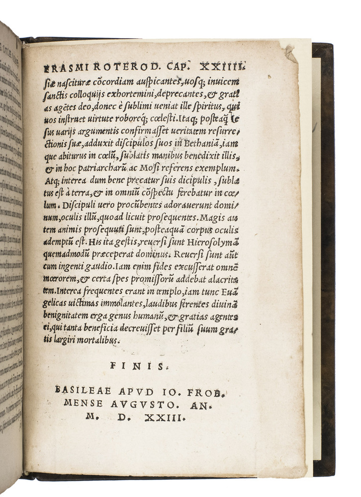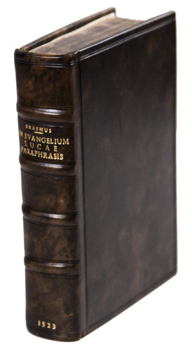 With some contemporary underlining' and annotations, primarily consisting of corrections, textual additions, and markings of notable passages; a later bibliographical annotation in brown ink at the head of the title page ("Panzer VI 237"), and a small bookbinders label mounted in the bottom inner corner of the recto of the final blank flyleaf ("Period Bookbinders Bath England Tel (0225) 20698"). Some small wormholes in the first 5 leaves, slightly affecting the text, the title page is slightly (dust) soiled). Otherwise in good condition. Adams E 755; Bezzel 1164; Bloemendal, ""Collected Works of Erasmus, vol. 47: Paraphrase on Luke 1-10, edited by Jane E. Phillips", Erasmus Studies," 37 (2), (2017), pp. 217-222, see p. 218; Bloemendal, "Exegesis and Hermeneutics in Erasmus Paraphrase on Luke", Erasmus studies, 36 (2), (2016), pp. 148-162; BM STC German p. 119; USTC 665710; Vander Haeghen I, 148; VD16 E 3061; not in De Reuck.