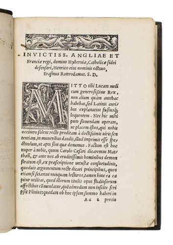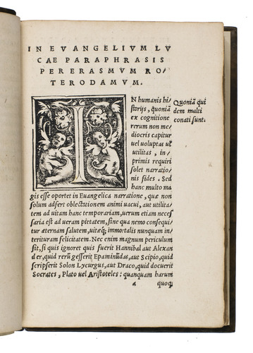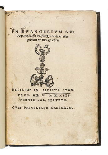 First edition of Erasmus Paraphrase on the gospel of Luke. Unlike his paraphrases on the gospels of Matthew, Mark, and John, each dedicated to rulers of France or the Holy Roman Empire, this work was addressed to King Henry VIII of England. The lengthy dedicatory preface, which spans the first twelve leaves, takes the form of a personal letter from Erasmus to the king. The Paraphrase on Luke was also unique in its format: it was the only one of the gospel paraphrases to be first published in octavo.