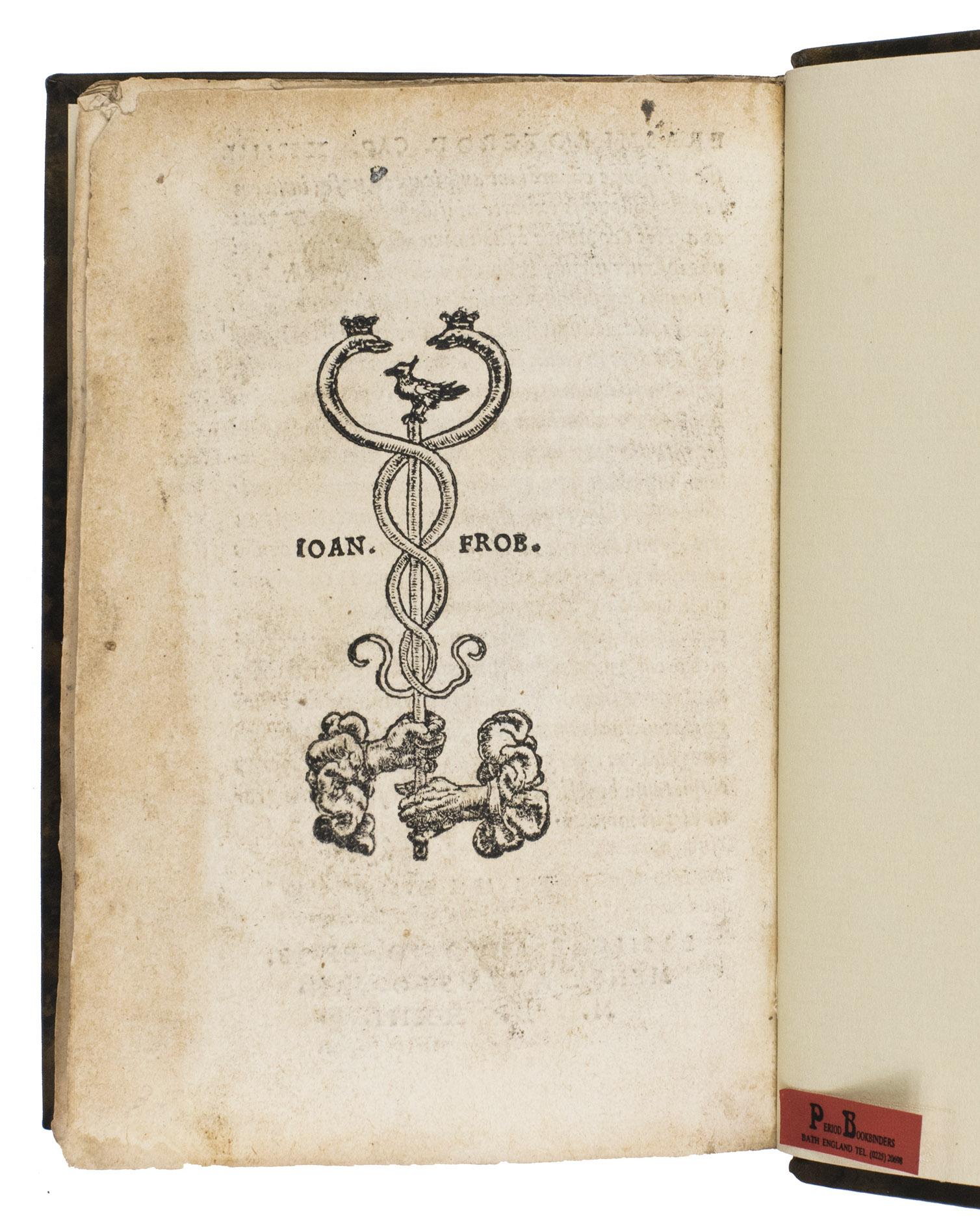 Basel, Johann Froben, September 1523. Small 8vo (10.7 x 15.2 cm). With 2 small woodcut illustrations incorporating Frobens device on the title page and the verso of the final leaf, a woodcut headpiece above the dedication, and two woodcut decorated initials. Modern blind-tooled marbled calf. [275] ll.