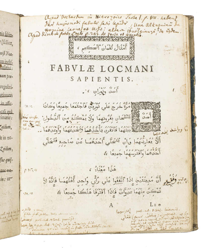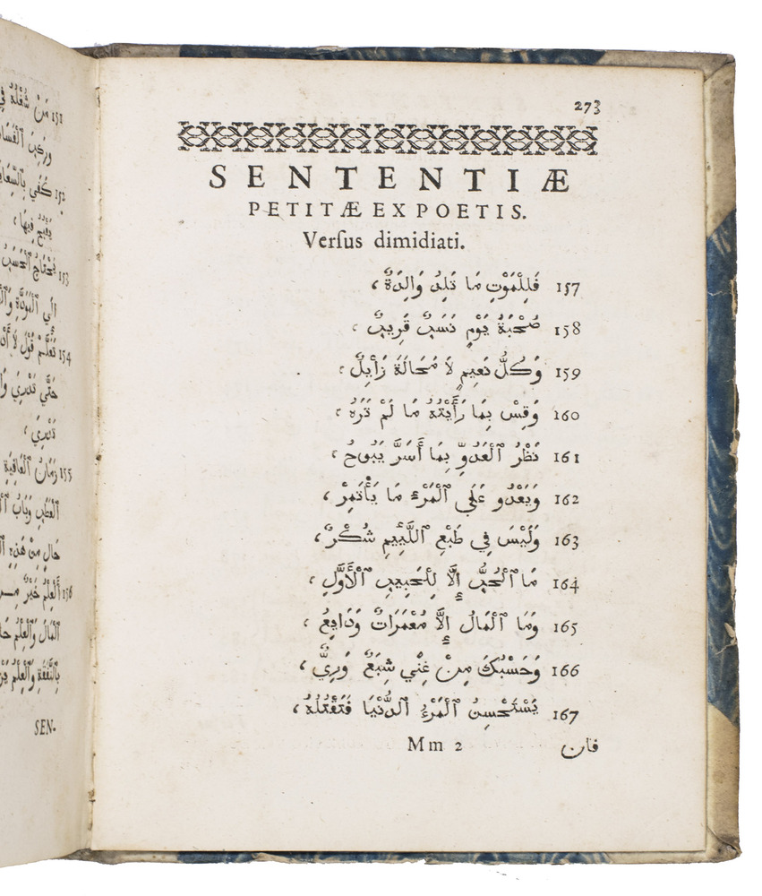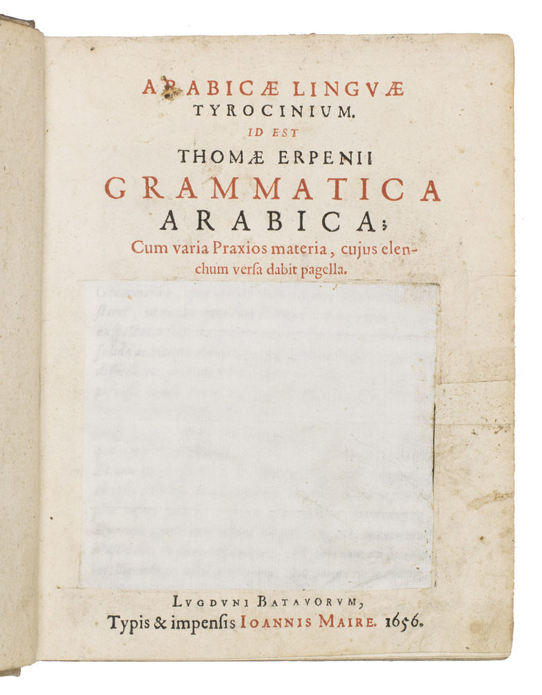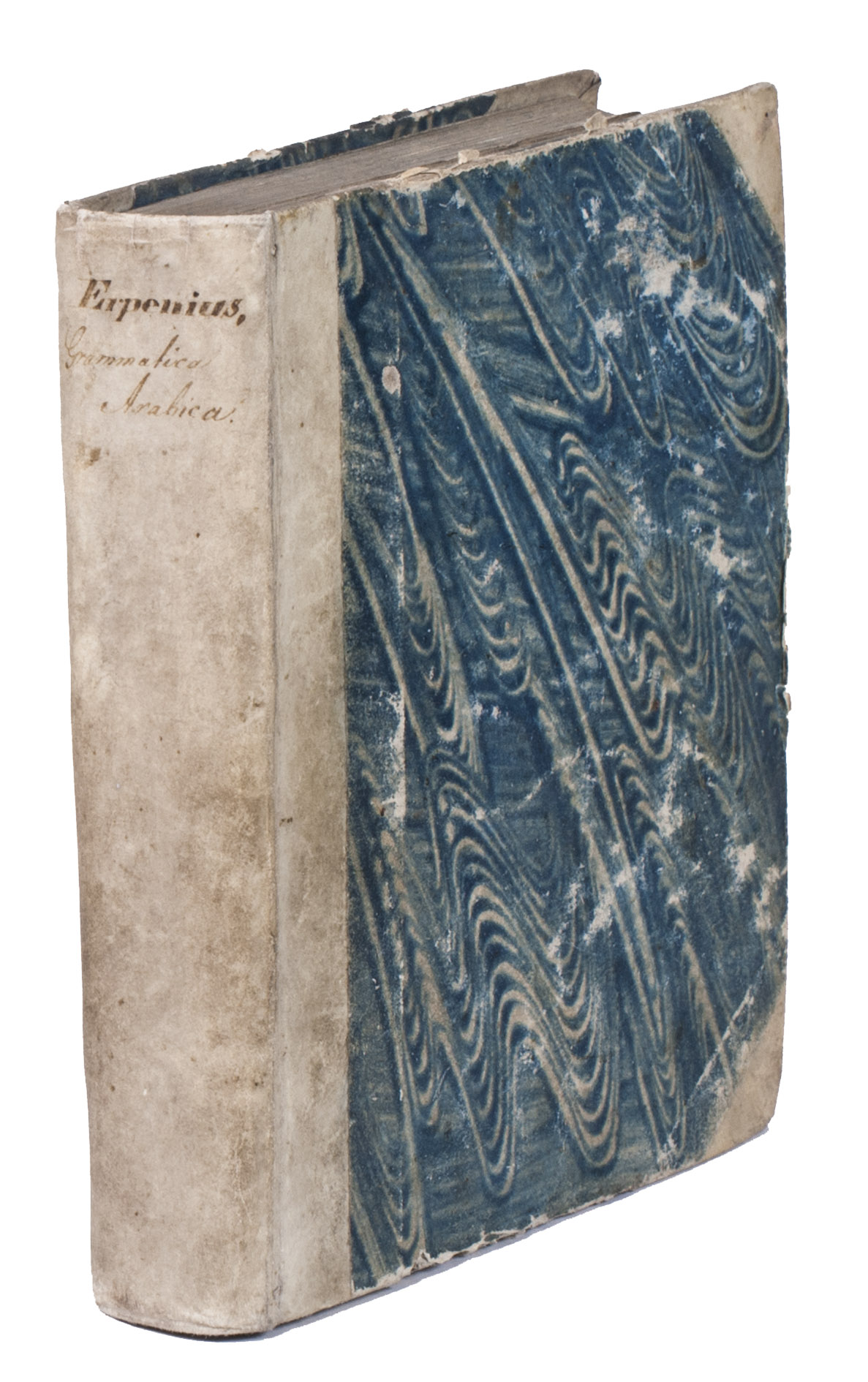 The work is annotated throughout in brown ink in an 18th-century hand, probably belonging to Petrus Boling. With two manuscript owner's inscriptions on the front pastedown ("J. Apelb..." [crossed out] and "Ex libris Petr. Boling. [Hebrew numbers(?) 2204]"), and a blue oval stamp of the library of the Gästrike-Hälsinge Nation (a student's association in Uppsala, Sweden; "Gästr.-Häls. Nation Bibliotek") on the recto of the first flyleaf. The vellum of the binding is browned, the decorated paper sides are rubbed and slightly damaged along the edges, the printer's device on the title-page has been removed, the hole has been restored with thin laid paper, the first leaf of the preface has been reinforced with paper (was damaged when the title-page was cut), some slight foxing throughout. Otherwise in good condition. Breugelmans, Fac et spera (2003) 1656:1; F. De Nave, Philologia Arabica (1986) 72 note; Schnurrer 81 & 220; Smitskamp, Philologia orientalis 72; STCN 065582748 (8 copies); USTC 1829193 (7 copies)