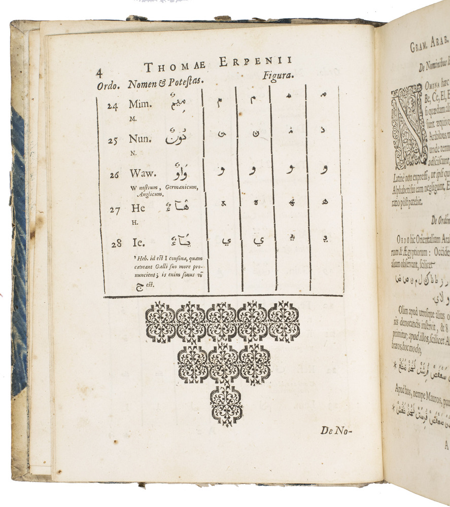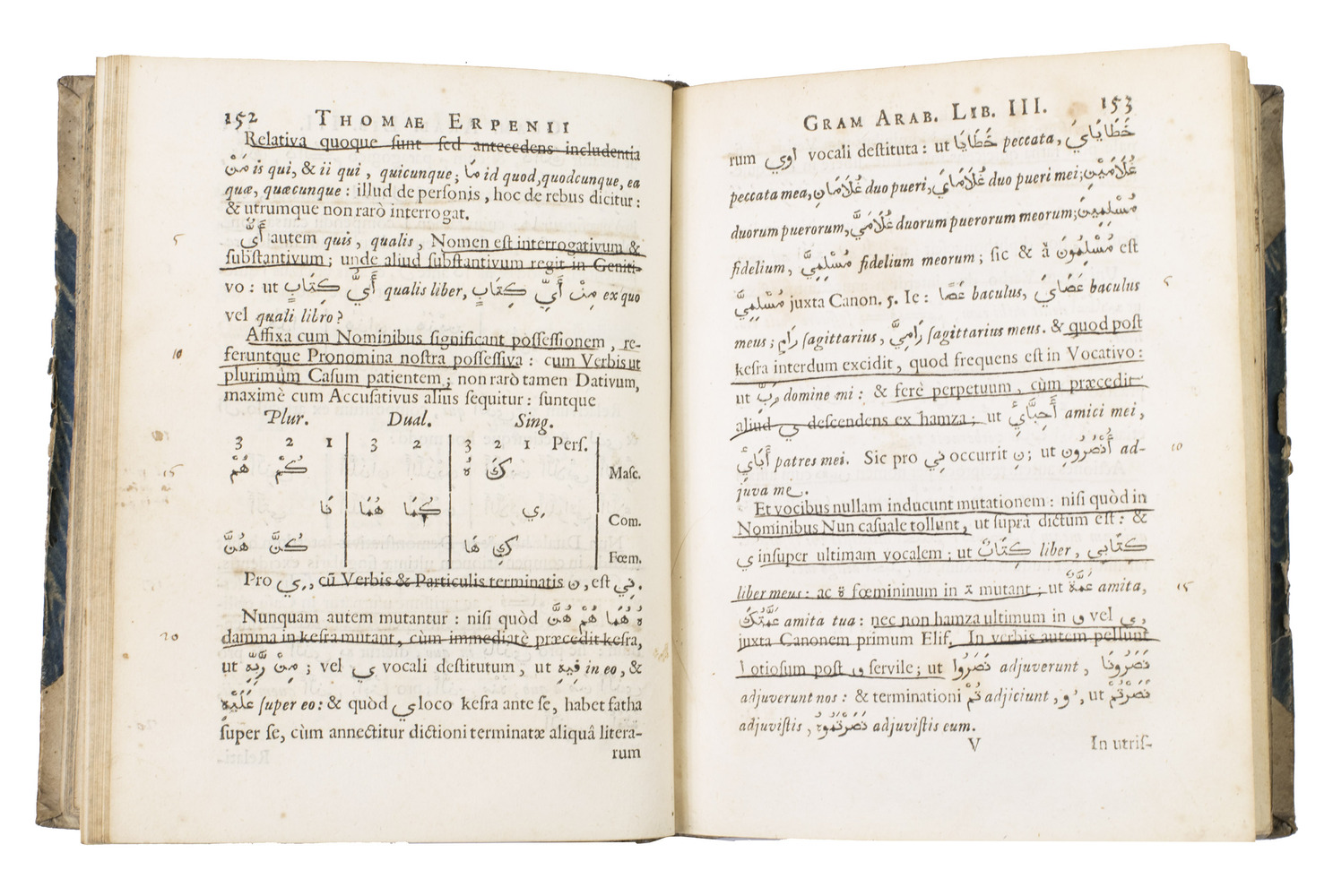 Third edition, expanded and edited by Jacobus Golius, of Erpenius classic Arabic grammar, first published in 1613. Maire had published the second edition, edited by Golius student Antonius Deusing, in 1636. That edition included the authors own revisions, taken from his copy of the 1613 edition, and was expanded by the addition of Lokmans fables and Arabic proverbs, which Erpenius had published earlier. The present edition further expands it with an Arabic chrestomathy that Fabricius had published in 1638.