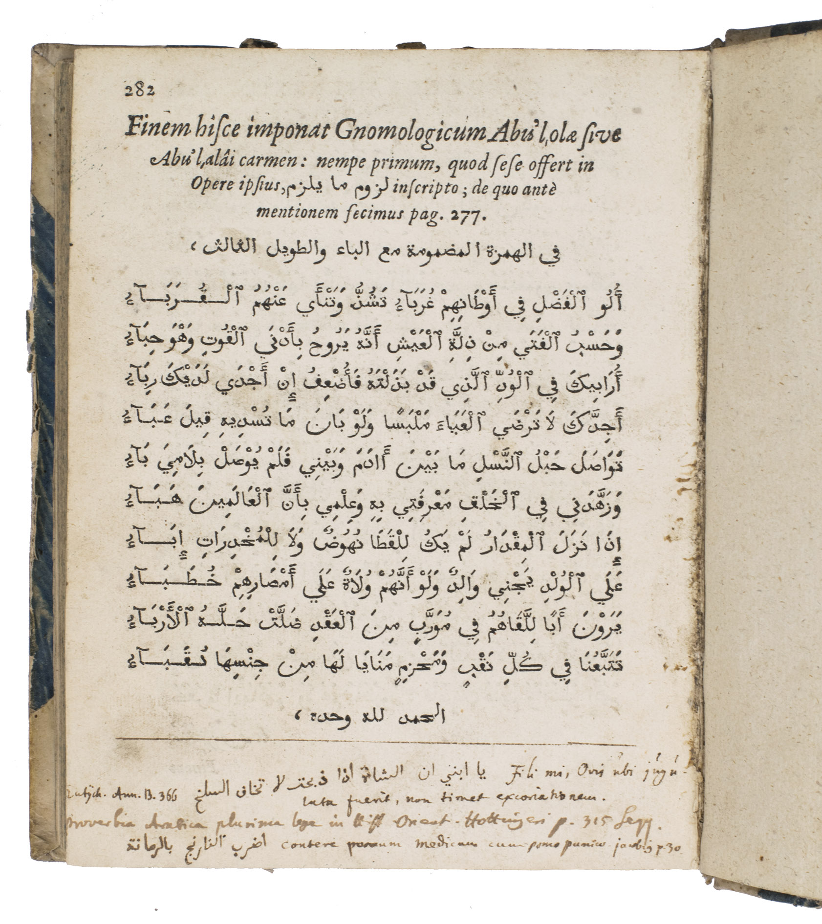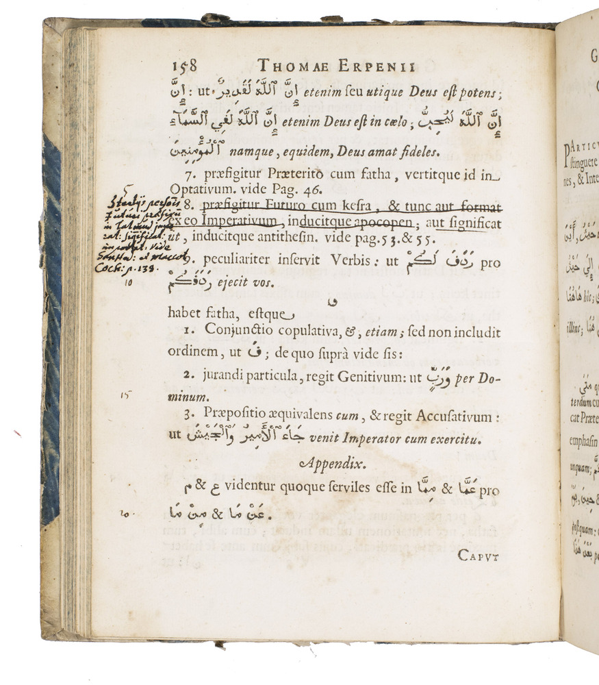The present copy has clearly been used to study Arab grammar, as it has been annotated in an 18th-century hand throughout. These annotations are most likely the work of the Swede Petrus Boling (1731?-1805?) who was headmaster in Gävle from 1786 to 1805. His manuscript ex libris can be found on the front pastedown.
