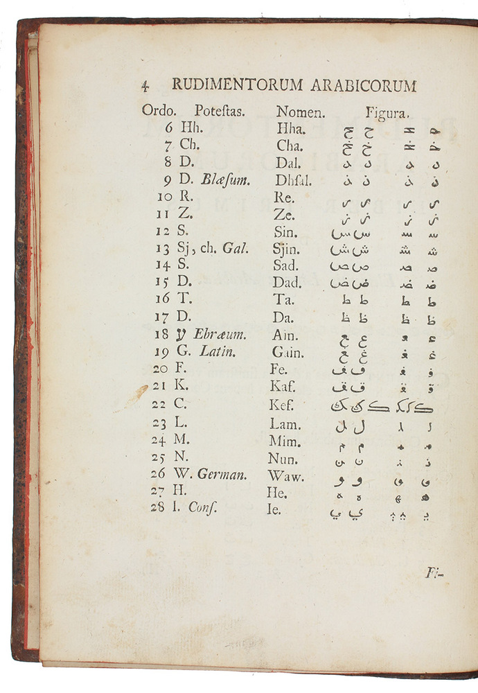 Fifth, enlarged edition of the groundbreaking introduction to the Arabic language by Thomas Erpenius (1584-1624), the first professor of Arabic at Leiden University. He printed and published the first edition himself in 1620, one of the earliest major works using the Arabic types cut for his new oriental printing office by Arent Corsz. Hoogenacker in 1615. The Elzevirs acquired Erpeniuss materials and many of his workmen after his premature death from the plague and printed and published the second edition in 1628. Vitrays third edition (Paris, 1638) is based on the second. These were all in 8vo format with about 250 pages. Albert Schultens (1686-1750), appointed professor of oriental languages at Leiden in 1732, prepared a greatly enlarged 4th edition in 1733, now in 4to format and more than three times as long. The additions included his own Clavis dialectorum, discussing the relations between Hebrew and Arabic words, and the Nawabig ul-kalim, a collection of proverbs compiled by the linguist Mahmud ibn Umar al-Zamabshari (1075-1144 CE; AH 467-538) in what became Uzbekistan and Turkmenistan. The present 5th edition expands it still further, especially the indexes (the Arabic index filling 142 pages).