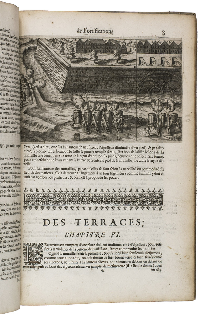 With minor and mostly marginal water stains (reaching the corner of the text in the last two quires), occasional marginal tears and an occasional crease, but still in good condition. The binding shows a few stains, and old sheepskin parchment restorations on the fore-edge, but is structurally sound as refurbished. The only Netherlands edition, in the original French, of a seminal classic of French fortification. Berlin Kat. 3518; Cockle 802 note; Jordan 1066 (7 copies); cf. Jähns, pp. 832-833; Sloos, Warfare 8008; not in STCN.