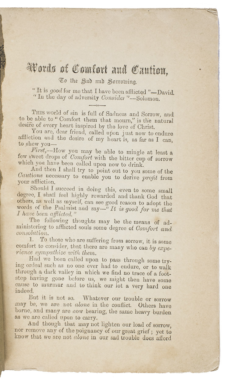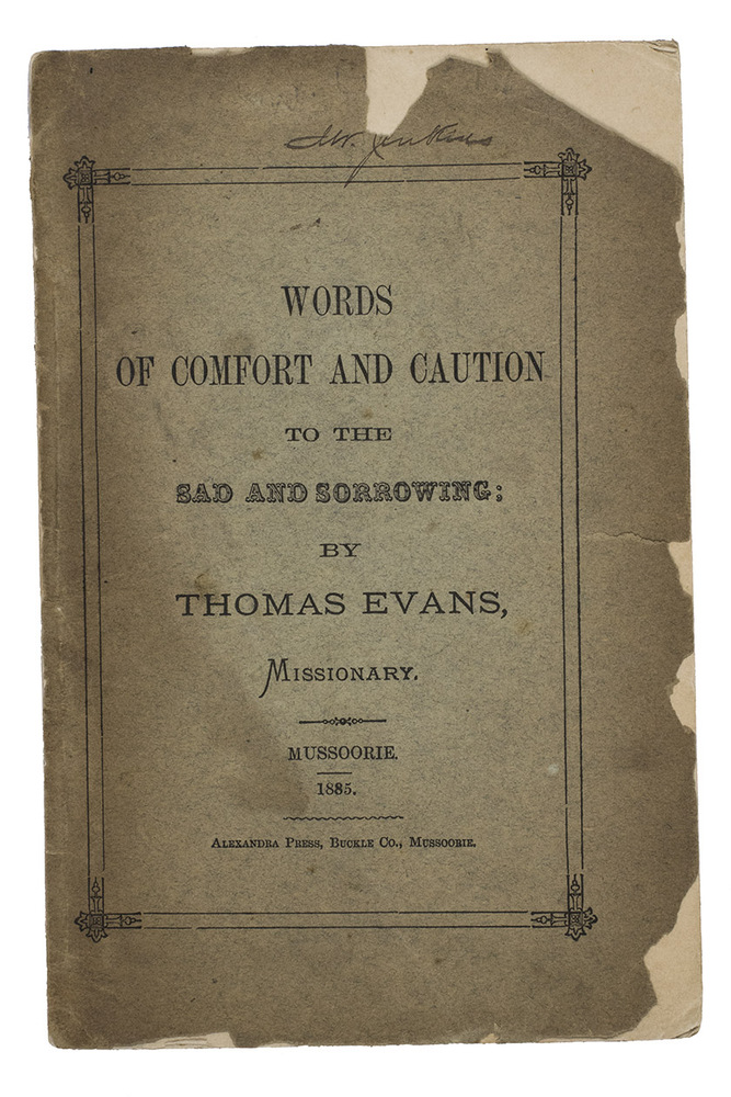 The only known copy of the only known work by Welsh missionary in India Thomas Evans. He likely wrote and published this book, offering words of comfort based on Christian scripture, while he was on medical leave in Mussoorie, making the book a very rare specimen of 19th-century provincial printing in India.