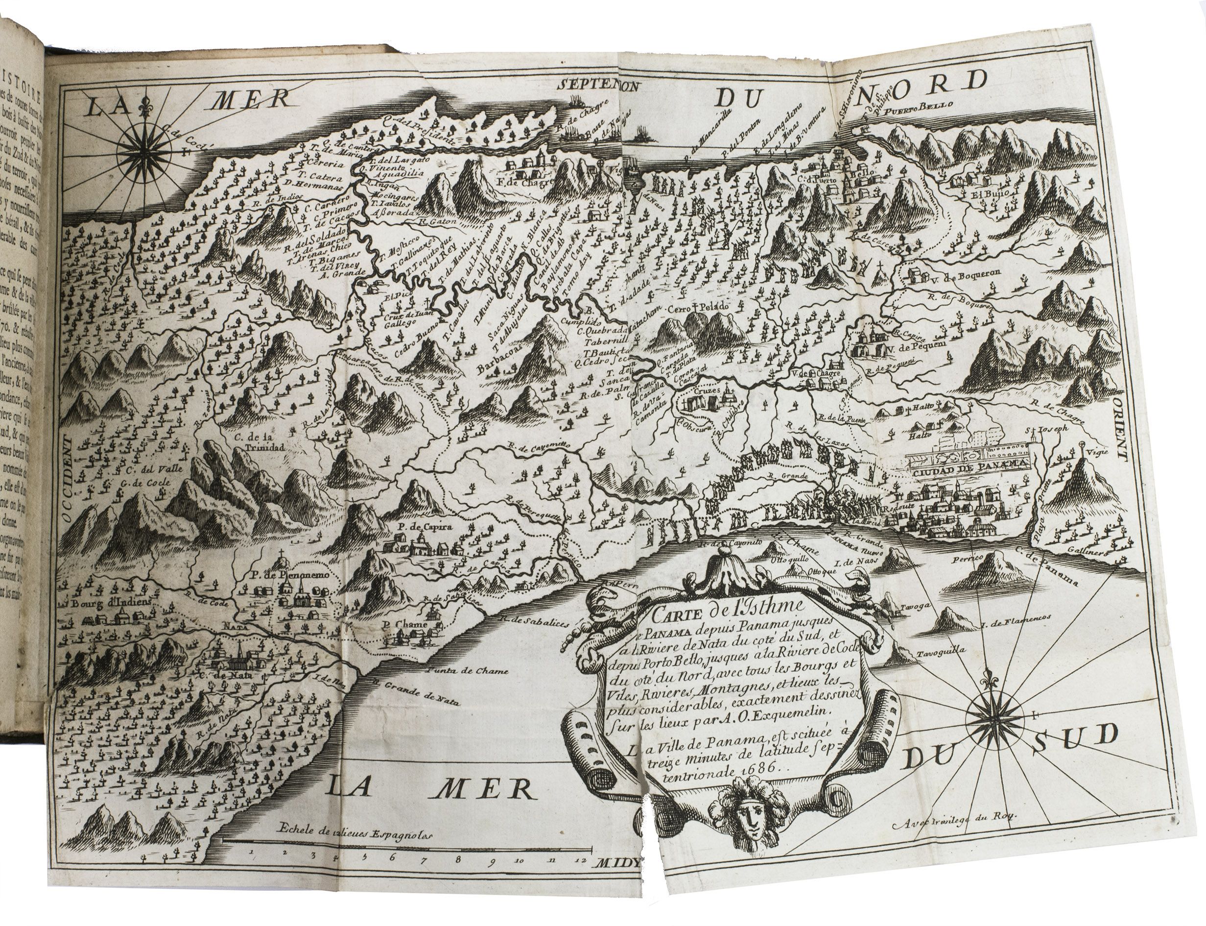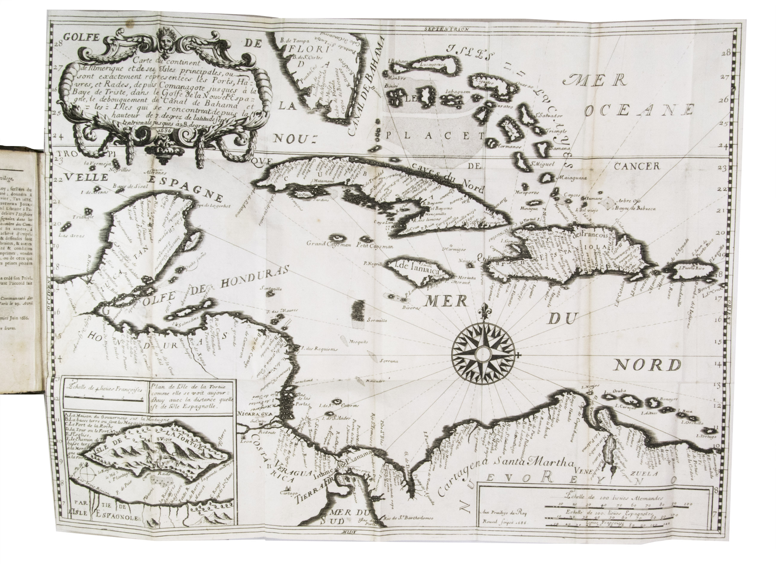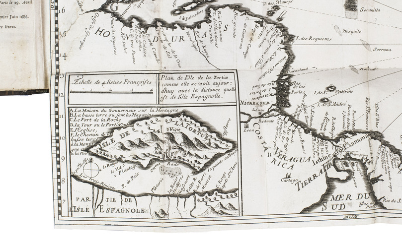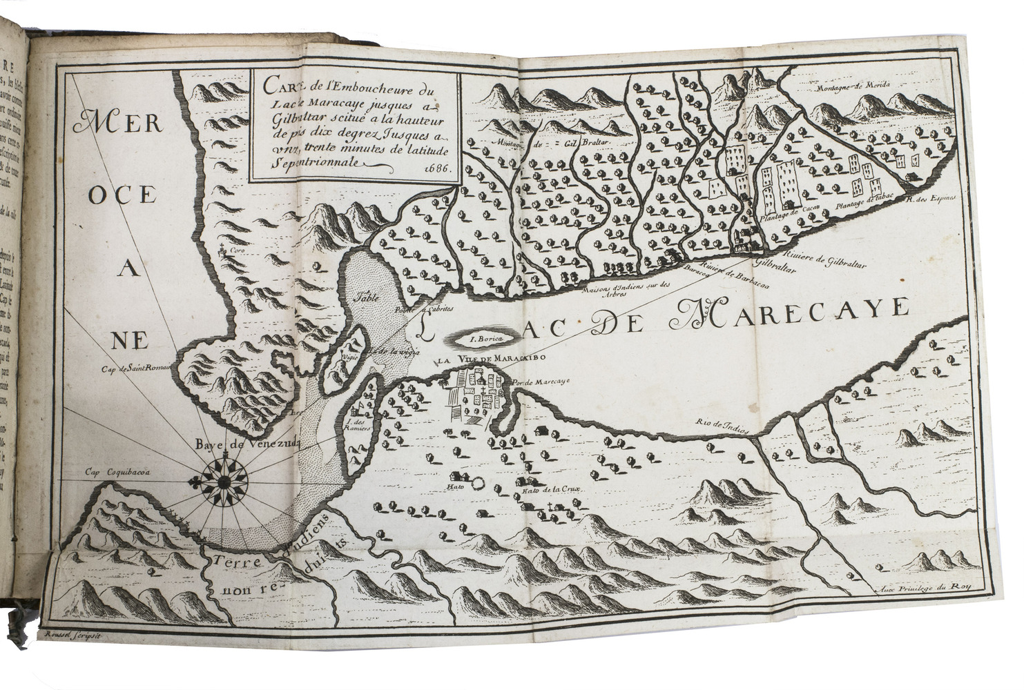 Paris, Jacques le Febvre, 1686. 4 parts in 2 volumes. 12mo. With an engraved title page in vol. 1, 3 engraved folding maps (the Caribbean, the Bay of Maracay in Venezuela, and the Isthmus of Panama), 4 engraved plates outside of collation, 5 decorated woodcut initials, 5 woodcut headpieces, and 4 woodcut tailpieces.