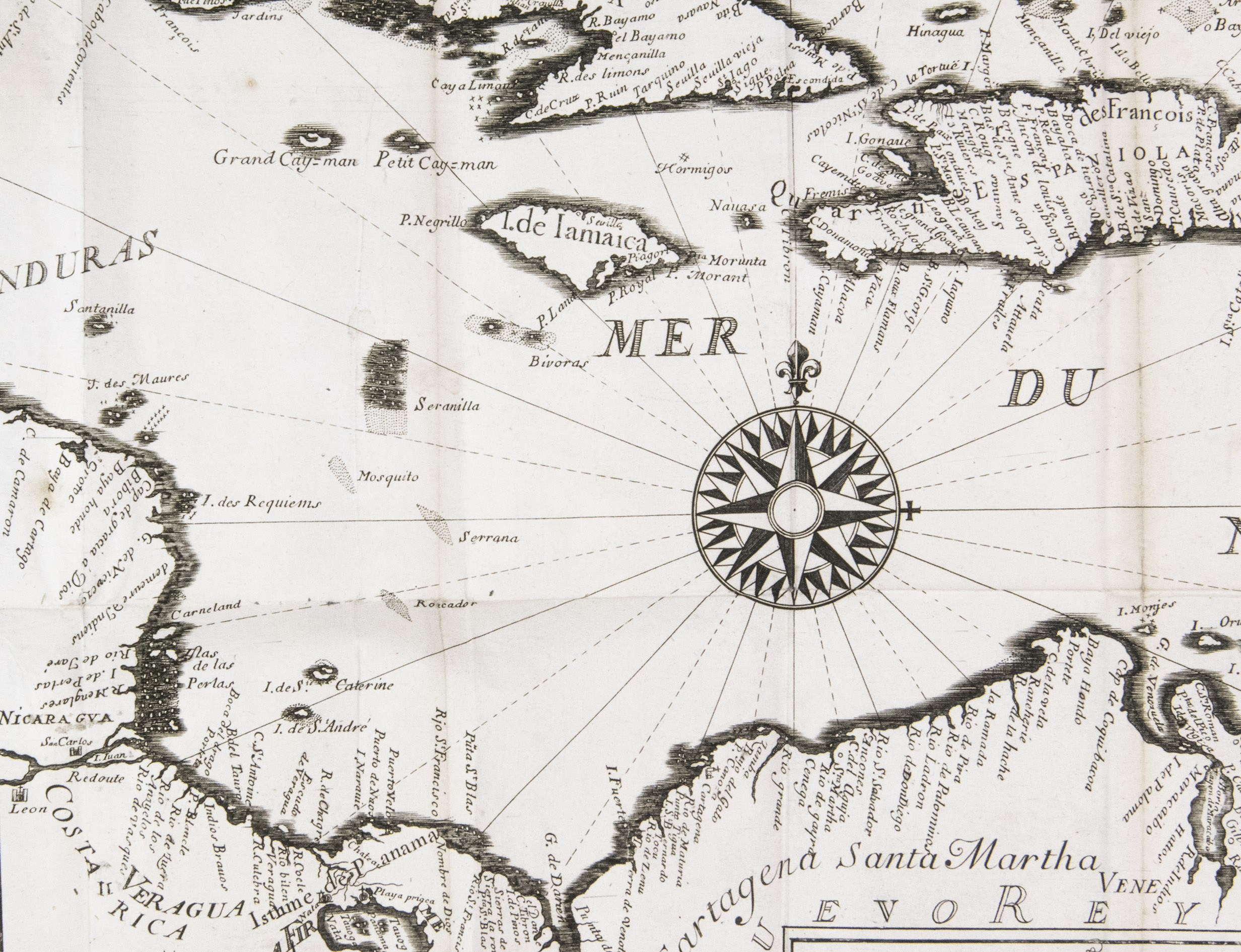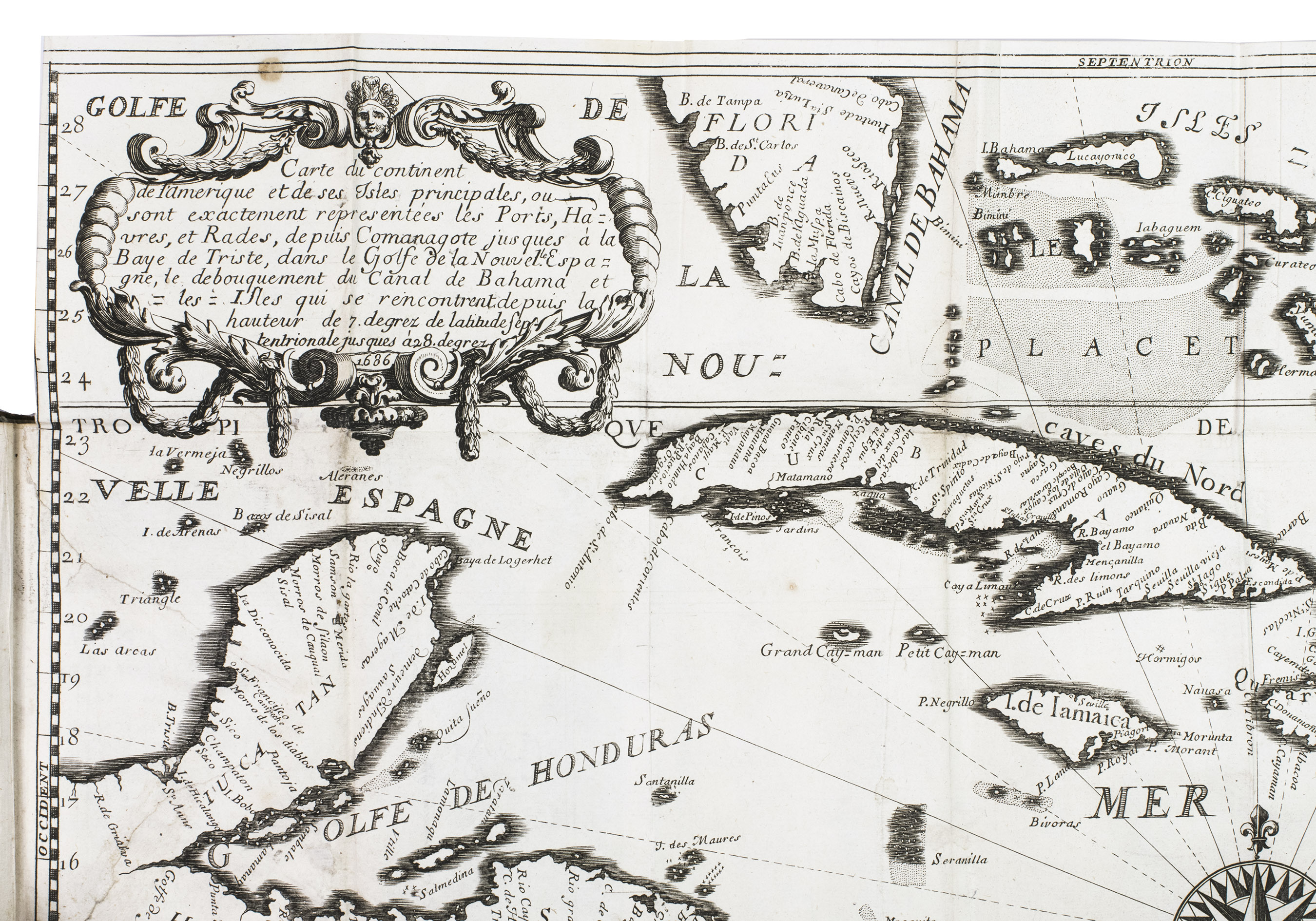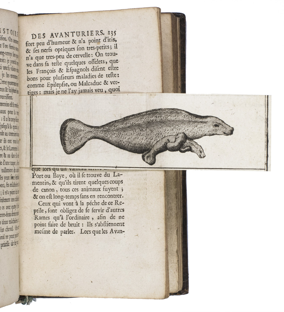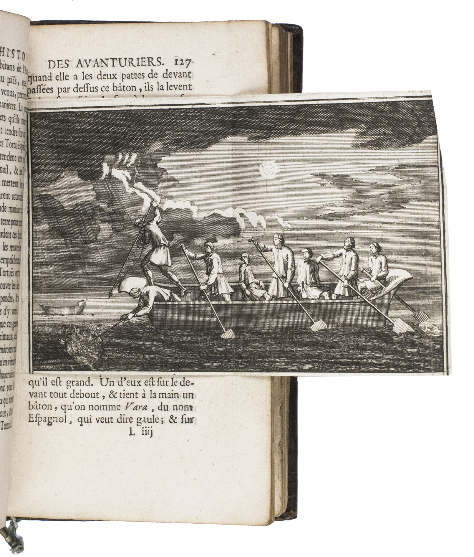 Paris, Jacques le Febvre, 1686. 4 parts in 2 volumes. 12mo. With an engraved title page in vol. 1, 3 engraved folding maps (the Caribbean, the Bay of Maracay in Venezuela, and the Isthmus of Panama), 4 engraved plates outside of collation, 5 decorated woodcut initials, 5 woodcut headpieces, and 4 woodcut tailpieces.