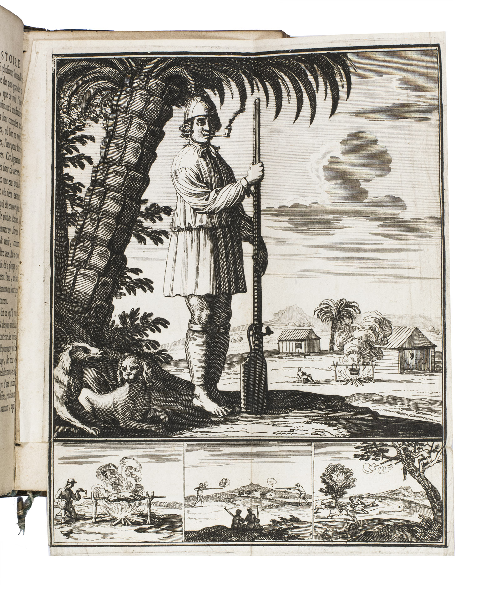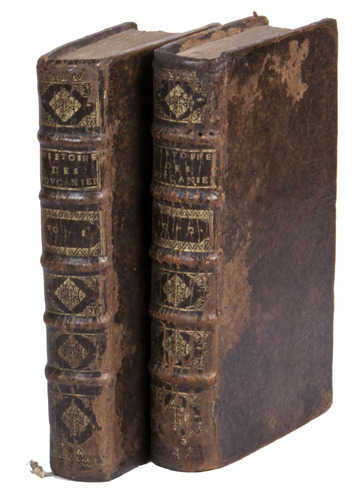 The boards are somewhat rubbed, with the loss of portions of the top layer of the leather on the back of volume 1 and the front of volume 2, the joints are somewhat weakened, but the structural integrity of the bindings is still intact, the head and tails of the spines of ad 1 have been restored, the spines are creased, with small worm holes on the boards of both volumes, the foot endband on volume 1 is partly detached. The end leaves are foxed, the volumes are somewhat browned throughout, lacking the final blank leaf of volume 1. Otherwise in good condition. Alden-Landis IV, 686/55; Borba de Moraes I, p. 300; Palau 85742; Sabin 23475; USTC 6125493 (1 copy); cf. Cat NHSM, p. 877 (later ed.); Cox II, p. 207 (other eds.); H. de la Fontaine Verwey, "The ship's surgeon Exquemelin and his book on the buccaneers", in: Quaerendo IV (1974), pp. 109-131; Howgego, E39; Leclerc 199 (other ed.).