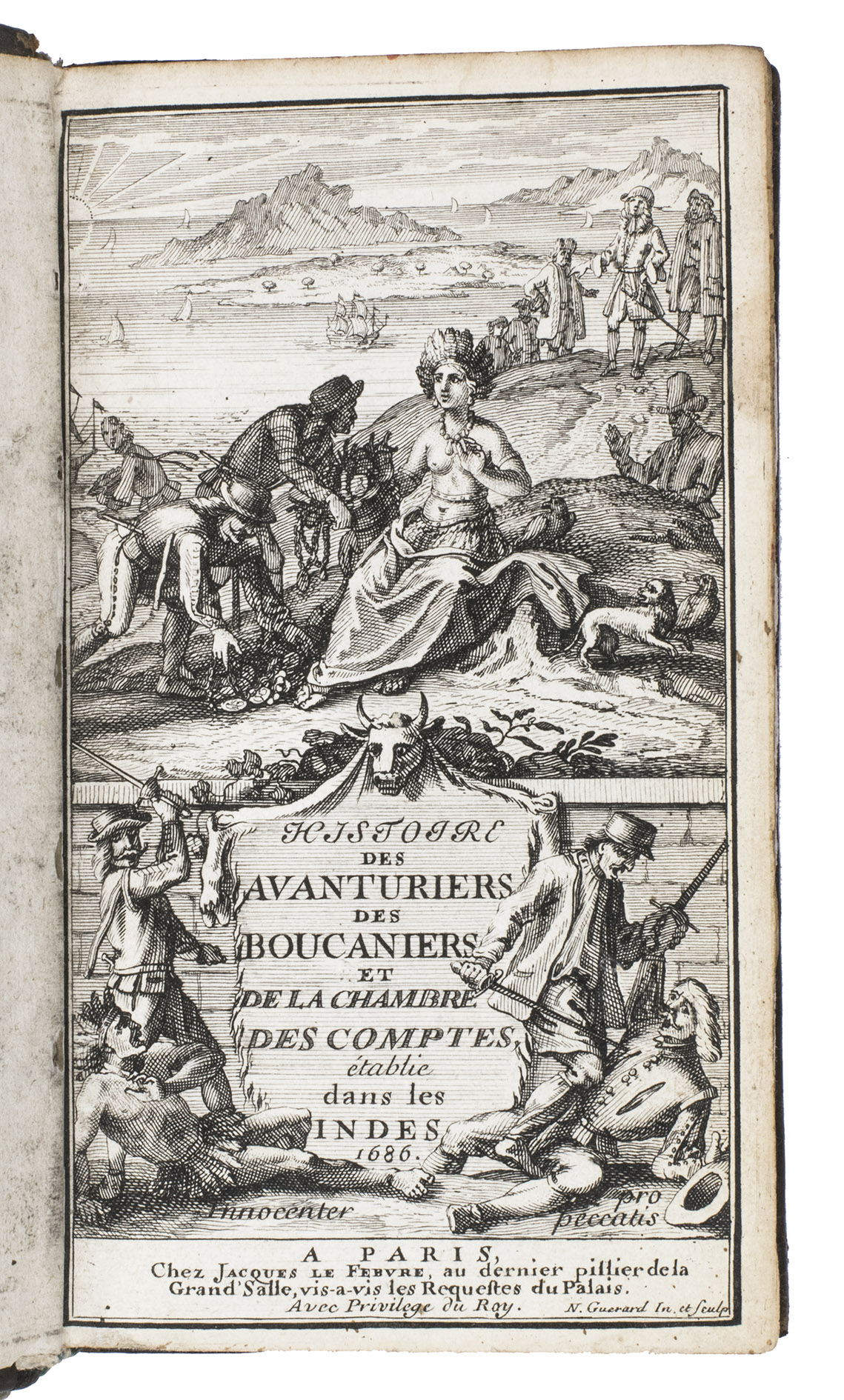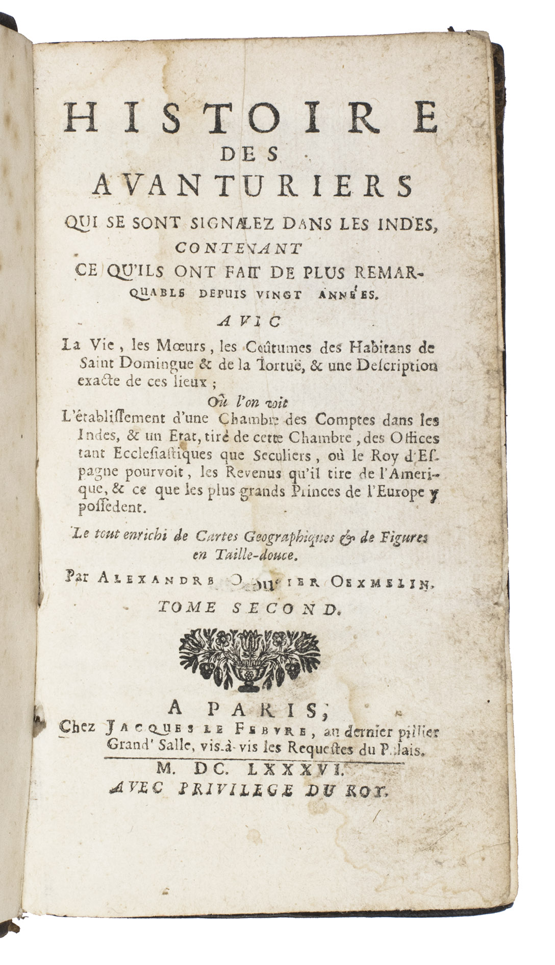First French edition of arguably the most influential buccaneering work, written by a buccaneer. Its detailed account of piracy in the West Indies is the most important primary source and "almost the only comprehensive source of information for pirate activities in the seventeenth century" (Howgego). It was first published in Dutch in 1678 as De Americaensche zee-roovers and was soon translated into French, German and English "There is certainly no other book of that time which experienced a popularity similar to that of the Bucaneers of America which was in the ten years following its publication translated into most of the European languages" (Sabin).