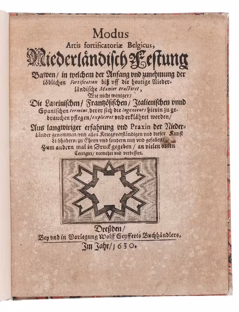 Rare second(?) edition, in the original German, of a brief compendious handbook of fortification following the Dutch methods and tactics. In the years 1600 to 1625, the Dutch Prince of Orange, Maurits van Nassau (1567-1625), proved the efficacy of the new Dutch ideas and techniques in fortification and siege warfare in the Eighty Years' War against Spain. With the German States now embroiled in the hostilities that spread to other parts of Europe as the Thirty Years' War (1618-1648), there was a great practical interest in these new methods. While foreign authors were beginning to incorporate Dutch methods in their manuals, these tended to be up-market works, out of the reach of the common soldier or even many officers, and they also failed to keep up with the rapidly developing Dutch art of fortification. The present cheap compendium, indifferently printed on coarse paper, gives a much better idea of what common soldiers, lower-level officers and the interested general public would have learned about the new Dutch art of fortification than the great works by famous authors.Title-page and last page browned and the former also has a small stain, otherwise in very good condition. A fortification handbook for the common man, rare in all editions. VD17, 23:287401X (3 copies); Jähns, pp. 1105-1106 note; not in Cockle; Sloos.