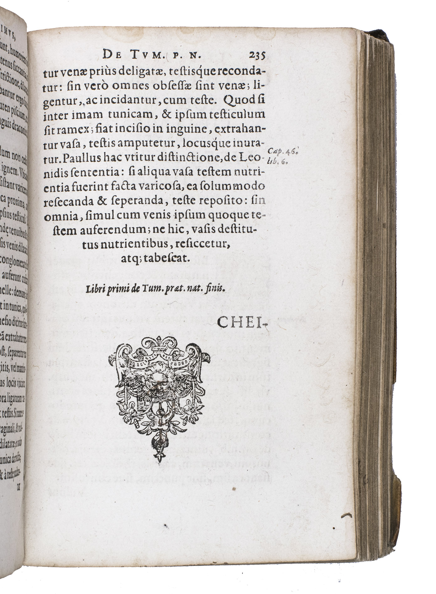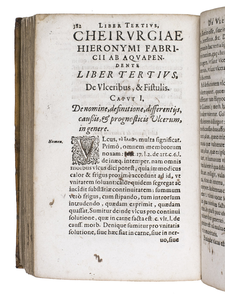 With an early owner's name R. Erard on the title-page and a later owner's name at the head. With some marginal wormholes in the first third, but even where they are most severe (in the gutter margin of quires F and G) they rarely touch the text and never remove a letter, occasional water stains in the last few leaves, a small ink splotch on the title-page (affecting 2 letters) and an occasional smaller one. Still in good condition. The vellum of the binding shows some small chips, holes and tears, and the ties are lost. Durling 1416; Norman Library 748; USTC 683385; VD16 F498; cf. Heirs of Hippocrates 366; Wellcome I, 2120; not in Garrison & Morton; Osler; for Fabrici: DSB IV, pp. 507-512 (noting this ed. p. 511).