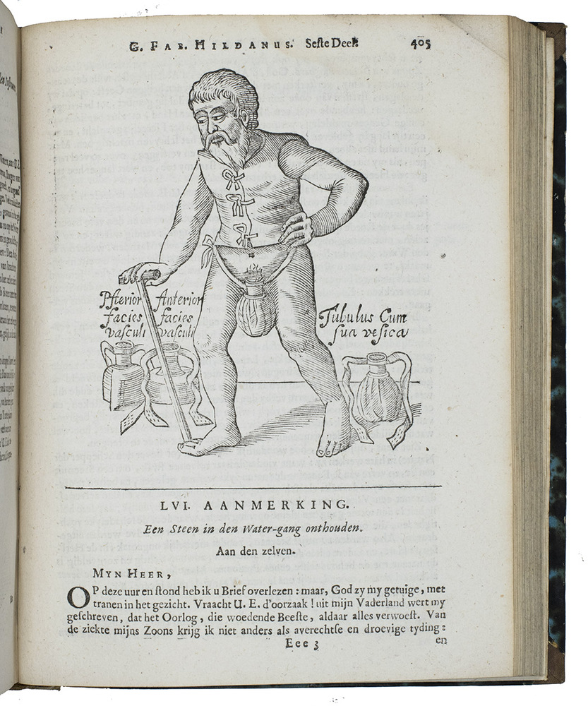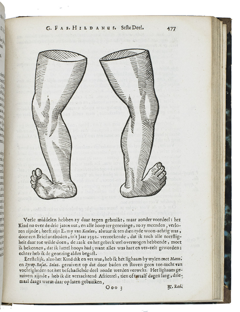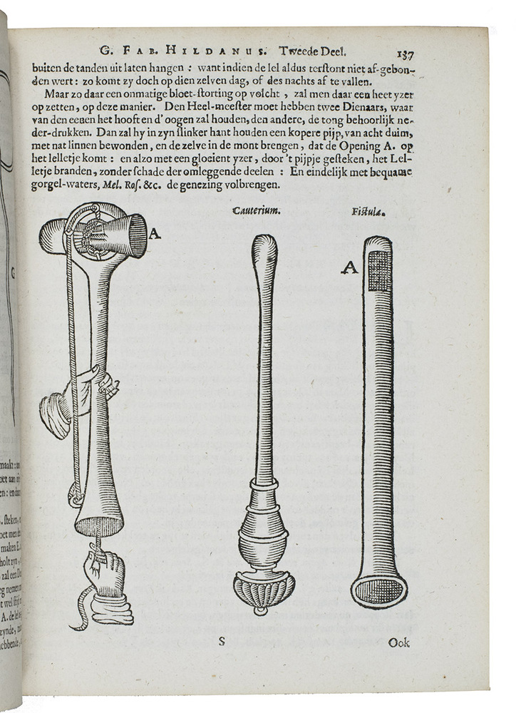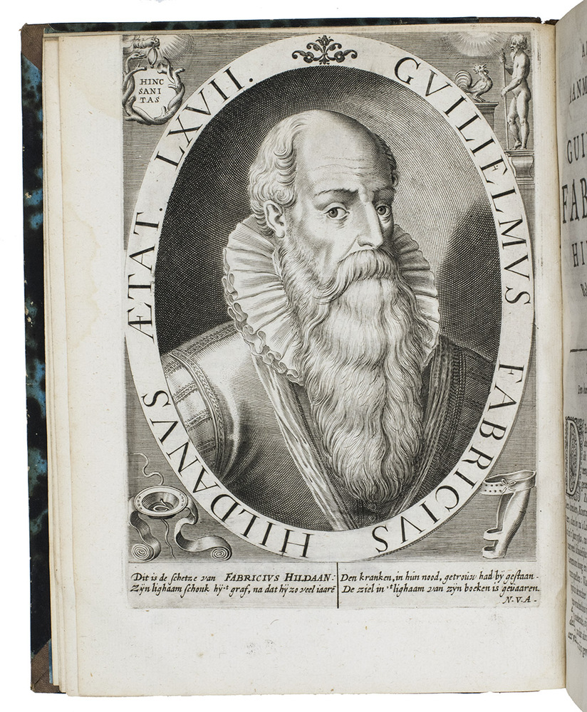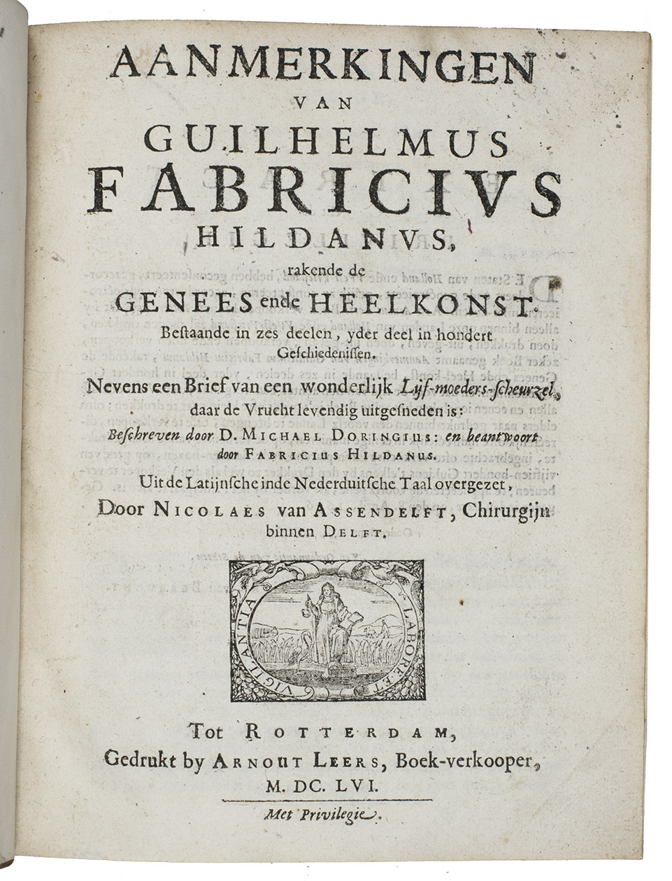 Rare Dutch edition of Wilhelm Fabry von Hilden's famous Centuriae or collections of surgical case reports, enlarged with three additional cases. The collections, 600 in total, were assembled from Fabry's detailed notes of his own cases, and from information supplied by the physicians and surgeons with whom Fabry corresponded.