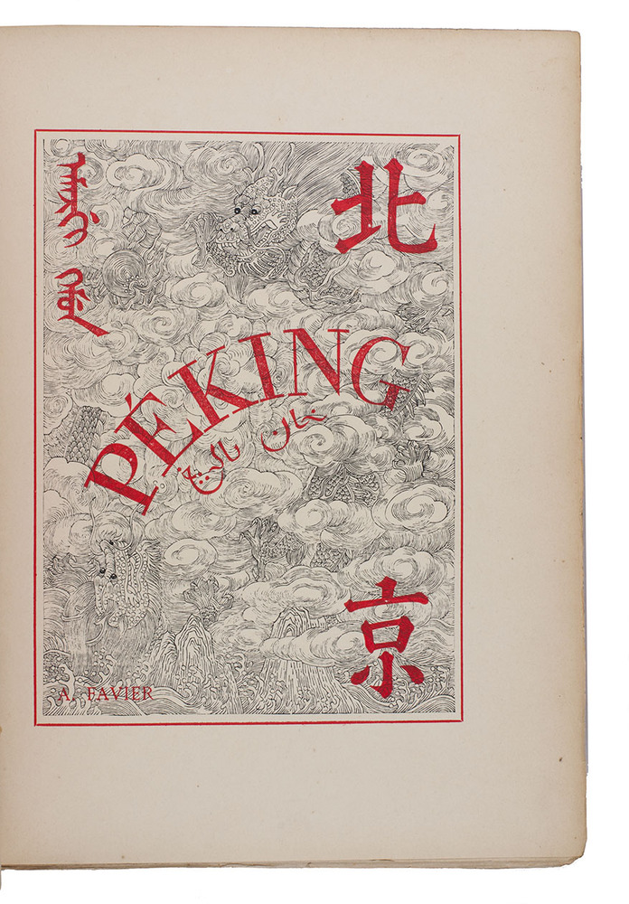 First edition of an important source on Beijing in the late 19th century, written by the Lazarite Vicar Apostolic Alphonse Favier (1837-1905). Favier arrived in China in 1862 and became the Vicar Apostolic of Northern Chihli in 1899. Originally educated as an architect, he helped to rebuild the Xishiku Church, also called Beitang, in 1887. The work is divided into two volumes. The first deals with the history of Beijing, starting with the topography, followed by old myths and legends, the subsequent dynasties, and an extensive account on Christianity and the different missionary orders in China. In the second a description of the city is given, including the statues, gardens, churches and palaces that are to be found there. The photographic illustrations show unique views of the city in the late 19th century. This copy is numbered 191 (of 800?).With an inscription on half-title, dated 12 October 1909. Slightly browned throughout, but otherwise a very good copy, wholly untrimmed. The original wrappers are included, but worn. Cordier, Sinica, col. 218.