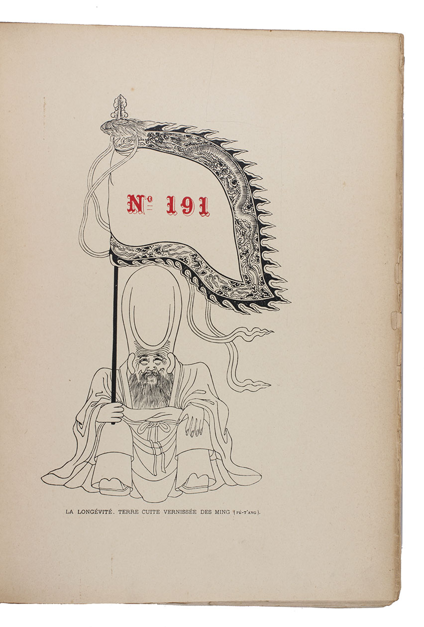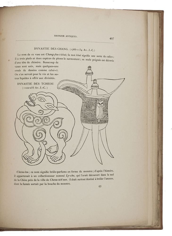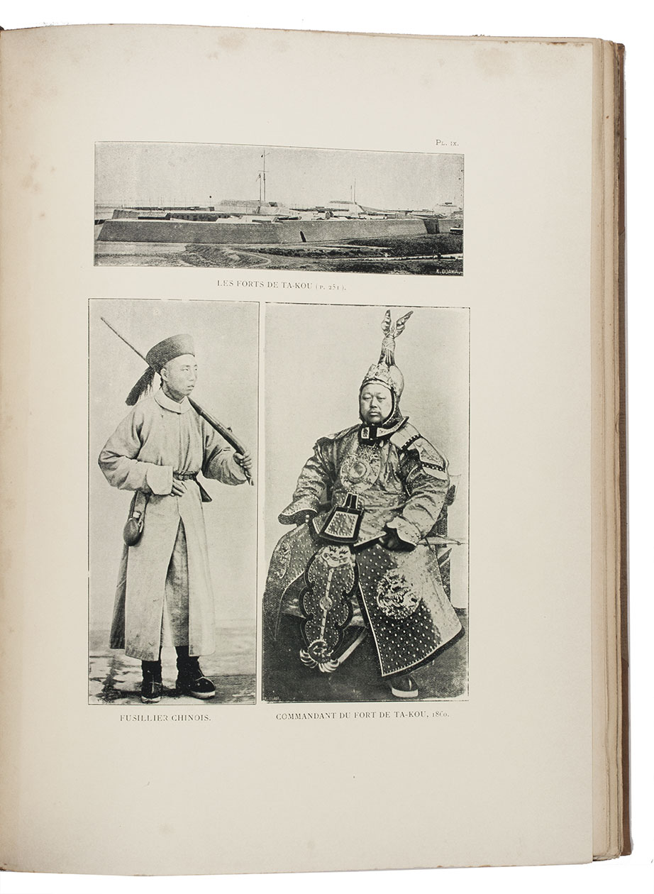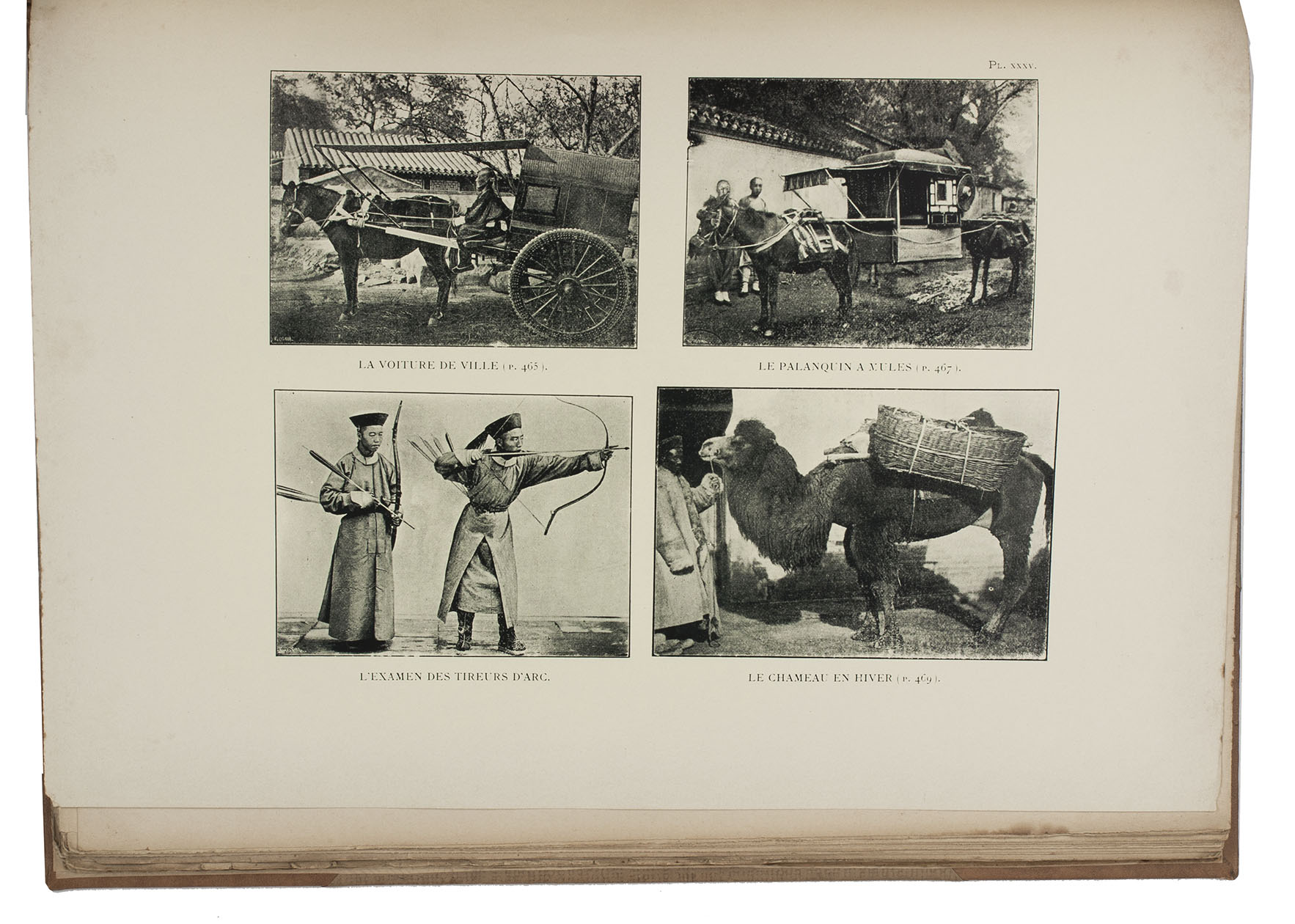 Peking, Imprimerie des Lazaristes au Pe-Tang, 1897. 35.5 x 25.5 cm. 2 volumes bound as 1 (continuous page numbers). With a frontispiece to each part, 51 plates with photolithographs and collotypes, 1 tinted map, and 660 wood engraved illustrations in text. Modern half cloth, with the original wrappers bound in. XII [4], 336, [4], 337-“562” [= 552], [2] pp.