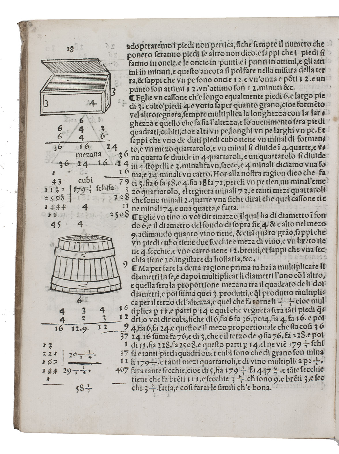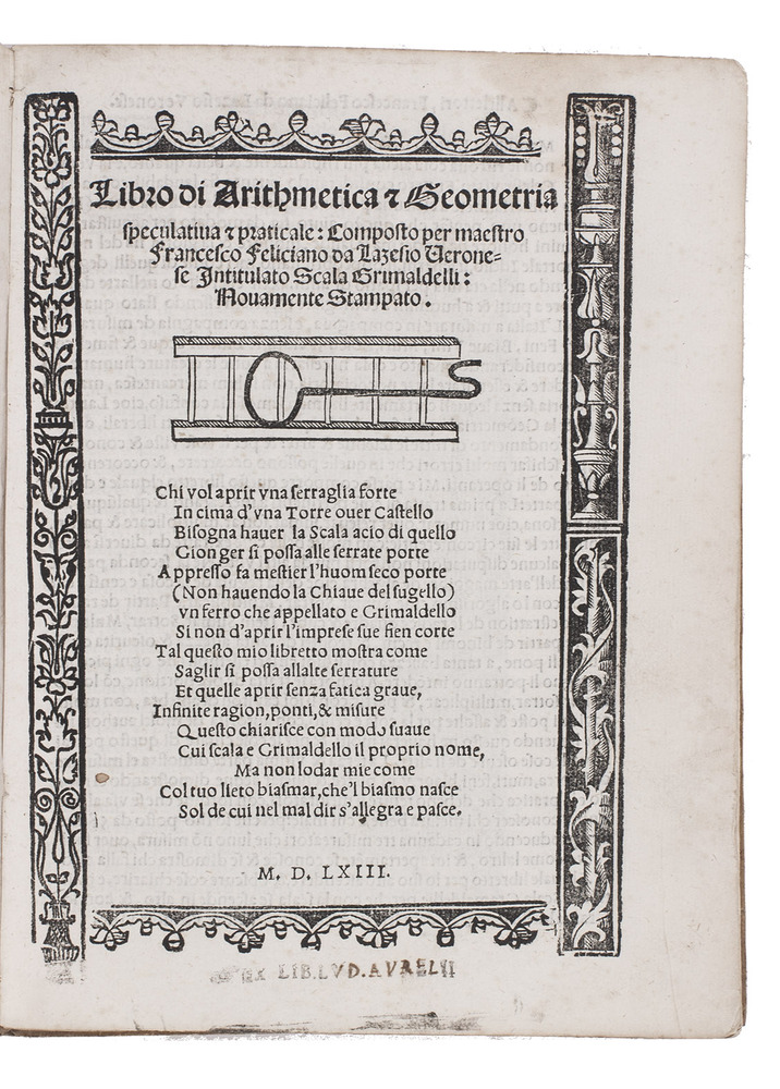 1563 edition of a popular Italian treatise on arithmetic and geometry by the Italian mathematician Fransesco Feliciano da Lazesio (1570-1542). First published in 1526 at Venice, it became immensely popular and went through many, revised editions, the present edition probably being the 8th. It is divided into three parts, starting with an introduction, followed by a part on arithmetic and roots and a part on practical geometry and measurements. When first published it was the first book describing the use of the surveyor's cross, an innovative tool at a time when long distances were often merely estimated by sight. "Few books had greater influence on the subsequent teaching of elementary mathematics" (Smith).