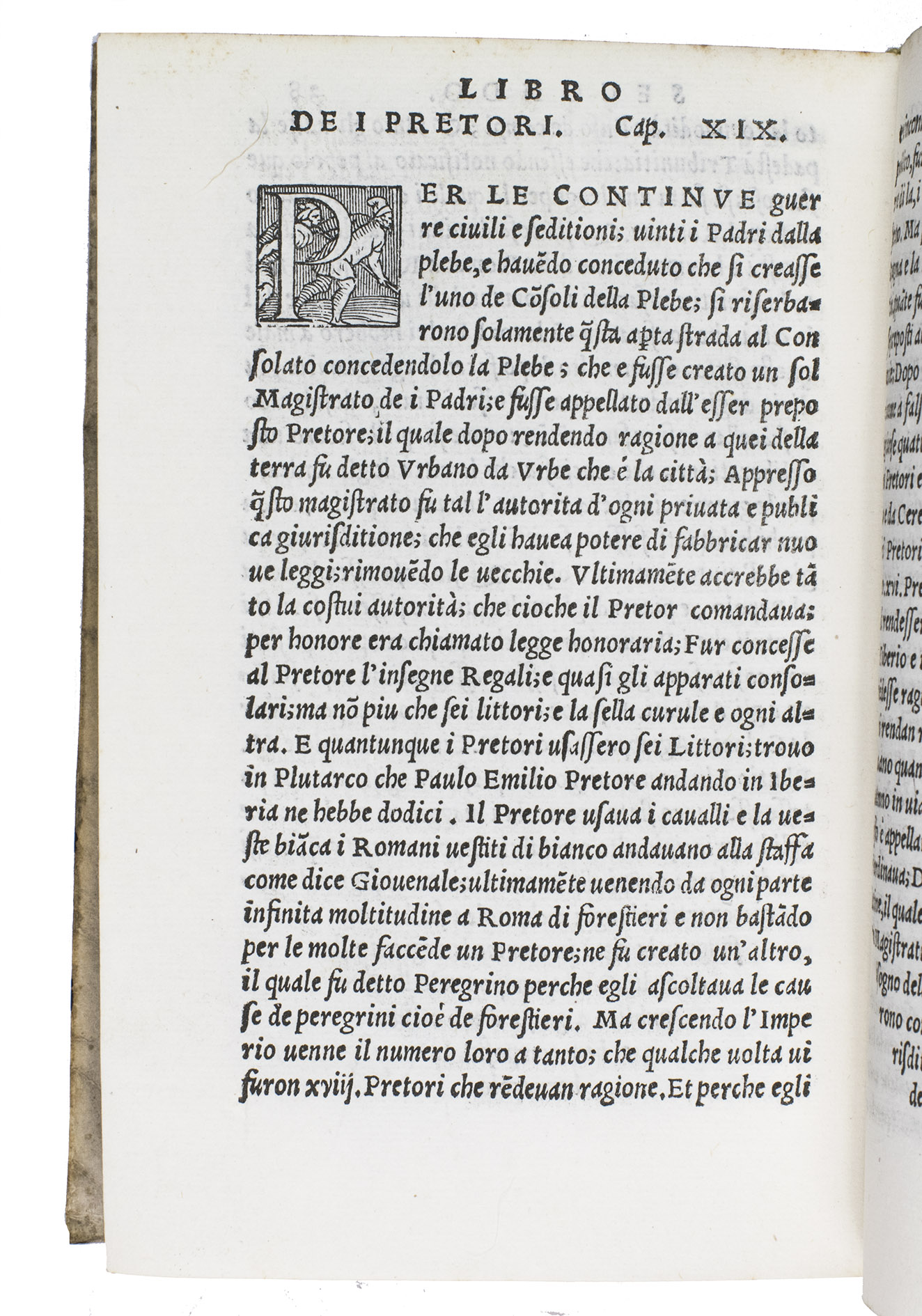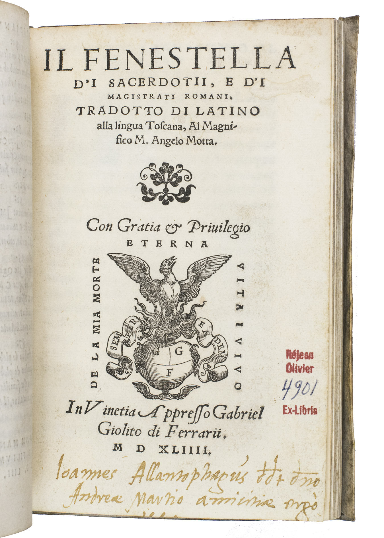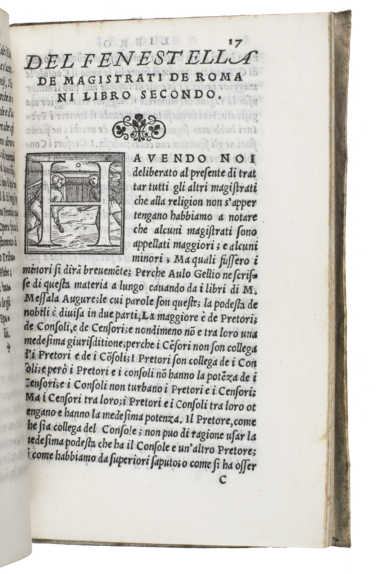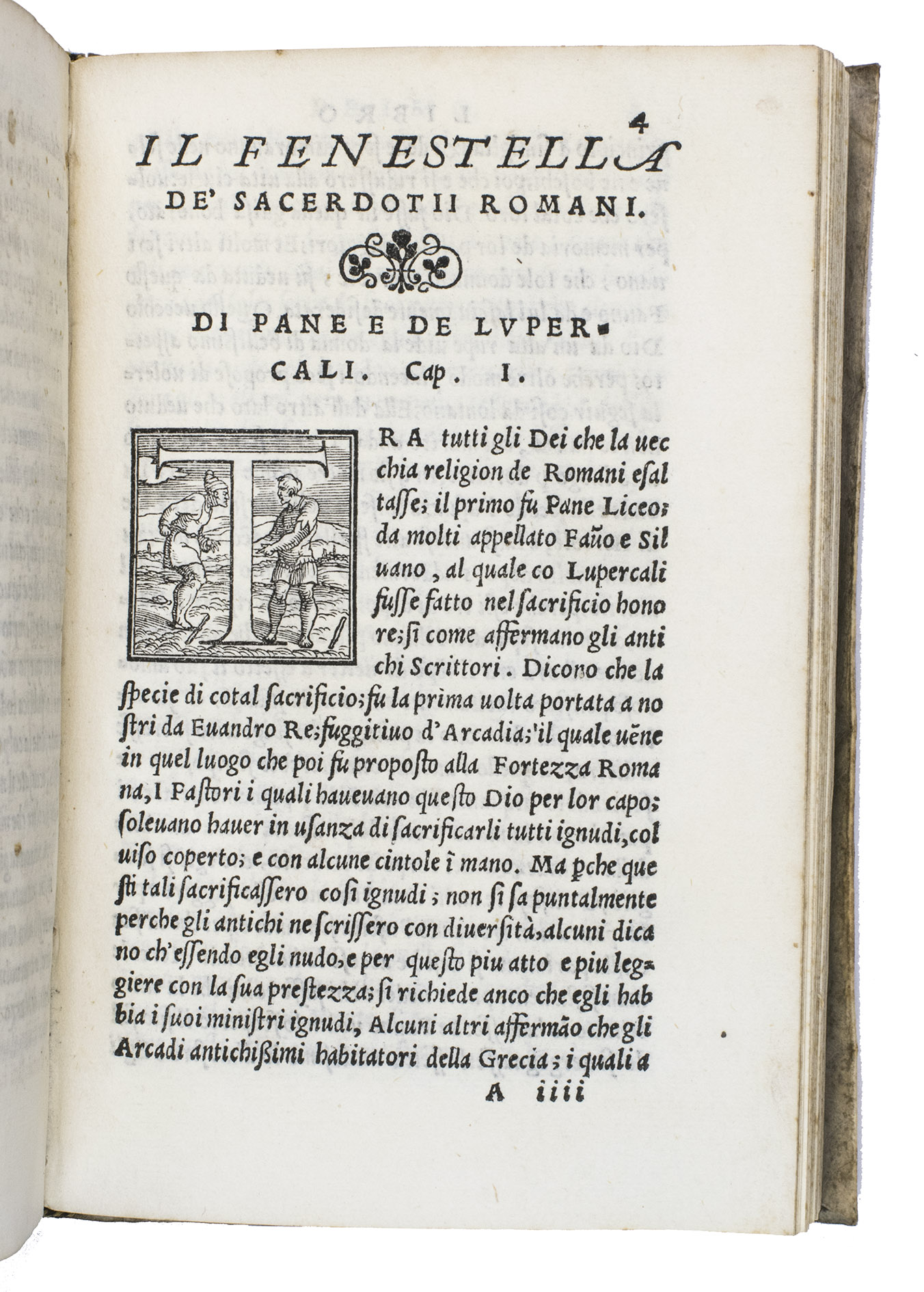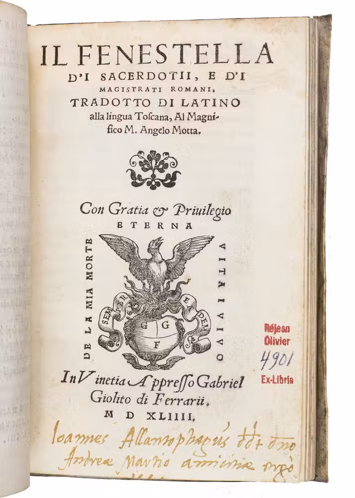 First Italian edition of a dissertation on the priests and magistrates of ancient Rome, with 42 beautiful woodcut initials depicting sports, different professions, and pastimes. Until 1561, it was believed that the work was an ancient Roman text written by Lucius Fenestella, but it was actually written by the Italian humanist Andrea Domenico Fiocco (or Floccus, died 1452) in the 15th century. The text was later translated by humanist Francesco Sansovino (1521-1586). The present work is the first edition of this translation. It is of particular interest, however, because of the initial H on the recto of leaf 17 depicting Jeu de Paume, an early type of tennis, 11 years before the publication of the famous first book on various ballgames by Antonio Scaino in 1555.