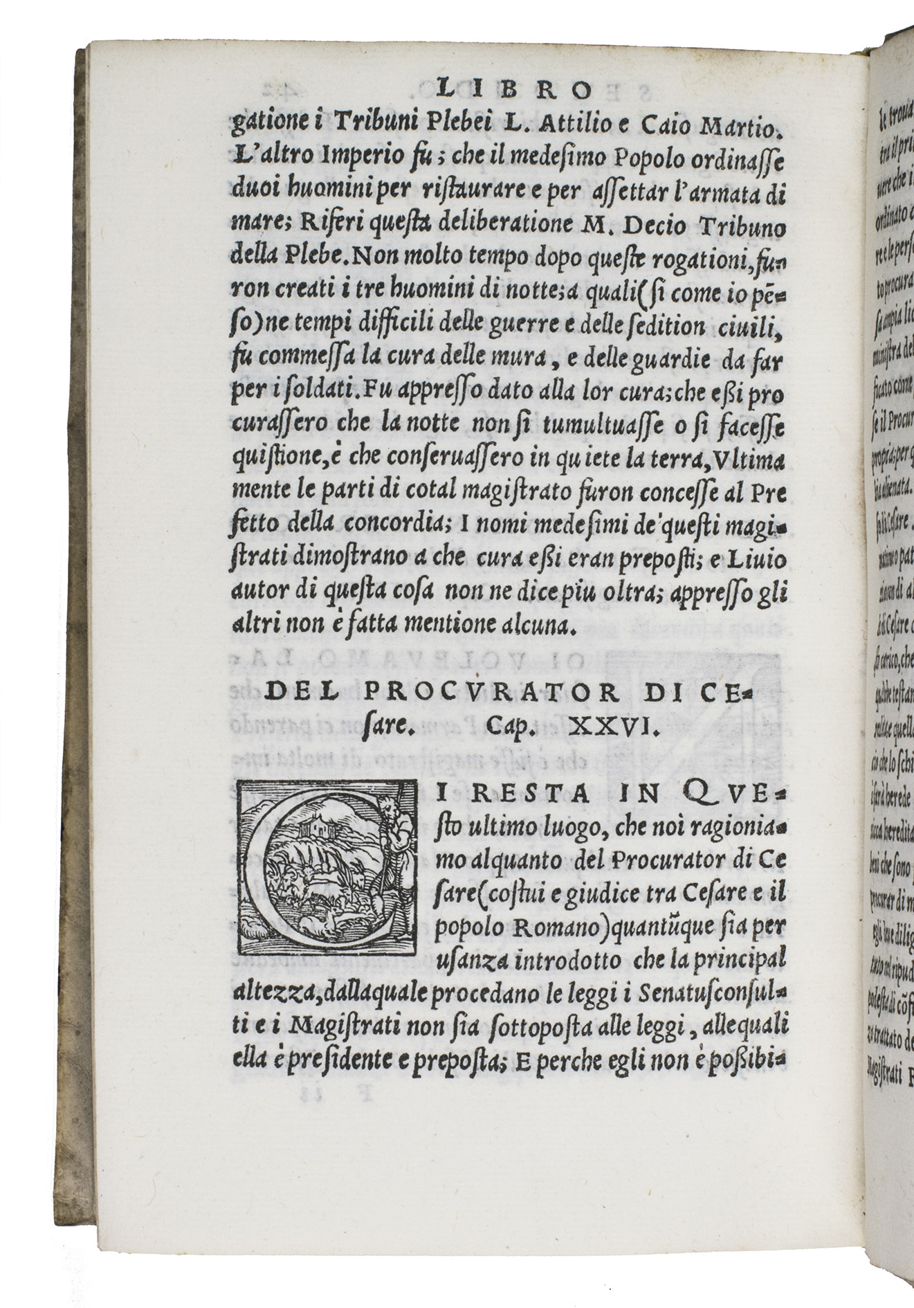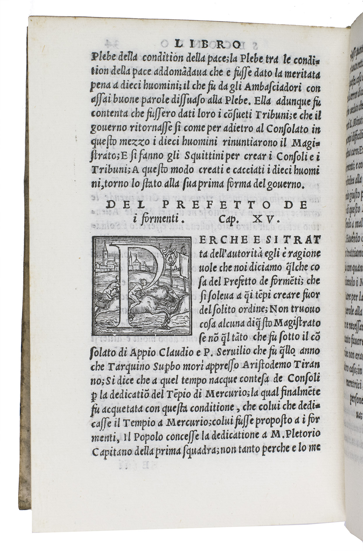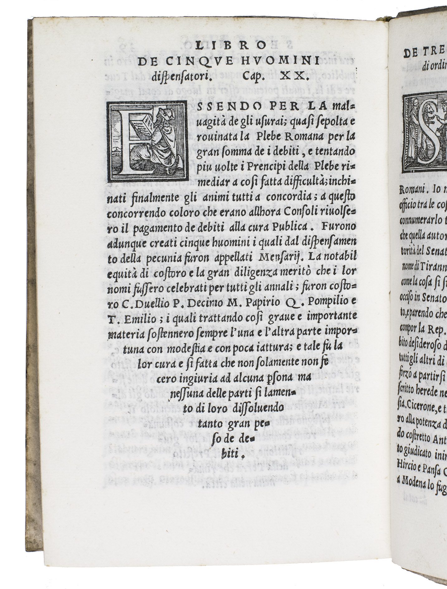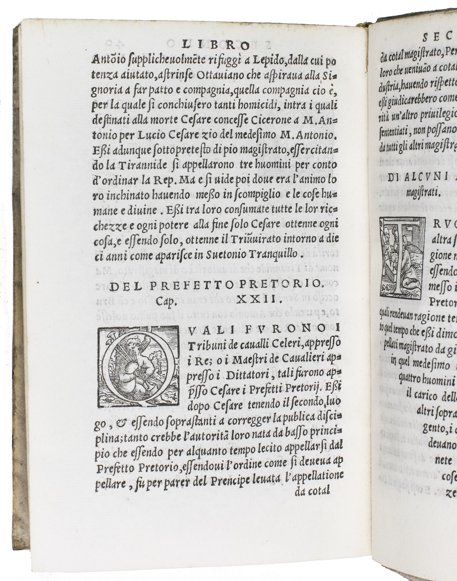 First Italian edition of a dissertation on the priests and magistrates of ancient Rome, with 42 beautiful woodcut initials depicting sports, different professions, and pastimes. Until 1561, it was believed that the work was an ancient Roman text written by Lucius Fenestella, but it was actually written by the Italian humanist Andrea Domenico Fiocco (or Floccus, died 1452) in the 15th century. The text was later translated by humanist Francesco Sansovino (1521-1586). The present work is the first edition of this translation. It is of particular interest, however, because of the initial H on the recto of leaf 17 depicting Jeu de Paume, an early type of tennis, 11 years before the publication of the famous first book on various ballgames by Antonio Scaino in 1555.