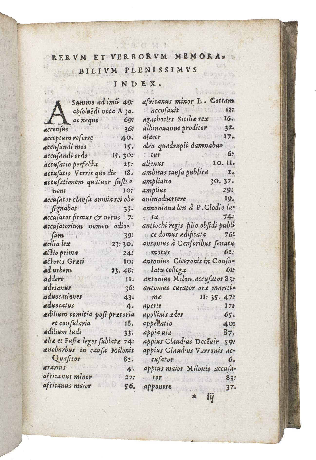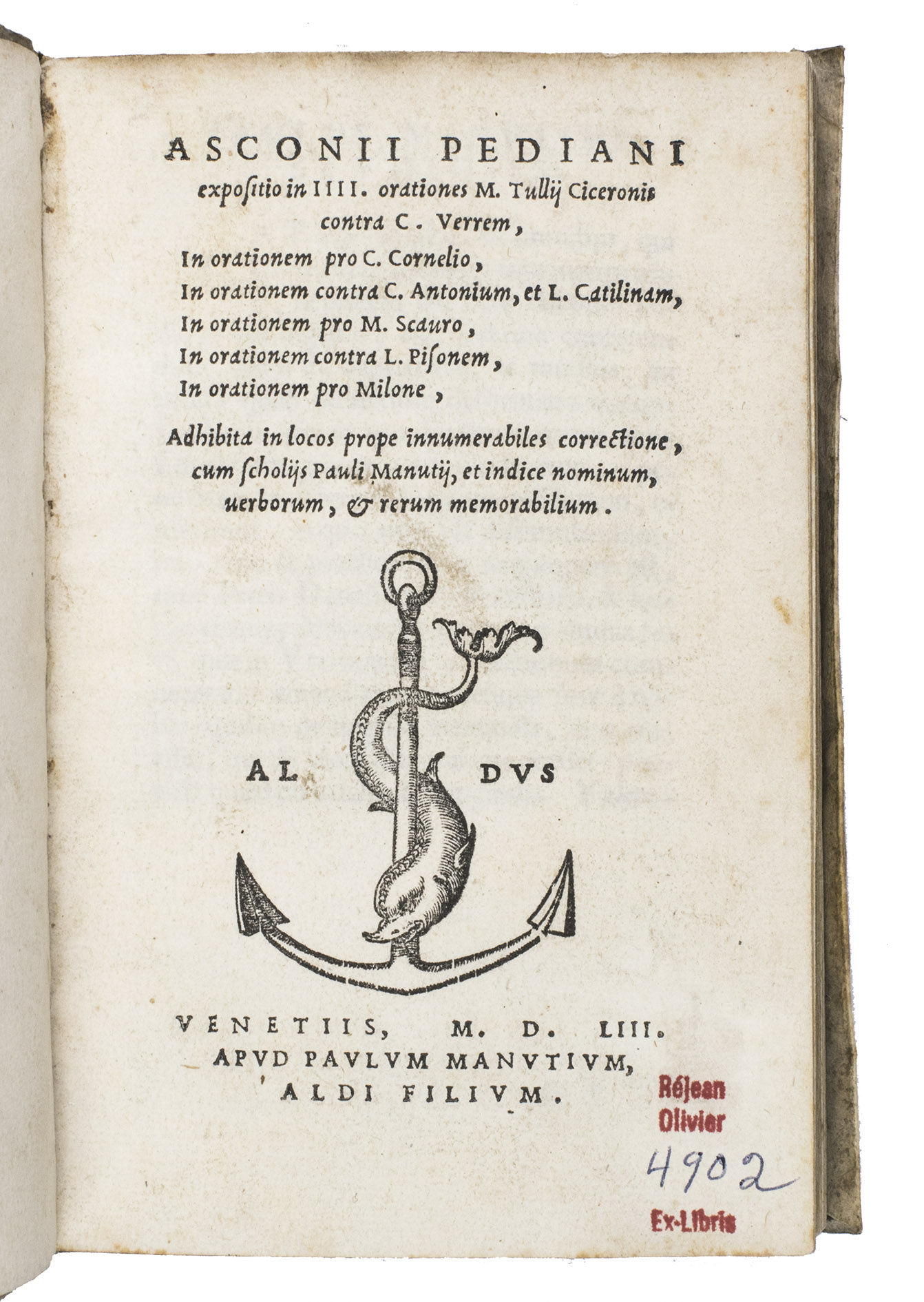 The second work in this volume is the third Aldine edition of a classical commentary on seven Ciceronian speeches, written by Quintus Asconius Pedanius (9 BCE-76 CE) for didactic purposes. The present edition was corrected and printed by Paulus Manutius (1512-1574), the son of Aldus Manutius, who was a scholar who specialised in Cicero.