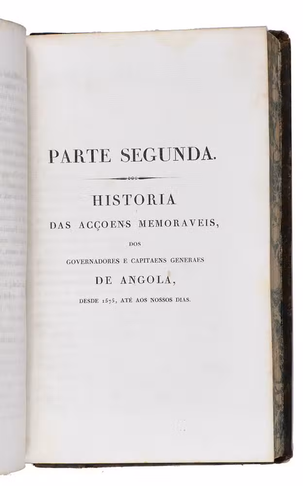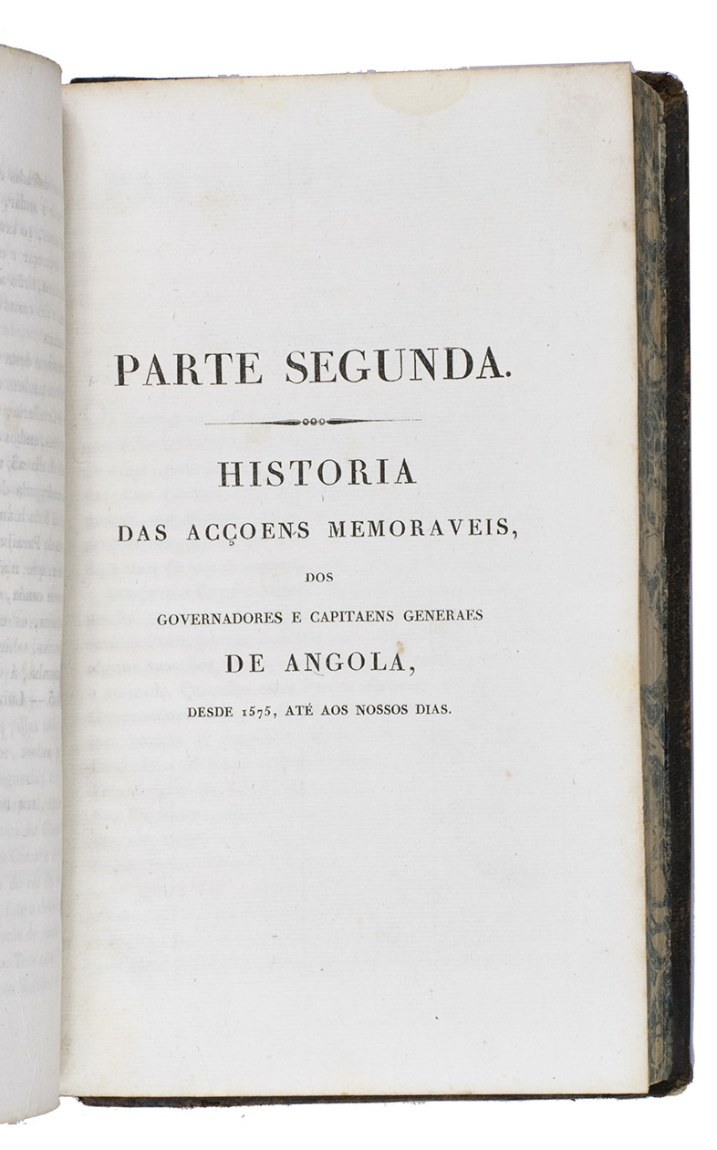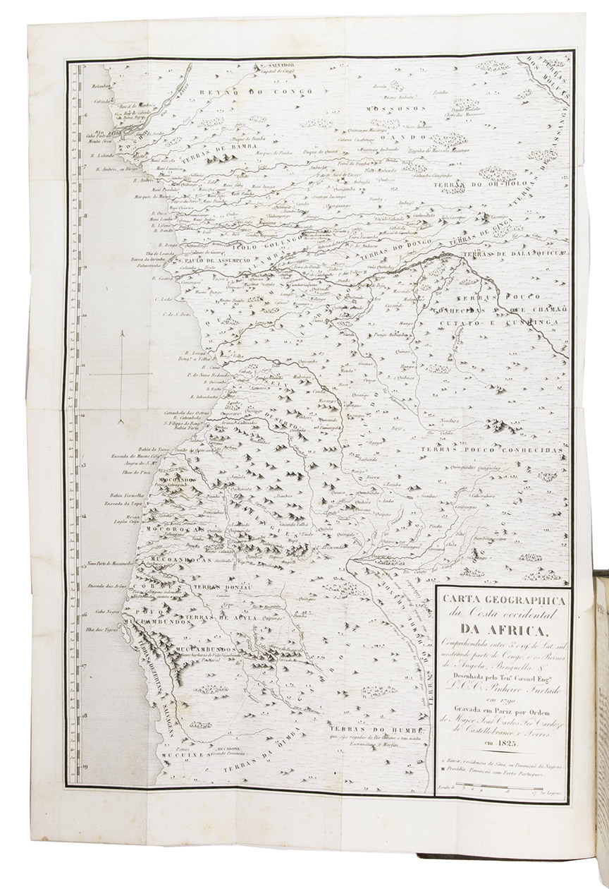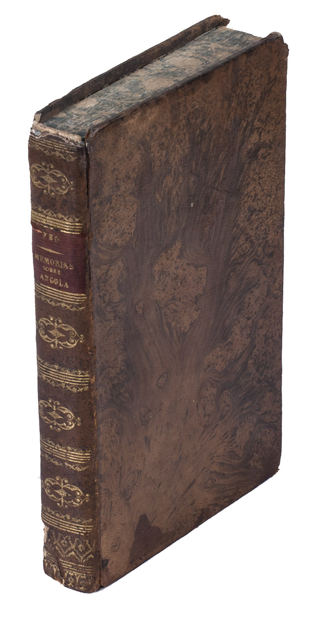 Head and foot of the spine and corners of the boards show some signs of wear. Browning of the margins of the endleaves. Slightly waterstained in the top margin throughout. The folding map is very slightly foxed and has a small, partially repaired tear at the hinge. The separately published folding plate, with a view of the Angolan capital Luanda, is not present in the majority of the copies, including this one. Otherwise in good condition. Innocencio III, p. 339 and X p. 204; Porbase 170279 (4 copies BnP); WorldCat 1203706605, 1327740981, 252289753, 43082127, 431315021, 457275564, 560032852, 561454767, 69349052 (11 copies); cf. Corada J., The Rise of a new consciousness: early Euro-African voices of dissent in colonial Angola. In: e-JPH, vol. 5, no. 2, winter 2007; Figueiredo, E. and Smith G. F., Joaquim José da Silva (c. 1755-1810): his life, natural history collecting activities, and involvement in the so-called first scientific expedition in the interior of Angola. In: Candollea 76 (1), 2021; Madeira Santos, C., Administrative knowledge in a colonial context: Angola in the eighteenth-century. In: British journal for the history of science, 43 (4), 2010.