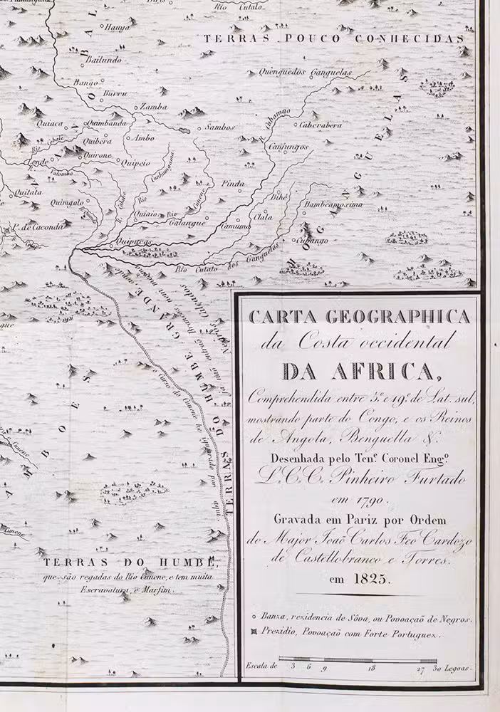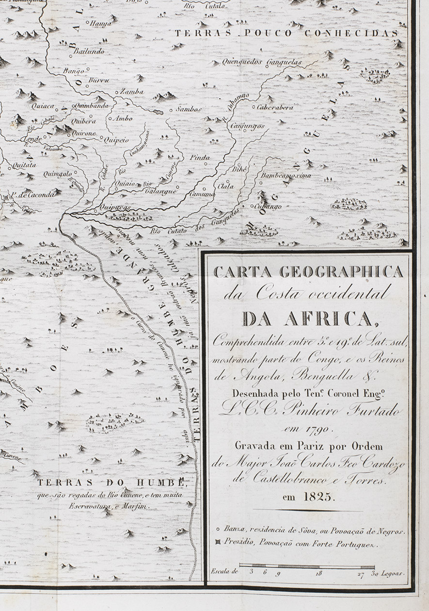 Angola was a part of the Portuguese Empire almost continuously from 1655-1975. The current capital, Luanda, was originally a Portuguese settlement founded in 1576. Since the Portuguese were primarily in Angola for the slave trade, the colony was initially not expanded beyond Luanda and a fort in the bay of Benguela in the south. The region was therefore hardly explored. As foreign interest for Angola grew, and Luanda was even in Dutch hands from 1640-1648, the Portuguese realised they needed to expand to be able to defend it. Different governors enlisted the help of cartographers to explore the region. Governor José de Almeida e Vasconcellos de Soveral e Carvalho, who held this position from 1784-1790, employed the help of Lieutenant Colonel Luís Cândido Cordeiro Pinheiro Furtado (1749-1822), a military engineer and cartographer, and Joaquim José da Silva (1755-1810), a naturalist who had travelled through Angola extensively for his research. The two men joined two missions in 1785, with the goal to explore Angola further and secure more territory. During the journey, Pinheiro Furtado charted the whole coast and made a map of the country based on verbal information of soldiers and explorers. This map, finished in 1790, is included in Memorias contendo a biographia.