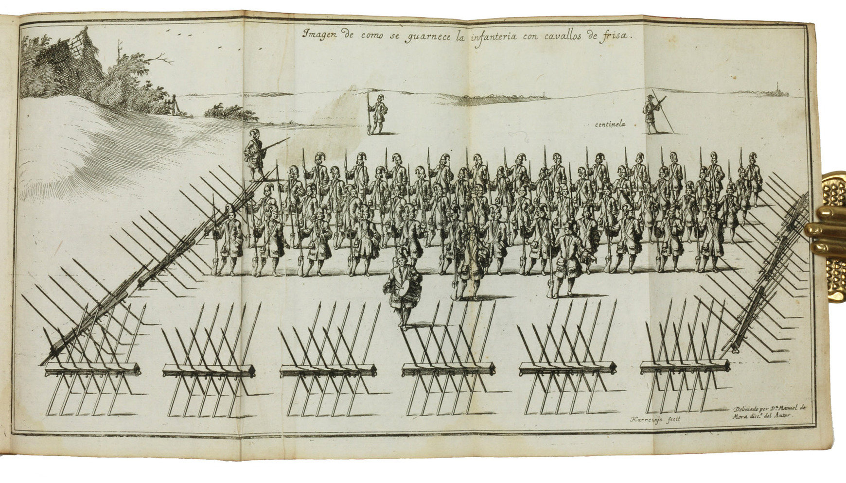 With a late-18th-century owners inscription by the artillery officer António Henrique Banazol de Ataíde e Campos on the half-title. Later in the famous Ashburnham library assembled by Bertram Ashburnham, 4th Earl of Ashburnham (1797-1878), with his purple ink shelfmark ("26.E") and note "Catal. M 1859" on the inside of the front board. The collection was dispersed by the 5th Earl and this book was acquired by Thomas Fremantle, 3rd Baron Cottesloe (1862-1956), commander of the Territorial Army and president of the Society for Army History Research (purchased from Pickering & Chatto, 25 August 1899), with his armorial bookplate pasted on the front pastedown. Boards slightly bowed, minor marginal tears in plates professionally repaired, the pastedowns have lifted from the boards, and an early owner has used the underside of that at the back to make a pencil sketch of a church. Otherwise in good condition. Palau 89222; Peeters Fontainas 449 (3 copies); STCV 12912060 (1 copy); cf. WorldCat 776498690/1121531321 (1 copy at the BNE, only the 9 plates).