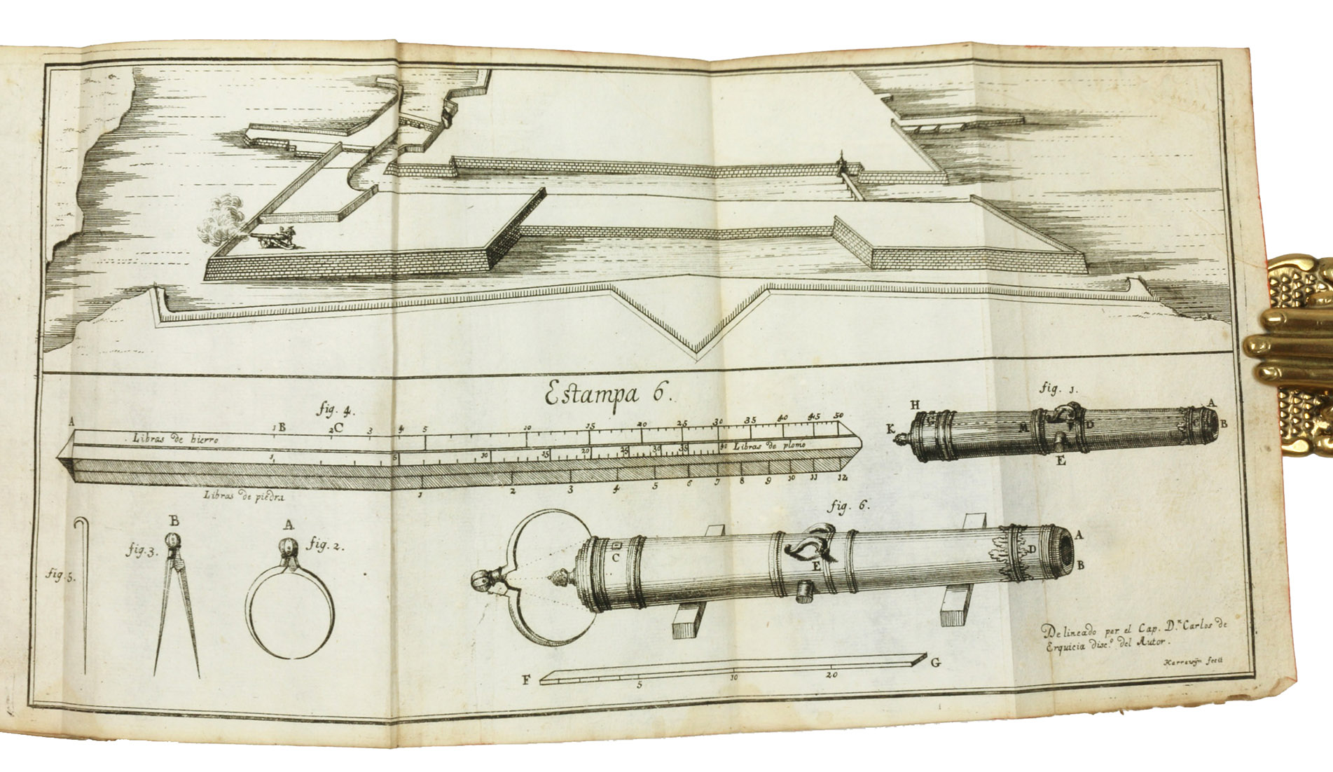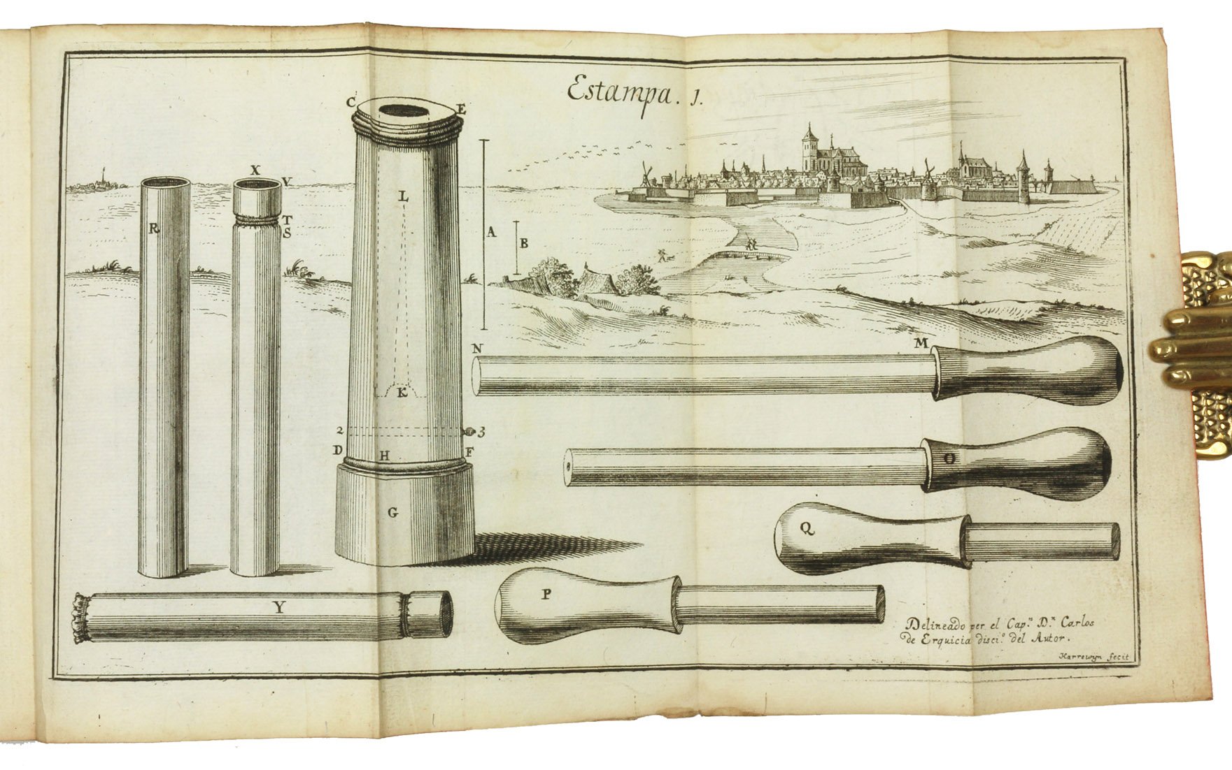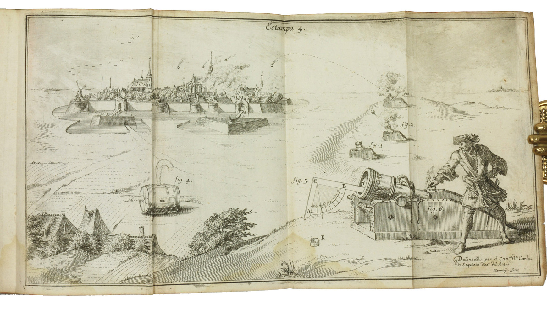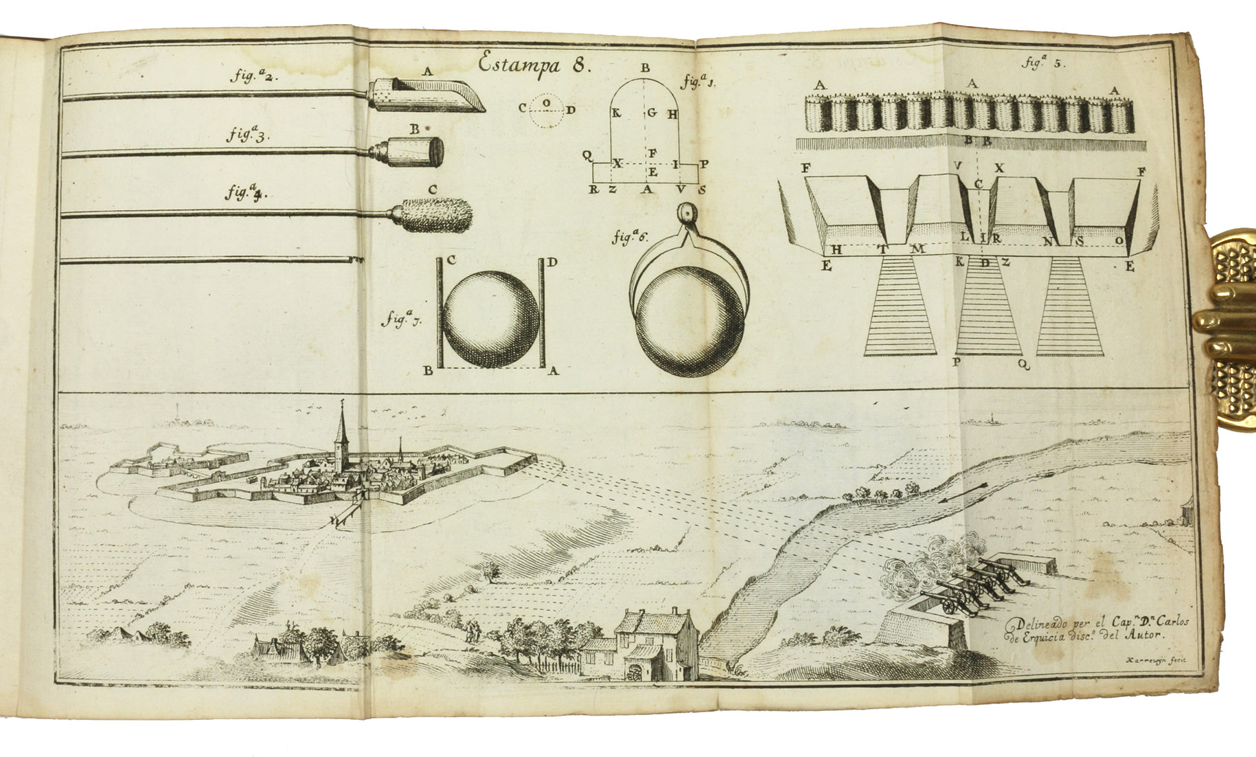 First edition, in the original Spanish, of a rare manual for artillery warfare by the military engineer and general Fernández de Medrano (1646-1705), incorporating material from his 1691 El perfecto bombardero y práctico artillero and his 1680 El prático artillero. The Verdussen printing and publishing office in Antwerp brought out a second and third edition in 1708 and 1723, which are equally rare. The charming plates, drawn by some of de Medrano's students, were engraved by the Dutch artist Jacobus Harrewijn (1660-1727), active in Brussels from 1695 to 1714. They depict ordnance and munitions, as well as towns under heavy artillery fire.