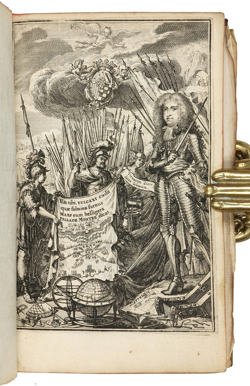 Brussels, Lambert Marcht, 1699. 8vo. With an engraved frontispiece and 9 numbered folding engraved plates. Contemporary vellum with a later black spine label lettered in gold, red edges. [1], [1 blank], [1], [2 blank], [13], “66” [= 196], [4] pp.