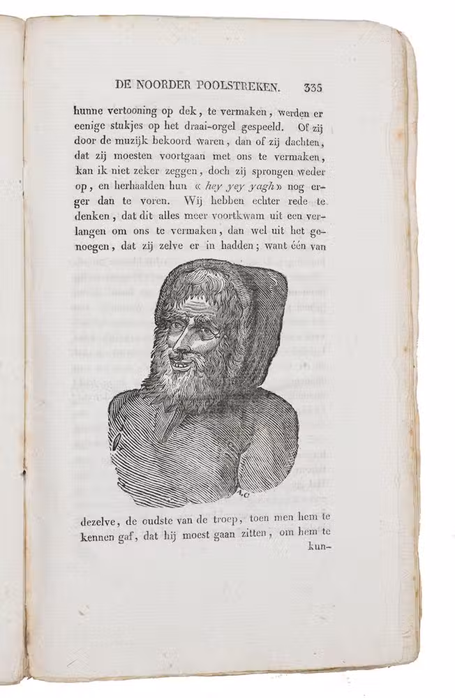 Dordrecht, Blussé and Van Braam, 1822. 8vo. With a folding map of the Northwest Territories or Nonavut (Canada), including the Melville Island, and 2 engravings in the text of a musk ox and an Eskimo. Modern sprinkled orange paper over thin boards with a modern spine label with printed title. [4], 364 pp.