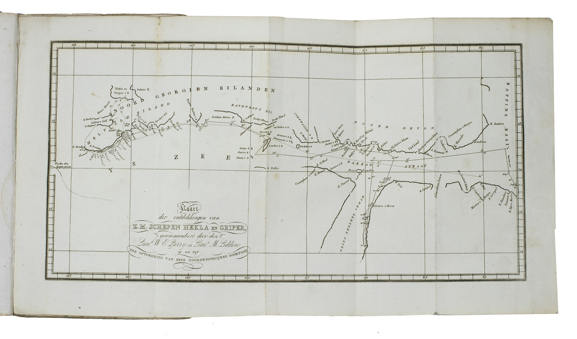 The rare first edition of Johannes Lehman de Lehnsfelds Dutch translation of the fourth enlarged edition of Fishers English travel journal: A journal of a voyage of discovery to the Arctic regions, in His Majesty's ships Hecla and Griper, in the Years 1819 & 1820, by the ships surgeon Alexander Fisher. This is an account of the first voyage commanded by the famous explorer of the Arctic Sir William Edward Parry (1790-1855) to search for the non-existent North West Passage. On his 1819 expedition, from May 1819 to late October 1820, he penetrated through the Parry Channel and Barrow's Strait as far as Melville Island (75° 30 N, 111° 30 W). Parry's voyage, which had taken him through the Parry Channel three quarters of the way across the Canadian Arctic Archipelago was probably the single most productive voyage in the quest for the Northwest Passage.