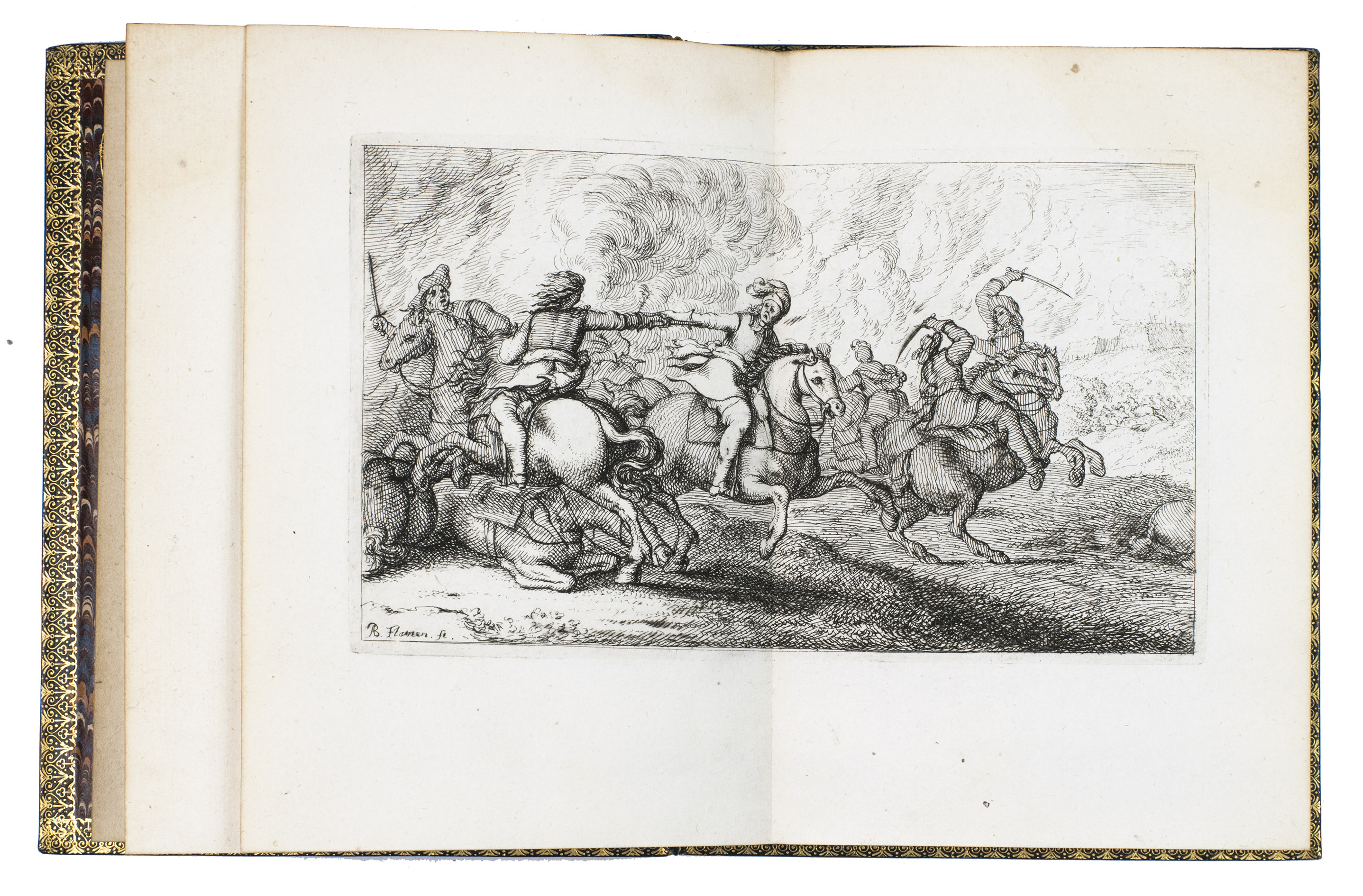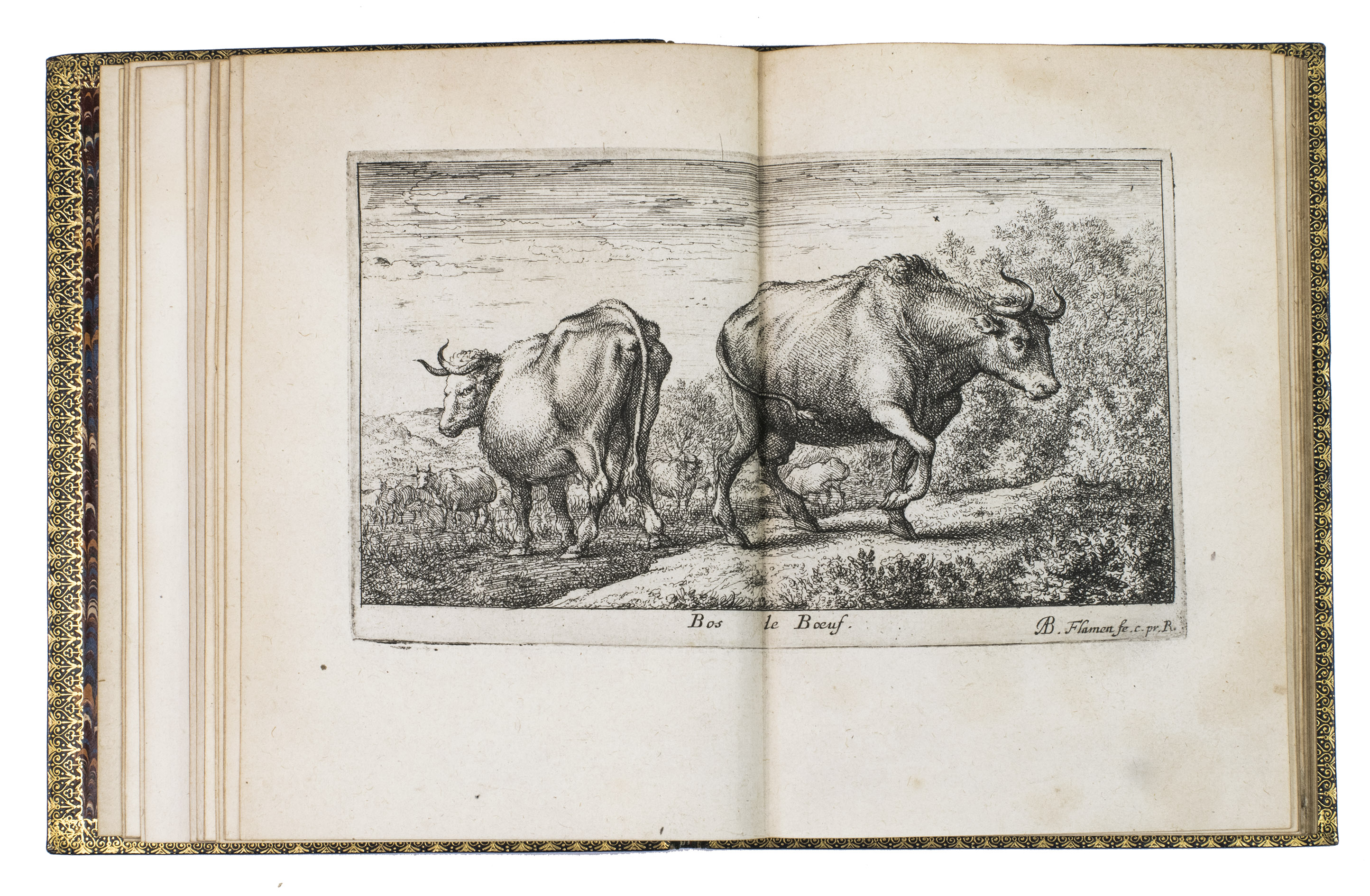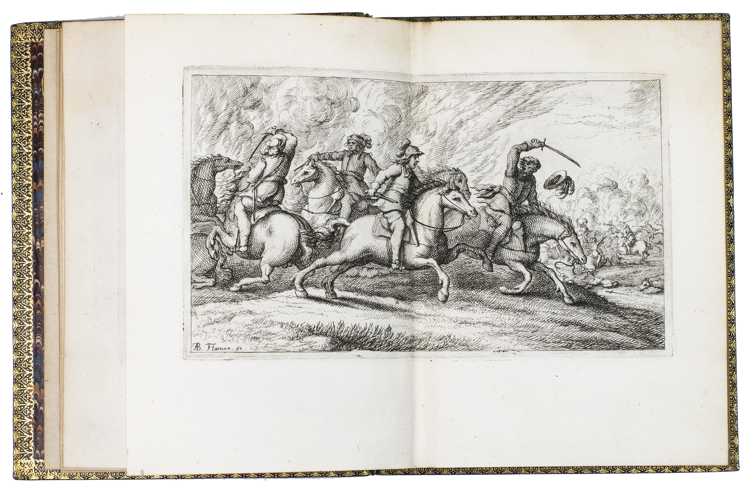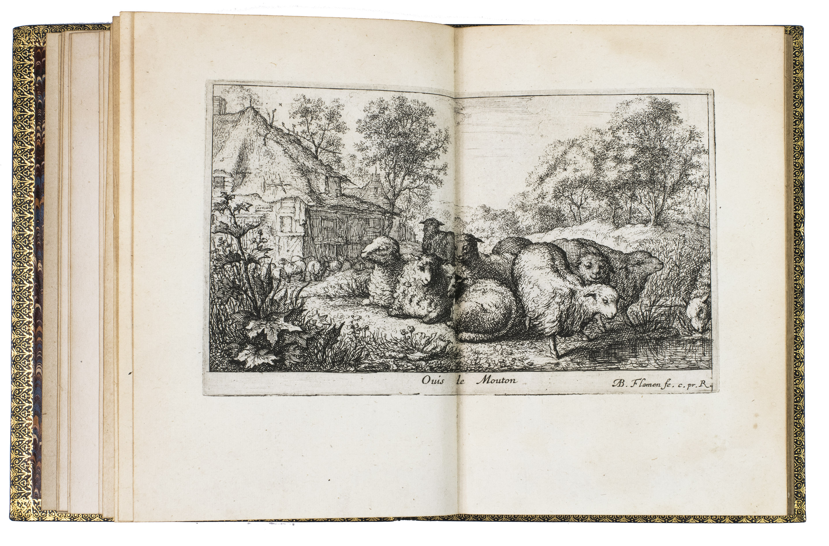With two gold-stamped morocco bookplates. With a faint stain in the upper right corner of the prints in series 3 and 4, but still in very good condition. The hinges are worn, but the binding is otherwise very good. Lovely and rare etchings, mostly in their earliest states, including three complete series. Bartsch V, Flamen 112-117 (ad 1), 093-095, 099-100, 103 (ad 3), 105-108 (ad 4), 110-111 (ad 5) and supp. 520-526 (ad 2); Robert-Dumesnil, Flamen 365-370 (ad 1); 382-388 (ad 2); 524-526, 530, 531, 534 (ad 3); 520-523 (ad 4); 561-562 (ad 5); www.corpusetampois.com/cae-17-flamen1664longuetoise.html (ad 3); for Flamen: Thieme & Becker XII, pp. 66-67.
