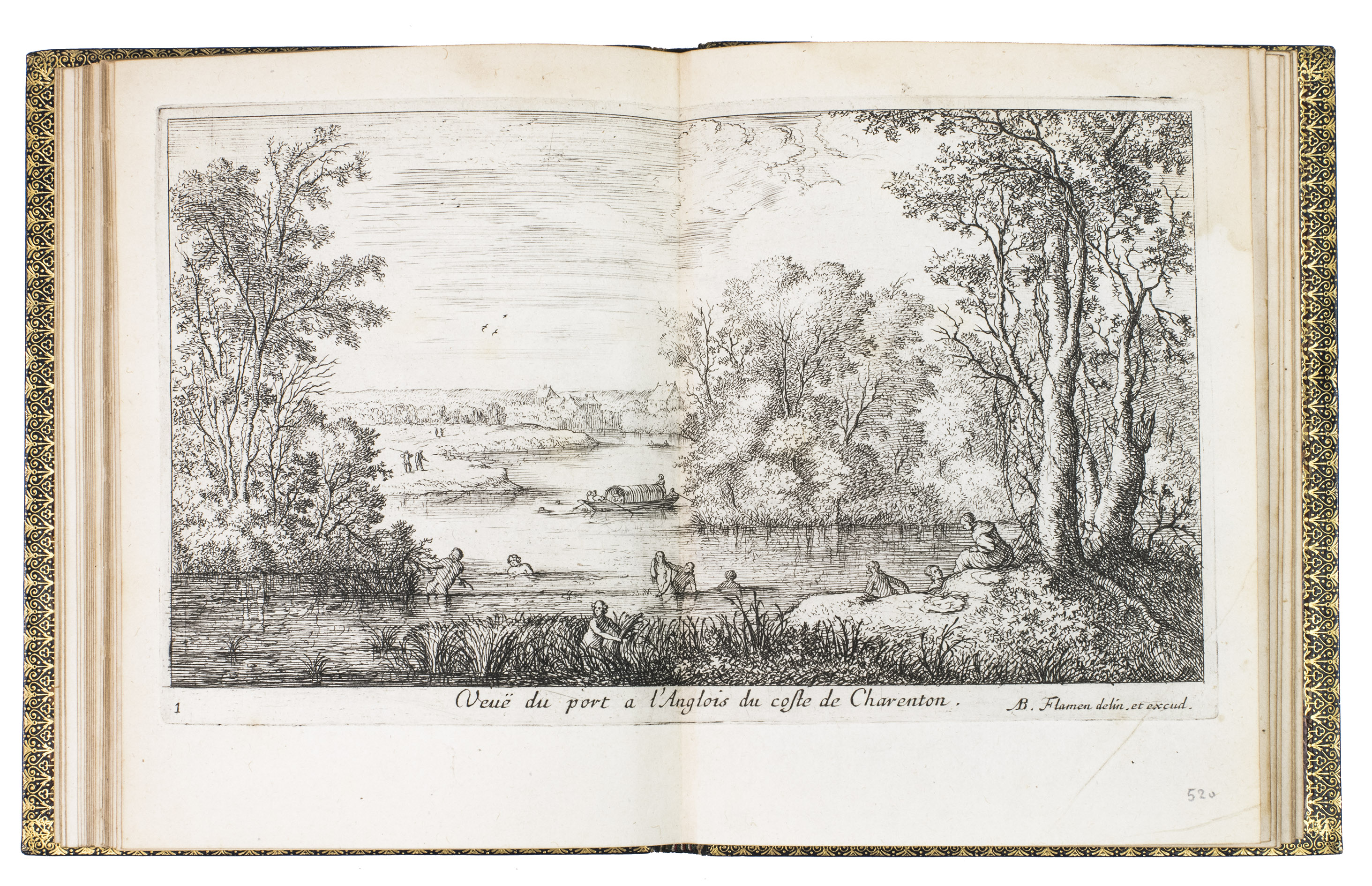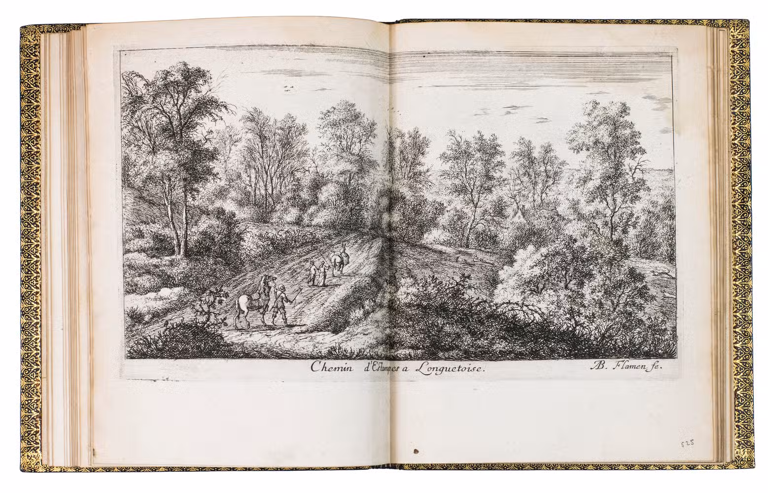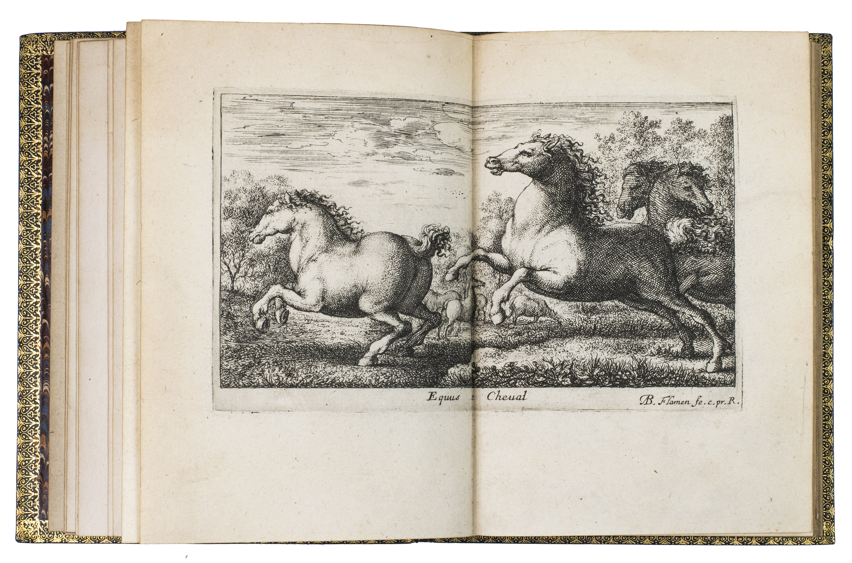 With two gold-stamped morocco bookplates. With a faint stain in the upper right corner of the prints in series 3 and 4, but still in very good condition. The hinges are worn, but the binding is otherwise very good. Lovely and rare etchings, mostly in their earliest states, including three complete series. Bartsch V, Flamen 112-117 (ad 1), 093-095, 099-100, 103 (ad 3), 105-108 (ad 4), 110-111 (ad 5) and supp. 520-526 (ad 2); Robert-Dumesnil, Flamen 365-370 (ad 1); 382-388 (ad 2); 524-526, 530, 531, 534 (ad 3); 520-523 (ad 4); 561-562 (ad 5); www.corpusetampois.com/cae-17-flamen1664longuetoise.html (ad 3); for Flamen: Thieme & Becker XII, pp. 66-67.