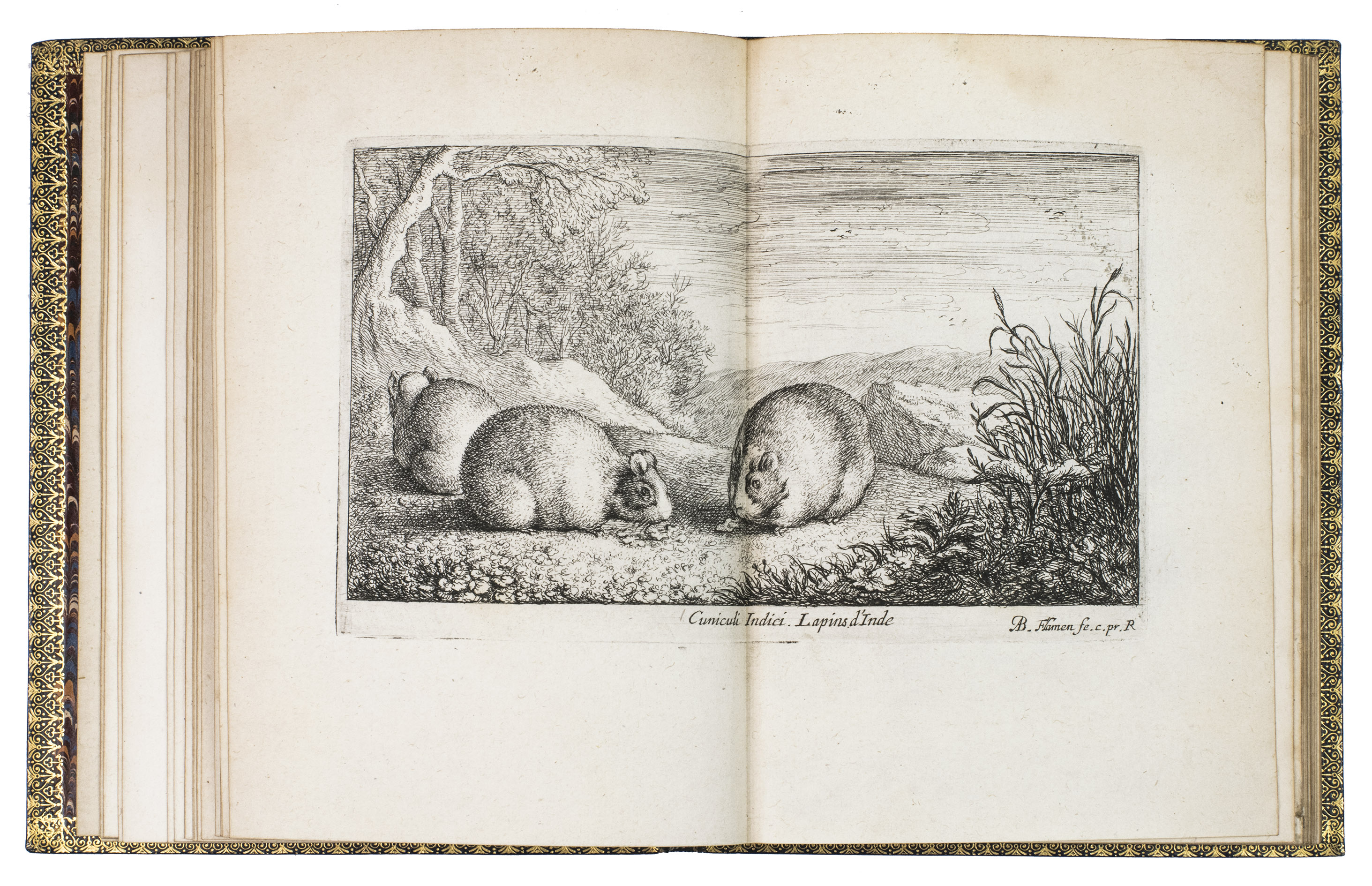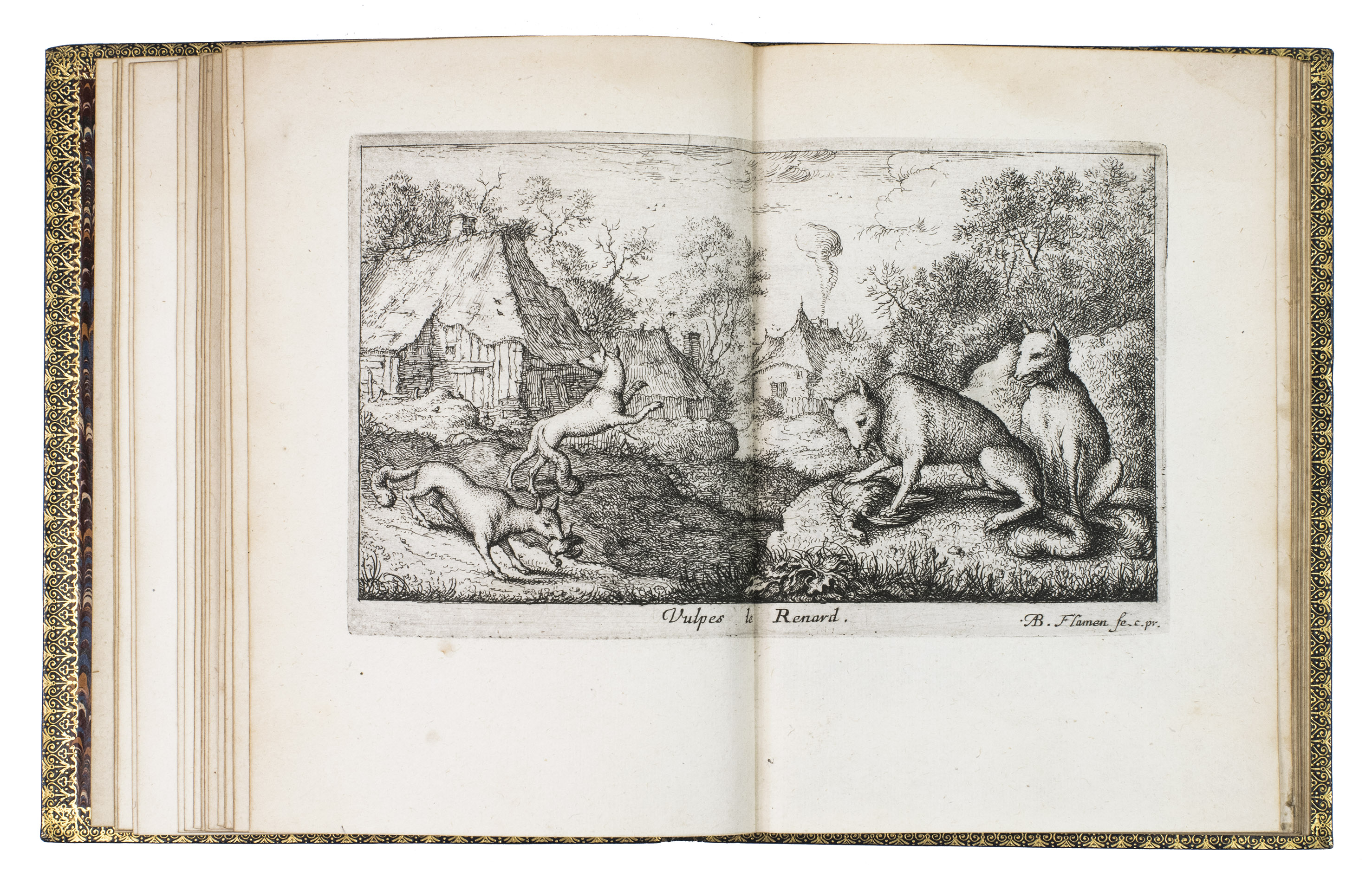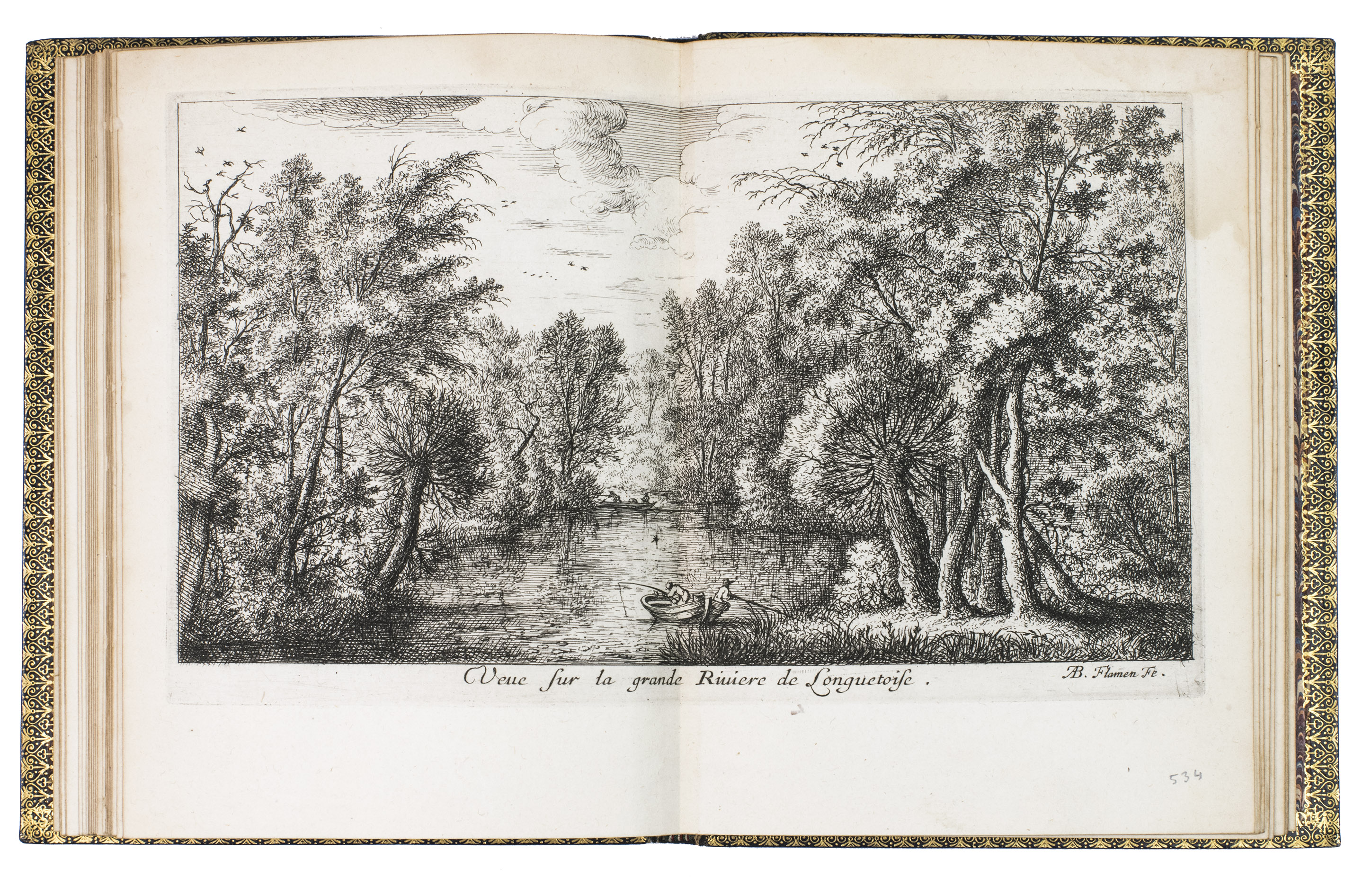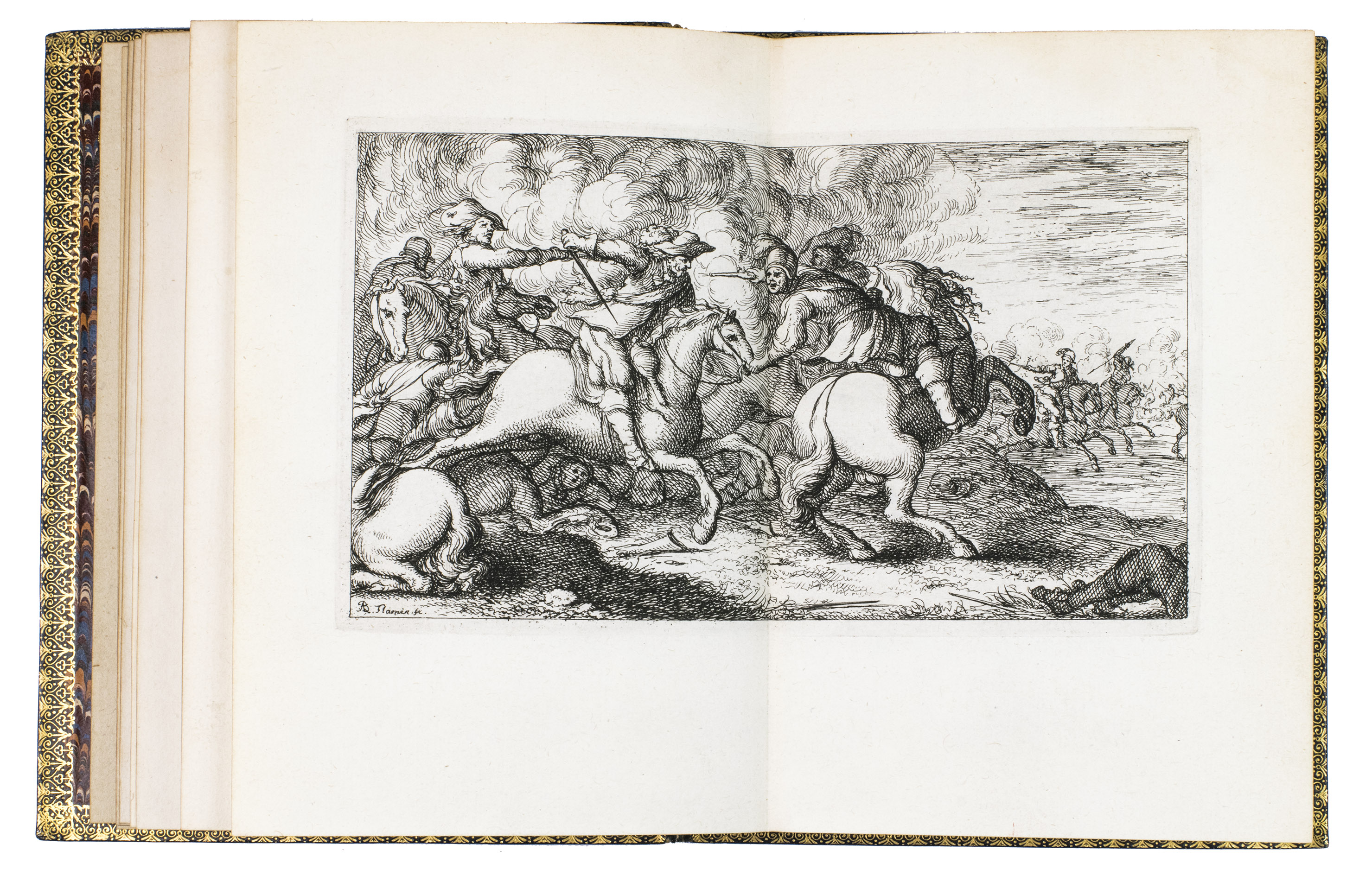 With two gold-stamped morocco bookplates. With a faint stain in the upper right corner of the prints in series 3 and 4, but still in very good condition. The hinges are worn, but the binding is otherwise very good. Lovely and rare etchings, mostly in their earliest states, including three complete series. Bartsch V, Flamen 112-117 (ad 1), 093-095, 099-100, 103 (ad 3), 105-108 (ad 4), 110-111 (ad 5) and supp. 520-526 (ad 2); Robert-Dumesnil, Flamen 365-370 (ad 1); 382-388 (ad 2); 524-526, 530, 531, 534 (ad 3); 520-523 (ad 4); 561-562 (ad 5); www.corpusetampois.com/cae-17-flamen1664longuetoise.html (ad 3); for Flamen: Thieme & Becker XII, pp. 66-67.
