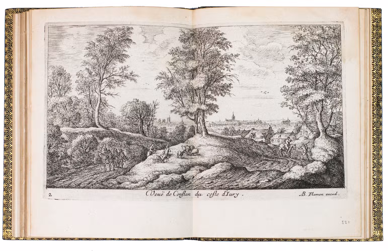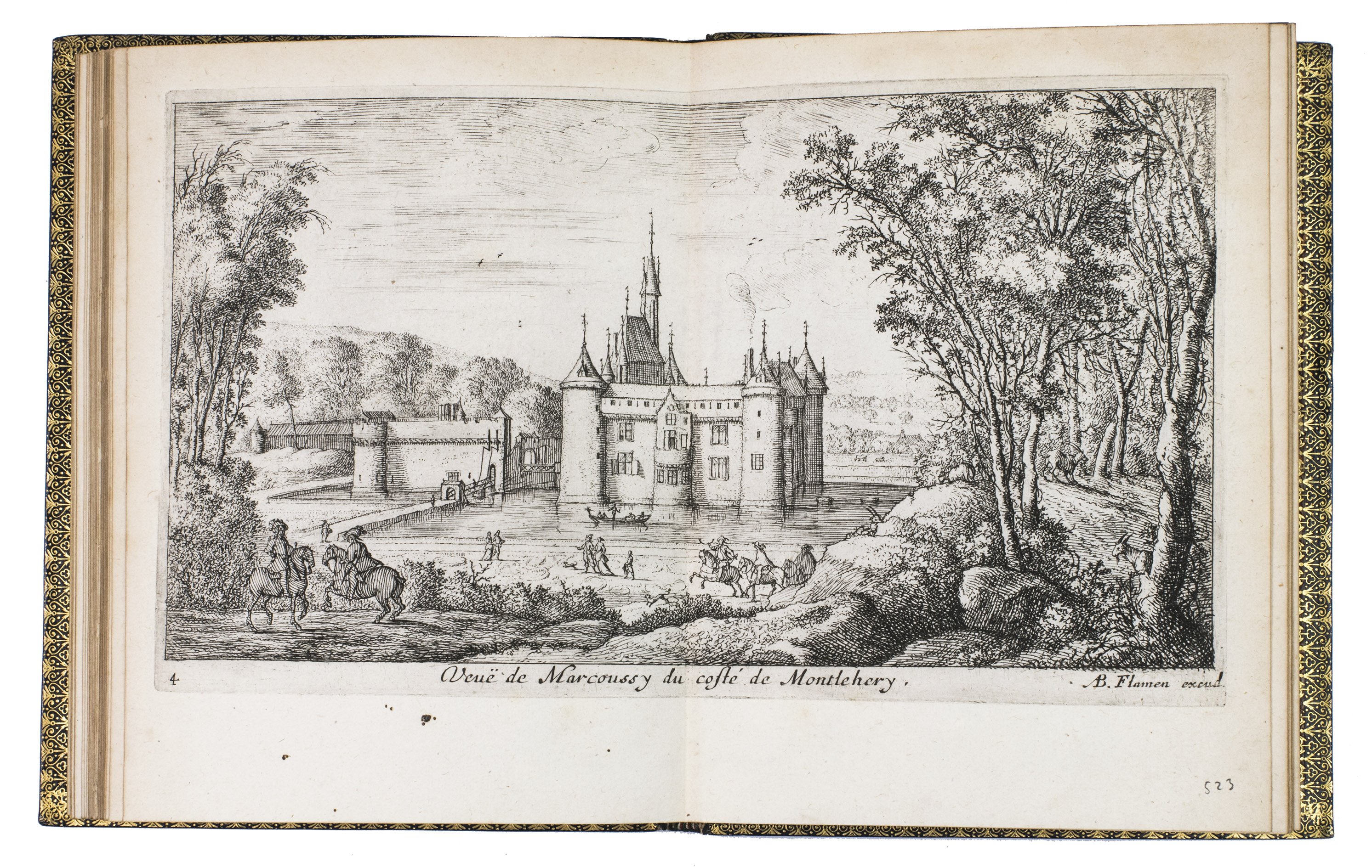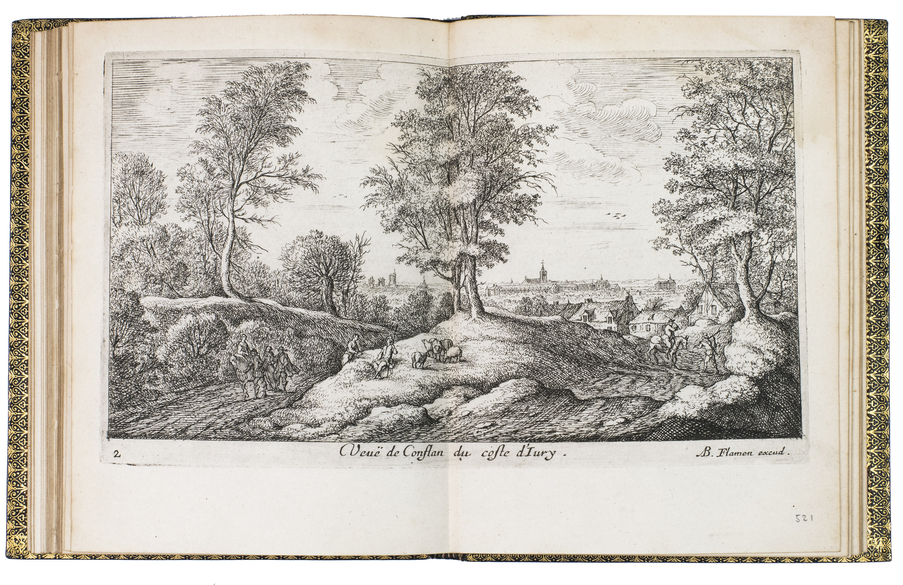 Paris, [Jacques Lagniet (ads 1, 3), Jacques van Merlen (ad 4), unknown publisher (ads 2, 5)], [ca. 1660]. Small 4to (16.5 x 13 cm). Five series of small oblong folio etched views (16 x 21.5-23 cm; plate size: 10 x 17 to 12.5 x 21.5 cm), 3 complete, 1 incomplete and 1 documented only as separate prints. Each print folded to form a double leaf and mounted on a stub so that it can open flat. Gold-tooled, dark green goatskin morocco (ca. 1890). [6]; [7]; [6 of 12]; 4; [2] etched ll.