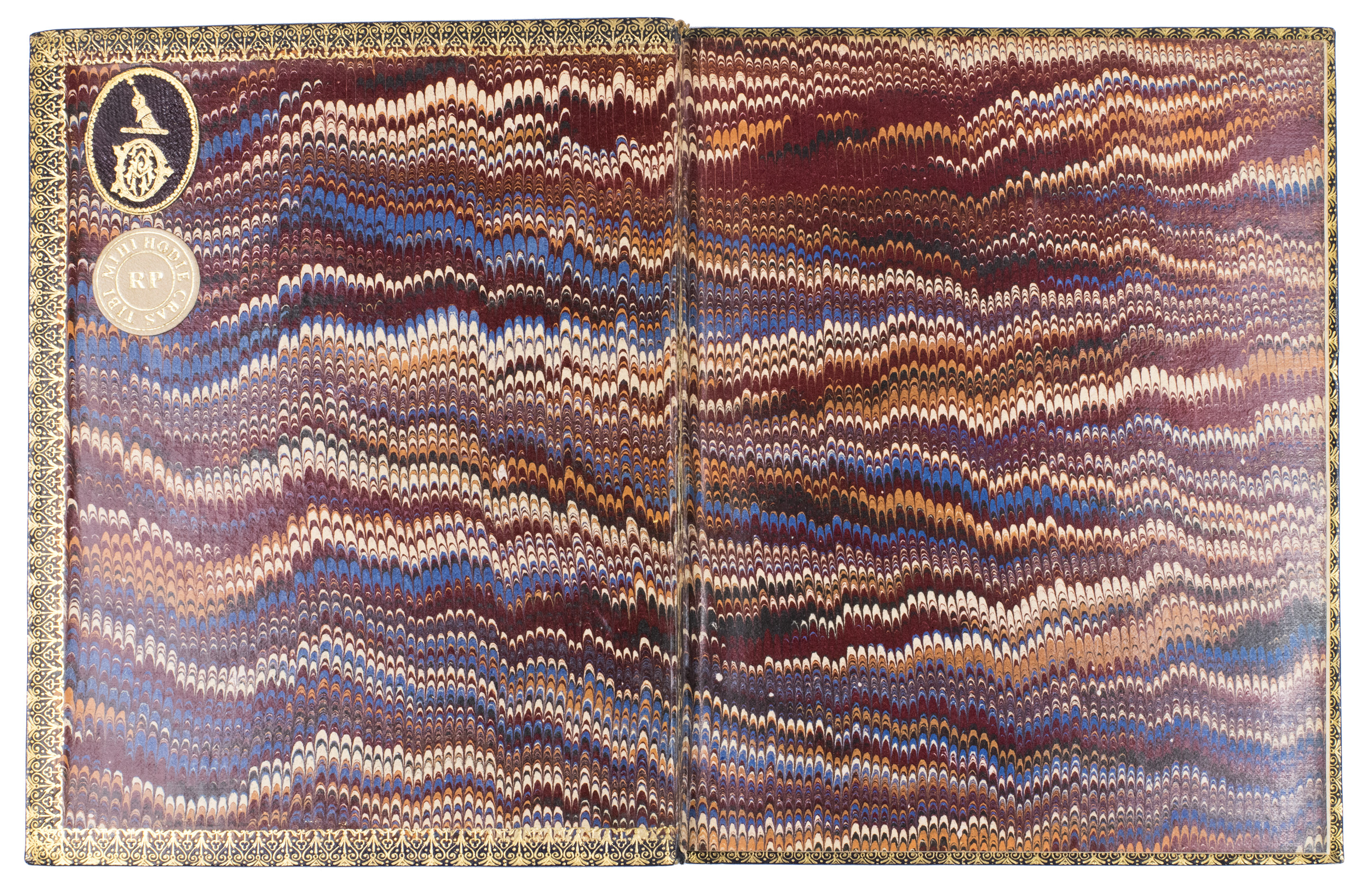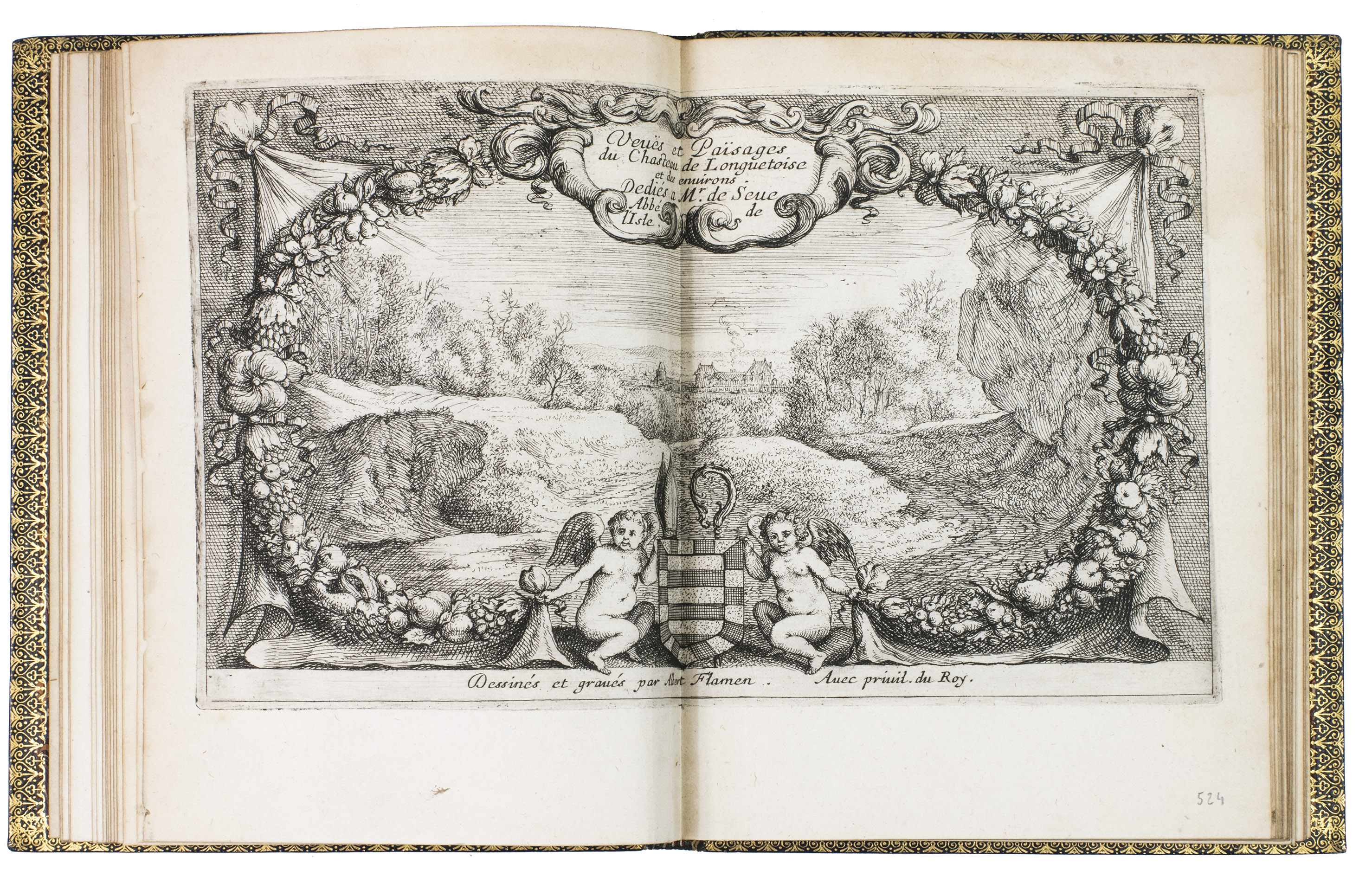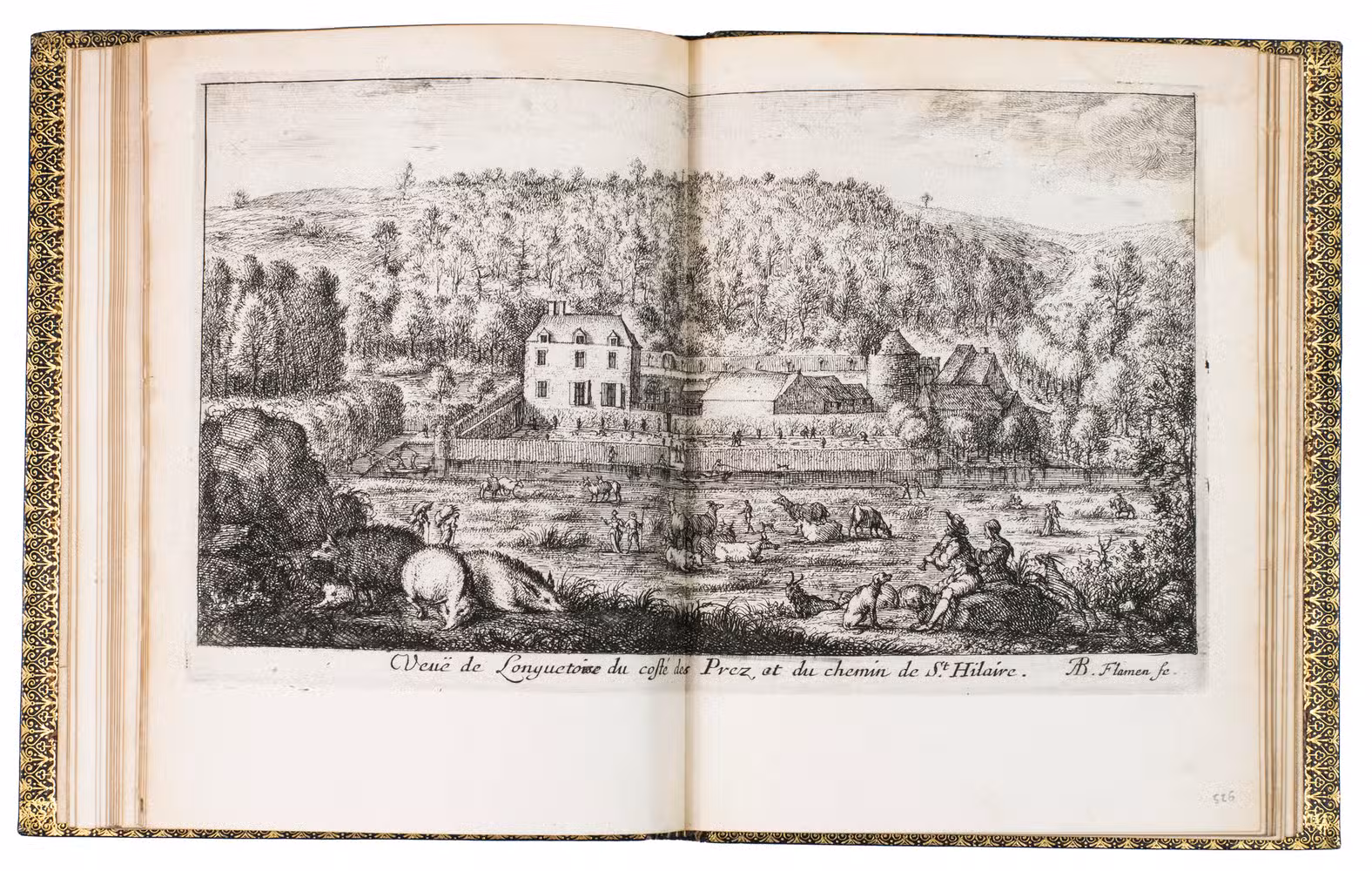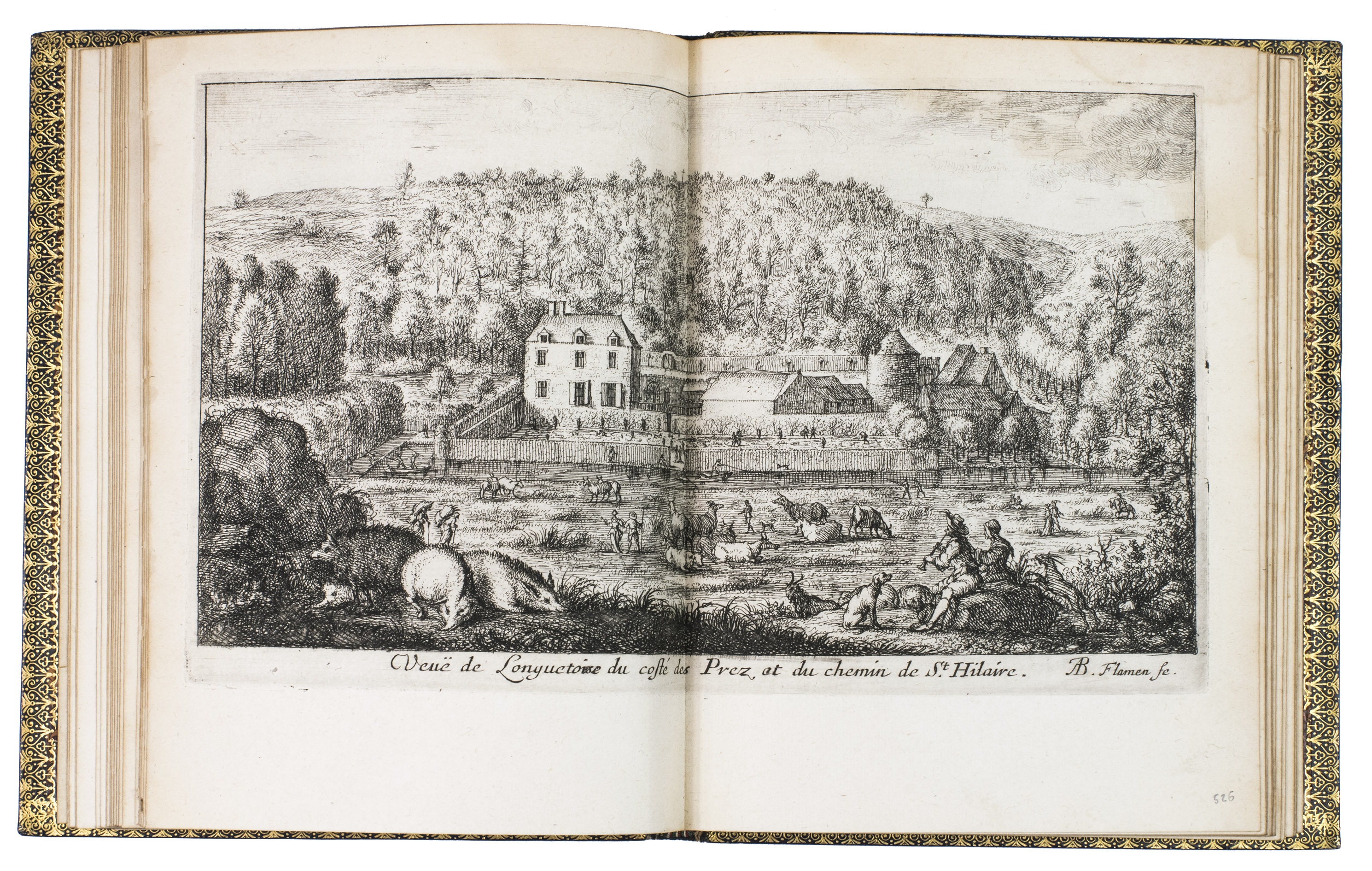 Paris, [Jacques Lagniet (ads 1, 3), Jacques van Merlen (ad 4), unknown publisher (ads 2, 5)], [ca. 1660]. Small 4to (16.5 x 13 cm). Five series of small oblong folio etched views (16 x 21.5-23 cm; plate size: 10 x 17 to 12.5 x 21.5 cm), 3 complete, 1 incomplete and 1 documented only as separate prints. Each print folded to form a double leaf and mounted on a stub so that it can open flat. Gold-tooled, dark green goatskin morocco (ca. 1890). [6]; [7]; [6 of 12]; 4; [2] etched ll.