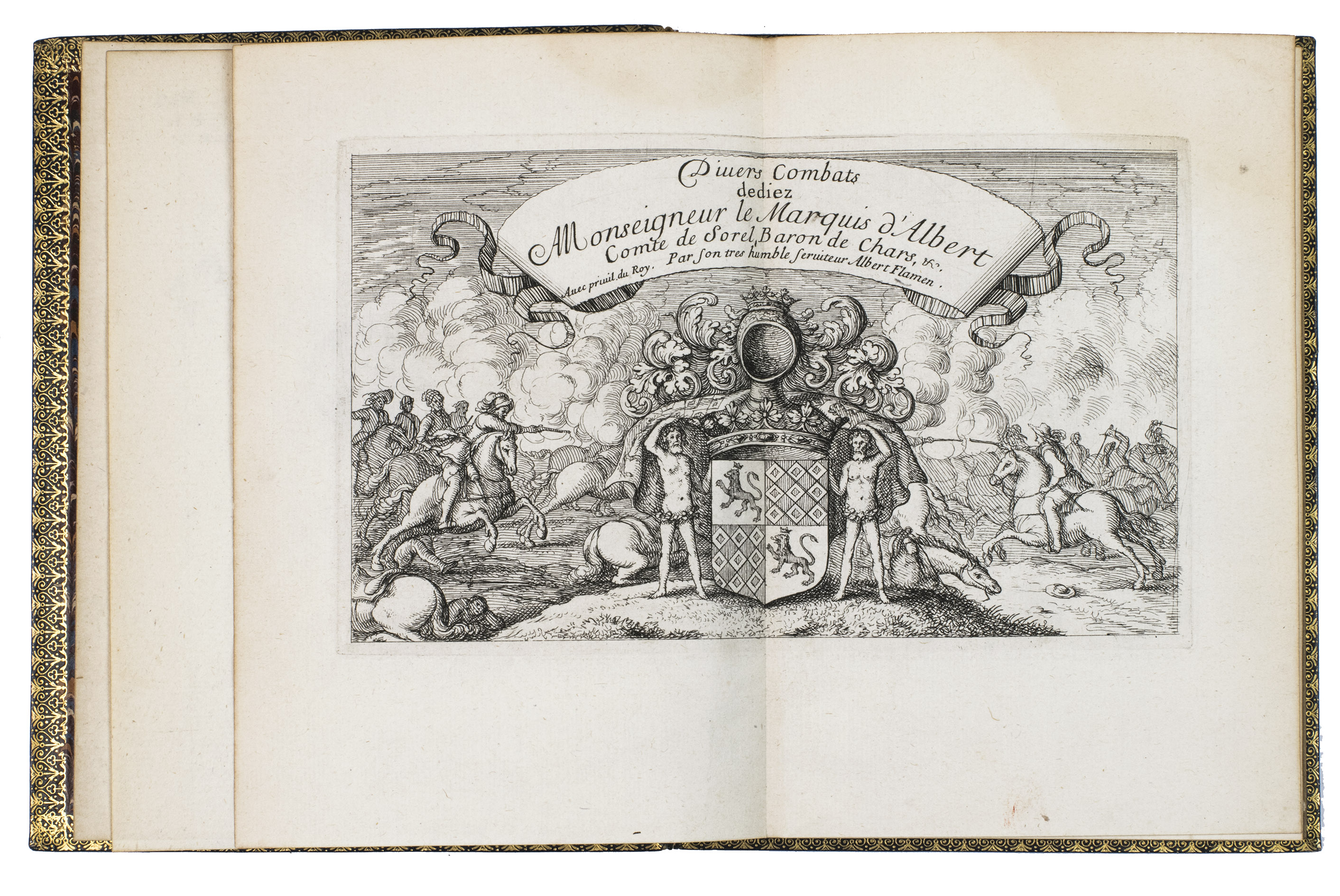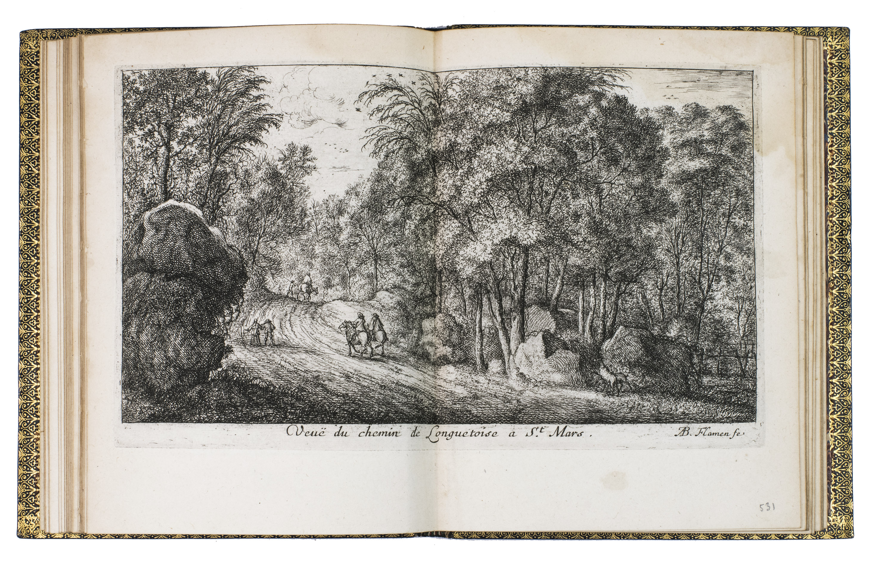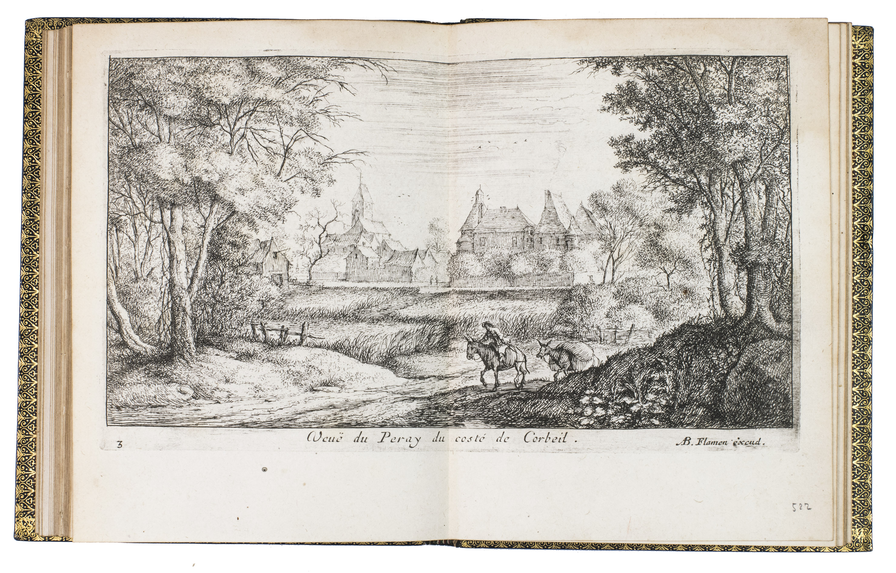 Five series of finely executed and well-printed etchings by Albert Flamen, mostly in their first states and all in early states, the five series showing: 1) cavalry fighting viewed from the thick of the battle; 2) wild and domestic animals on or around a farm; 3) views of Château de Longuetoise and its surroundings in Chalo-Saint-Mars, southwest of Paris; 4) views of several areas near Paris; and 5) pastoral views in an unidentified location. Flamen (ca. 1620?-1693 or soon after), a painter, draughtsman and etcher born in Bruges, worked in Paris from 1648 to 1692. He belonged to the French school of Callot and worked mostly after his own designs.