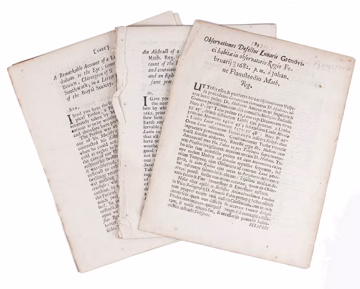 Three astronomical articles (2 in the form of letters) by England's first Royal Astronomer, John Flamsteed (1646-1719) at the Greenwich Observatory from its establishment in 1675, published in the Philosophical Transactions of the British Royal Society in the years 1683 and 1685. The first article gives observations of a 1682 lunar eclipse by Flamsteed himself, Edmund Halley and a certain Haynes. The second gives Flamsteed's calculations of the eclipses of Jupiter's four moons for the coming year 1686, intended in part as an aid to the determination of longitude. The third gives an engraved dial with four scales around its perimeter, with Flamsteed's description of its use to calculate the positions of Jupiter's moons..