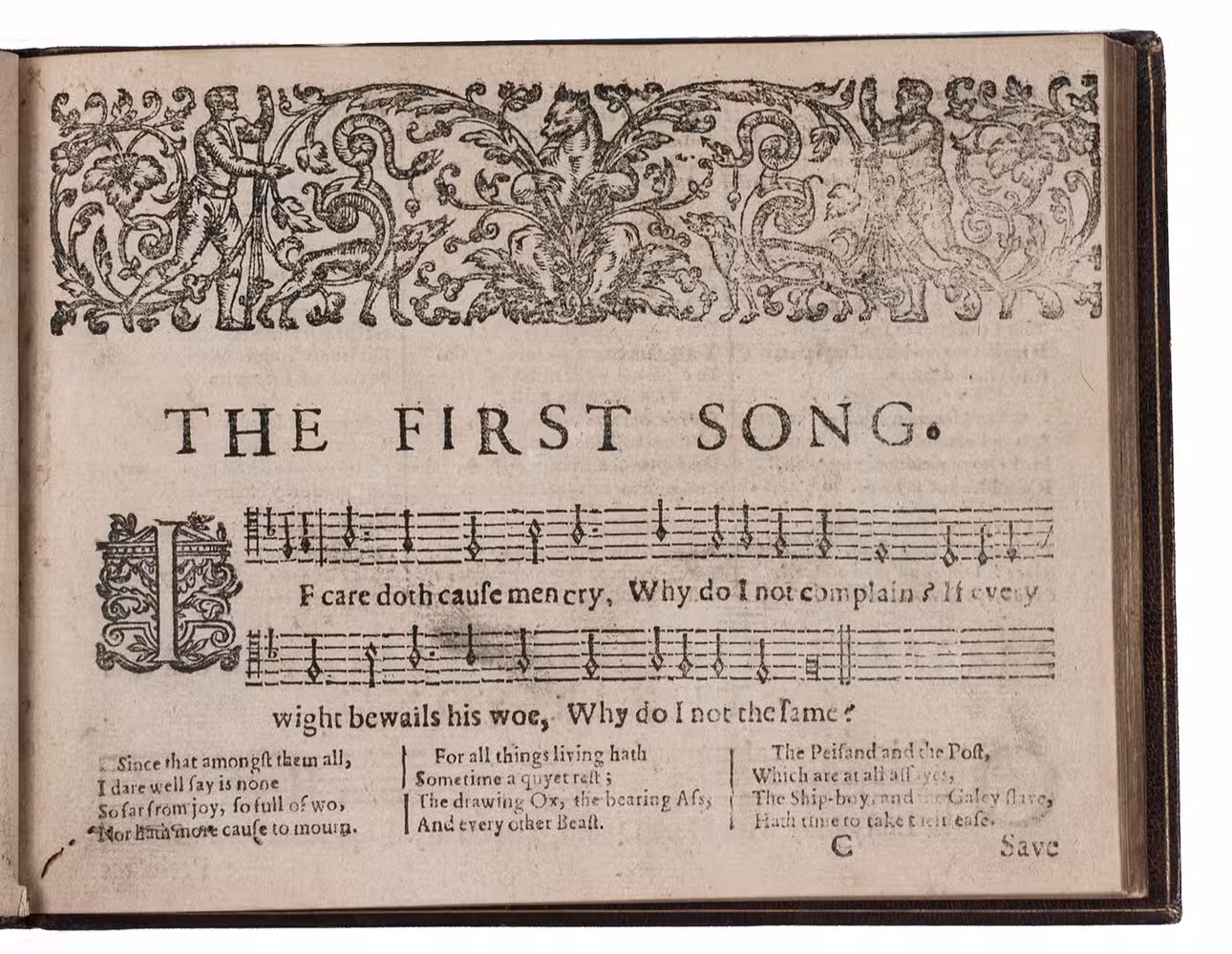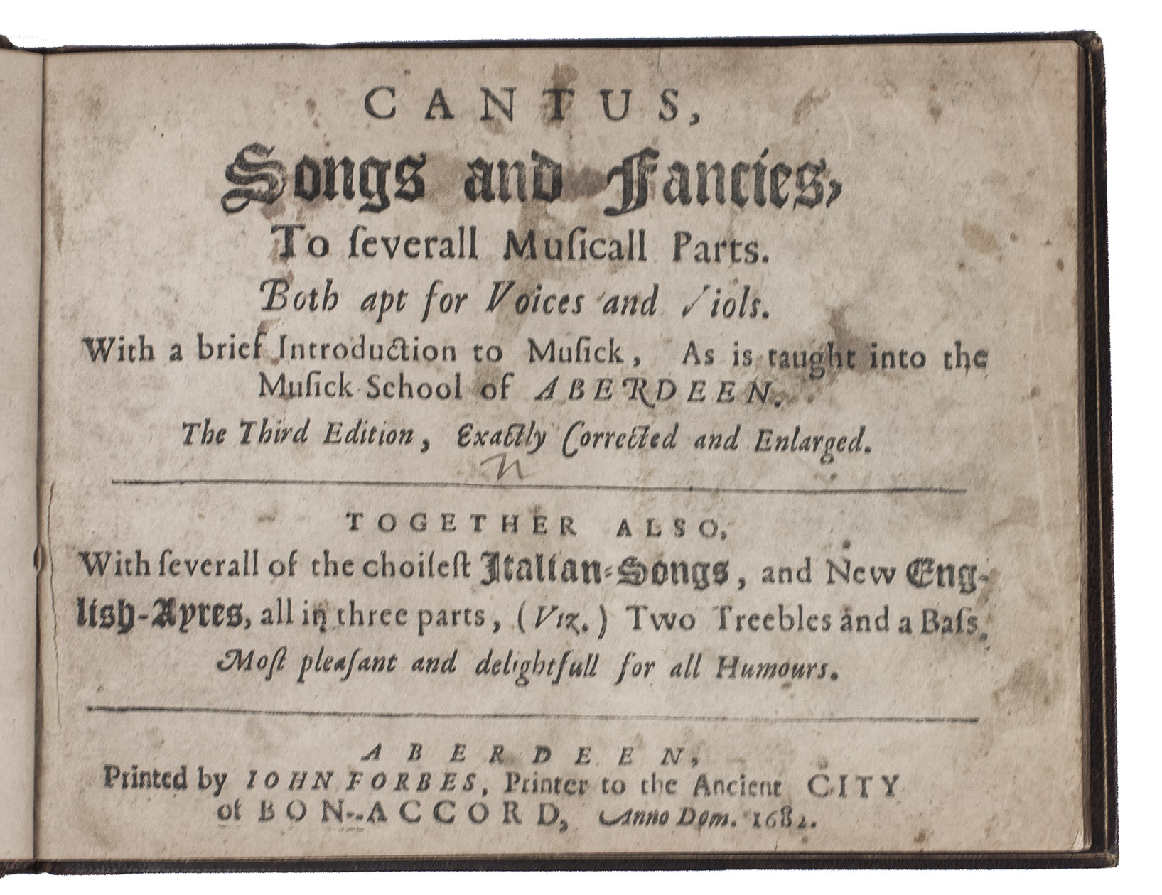 Enlarged and corrected third edition, one of two issues, of the earliest printed secular Scottish songbook, published by John Forbes, book and music printer at Aberdeen. "As the sole publication of secular music in Scotland during the entire sixteenth and seventeenth centuries, the three editions (1662, 1666 and 1682) of Cantus, songs and fancies by the Aberdeen printers John Forbes and son are of historical significance. ... the three editions present the 'cantus' voice of sixty-four songs, about a third of them unique to Scotland and nine found so far only in Songs and Fancies" (McLucas). Added to the present third edition are six "balletti" after Giovanni Giacomo Gastoldi (b.1555), and some popular English songs by Henry Lewis and Dr. Wilson.