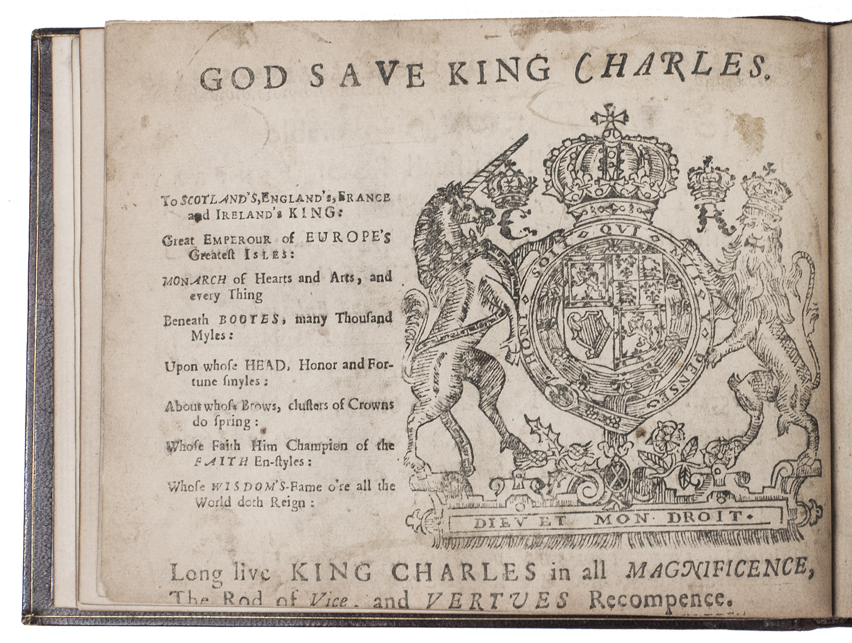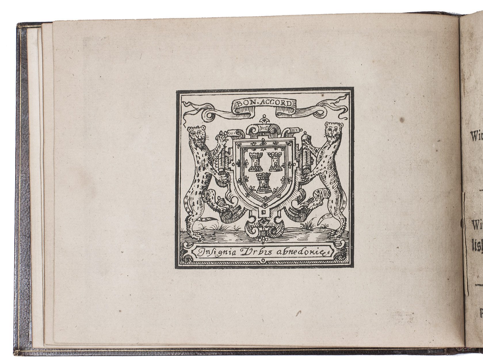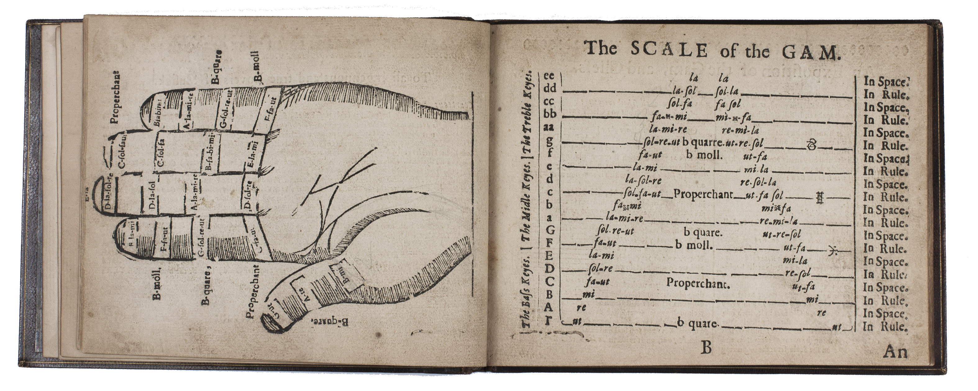 Aberdeen, John Forbes, 1682. Small oblong 4to (12.5 x 16 cm). With a facsimile woodcut title-page (with woodcut arms on the back), a general letterpress title-page (with the woodcut arms of King Charles Stuart on the back), a full-page woodcut of a human hand, and musical scores throughout. 19th-century brown morocco. [57] ll.